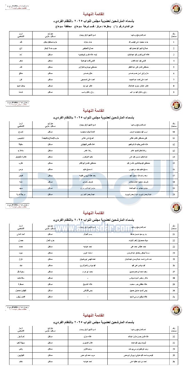 - القائمة النهائية بأسماء المترشحين لعضوية مجلس النواب 2025 "النظام الفردي" عن الدائرة رقم "7" ومقرها: مركز – قسم شرطة البلينا – محافظة سوهاج.