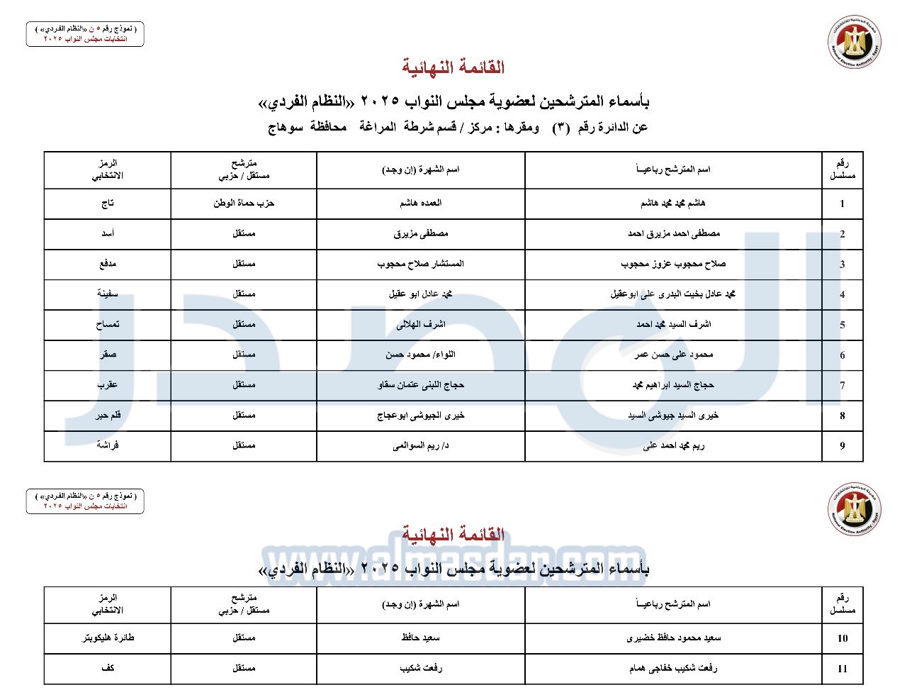 - القائمة النهائية بأسماء المترشحين لعضوية مجلس النواب 2025 "النظام الفردي" عن الدائرة رقم "3" ومقرها: مركز – قسم شرطة المراغة – محافظة سوهاج.