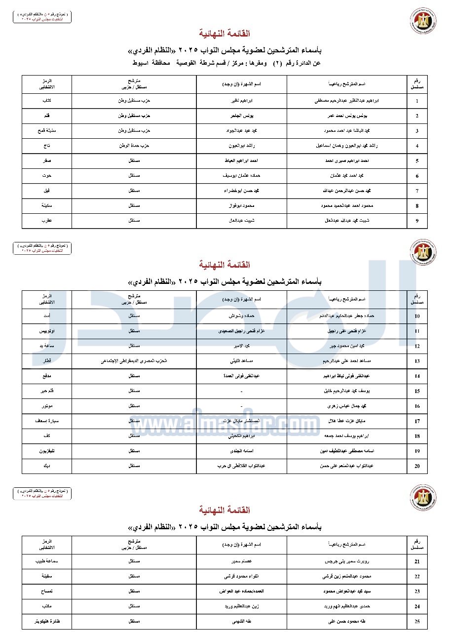 - القائمة النهائية بأسماء المترشحين لعضوية مجلس النواب 2025 "النظام الفردي" عن الدائرة رقم "3" ومقرها: مركز – قسم شرطة الفتح – محافظة أسيوط.