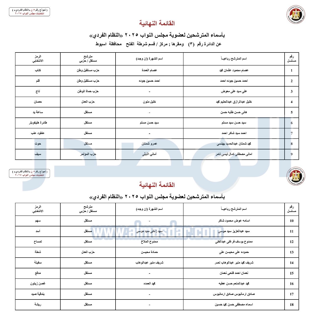 «المصدر» تنشر القائمة النهائية لمرشحي مجلس النواب عن النظام الفردى بمحافظة أسيوط