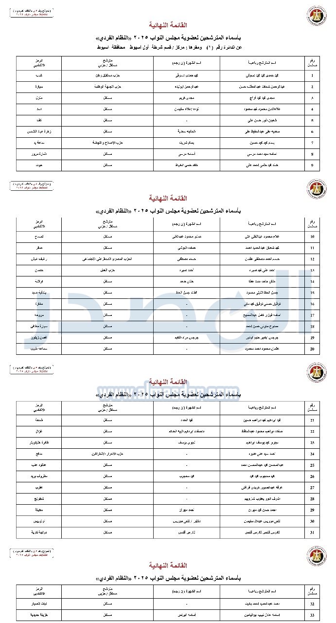 - القائمة النهائية بأسماء المترشحين لعضوية مجلس النواب 2025 "النظام الفردي" عن الدائرة رقم "1" ومقرها: مركز – قسم شرطة أول أسيوط – محافظة أسيوط.