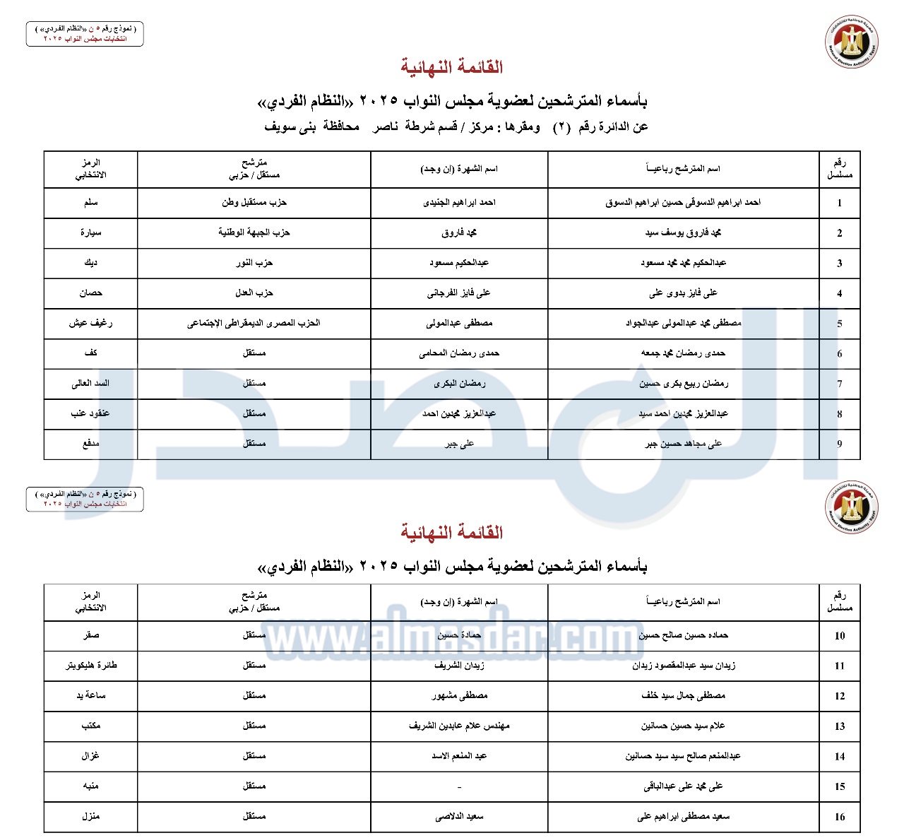 - القائمة النهائية بأسماء المترشحين لعضوية مجلس النواب 2025 "النظام الفردي" عن الدائرة رقم "2" ومقرها: مركز – قسم شرطة ناصر – محافظة بنى سويف.