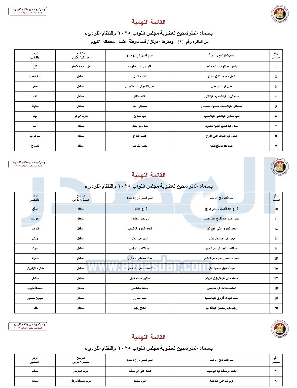 - القائمة النهائية بأسماء المترشحين لعضوية مجلس النواب 2025 "النظام الفردي" عن الدائرة رقم "3" ومقرها: مركز – قسم شرطة سنورس – محافظة بنى سويف.