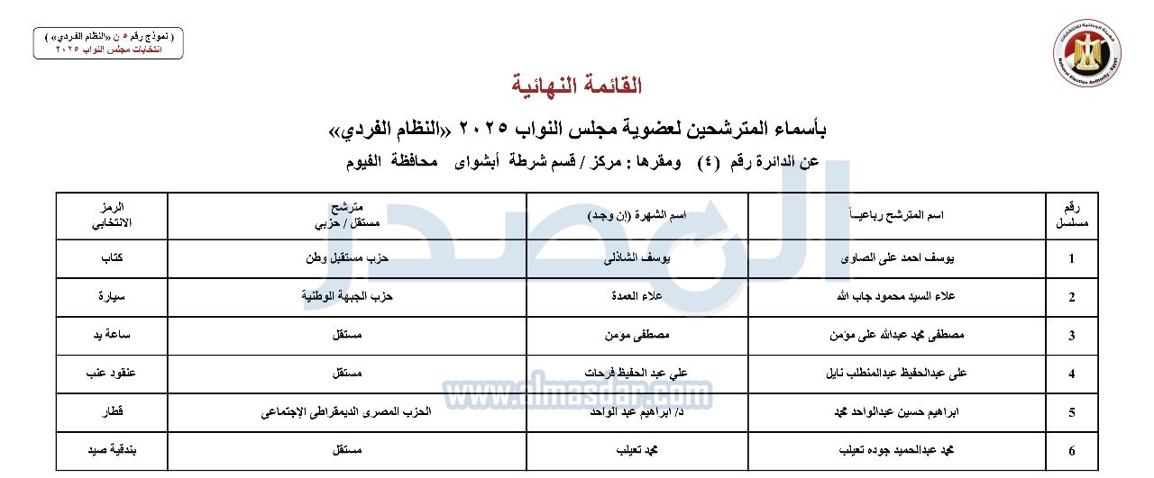- القائمة النهائية بأسماء المترشحين لعضوية مجلس النواب 2025 "النظام الفردي" عن الدائرة رقم "4" ومقرها: مركز – قسم شرطة أبشواى – محافظة بنى سويف.
