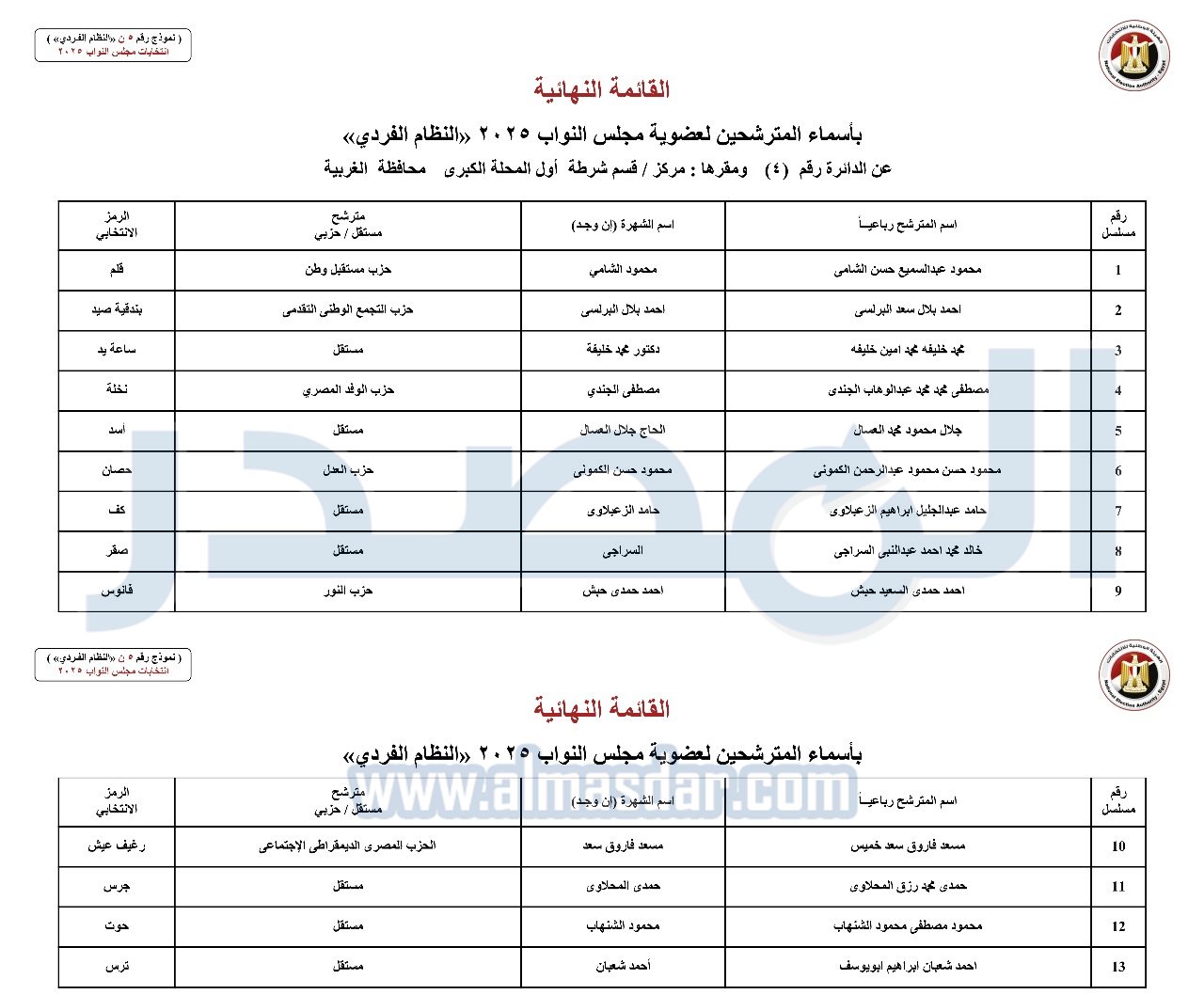 - القائمة النهائية بأسماء المترشحين لعضوية مجلس النواب 2025 "النظام الفردي" عن الدائرة رقم "4" ومقرها: مركز – قسم شرطة أول المحلة الكبرى – محافظة الغربية.