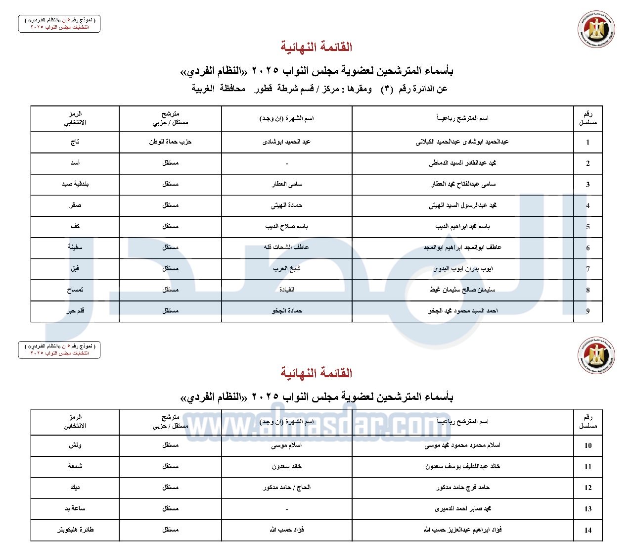 - القائمة النهائية بأسماء المترشحين لعضوية مجلس النواب 2025 "النظام الفردي" عن الدائرة رقم "3" ومقرها: مركز – قسم شرطة أول قطور – محافظة الغربية.