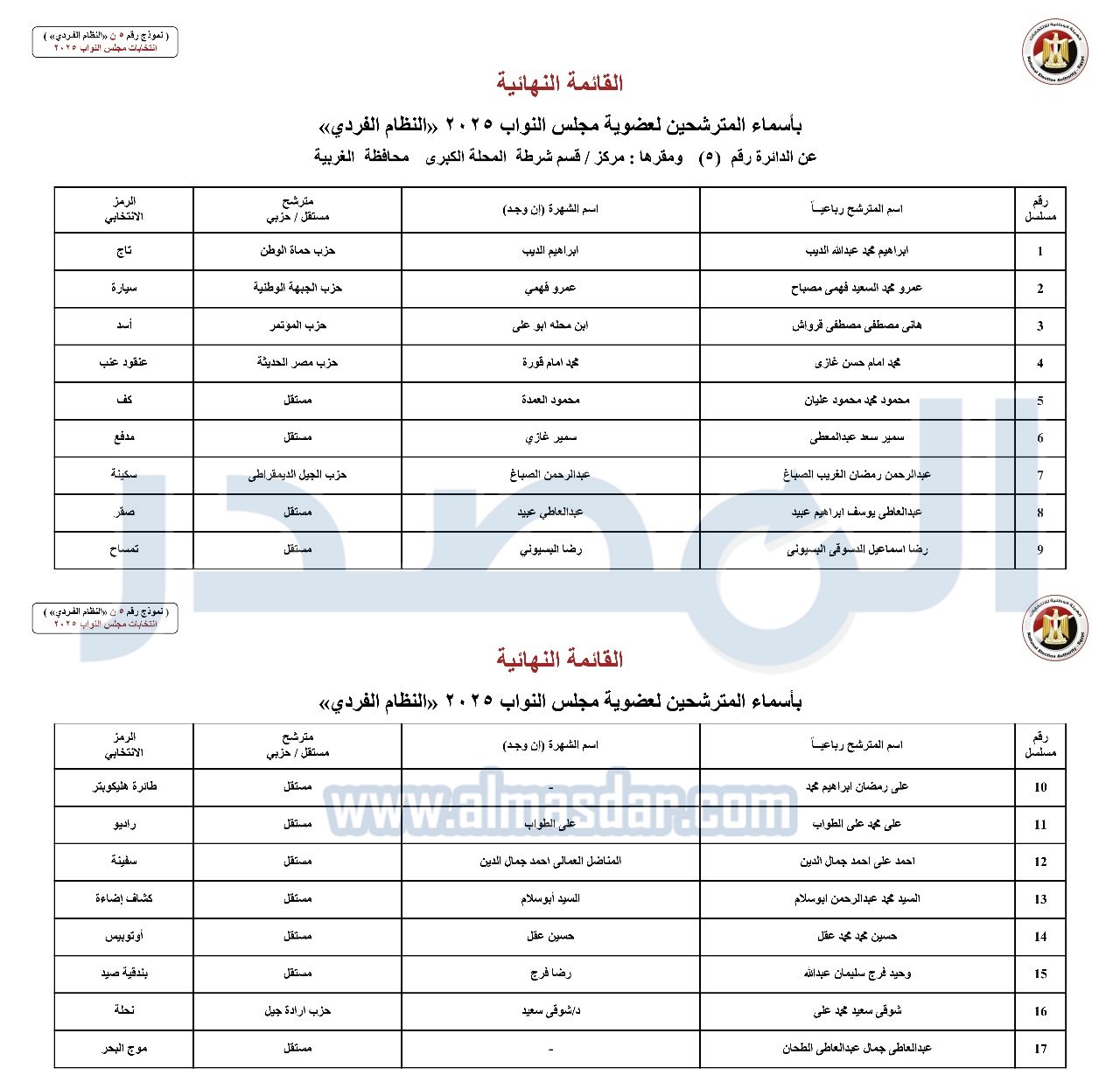- القائمة النهائية بأسماء المترشحين لعضوية مجلس النواب 2025 "النظام الفردي" عن الدائرة رقم "5" ومقرها: مركز – قسم شرطة المحلة الكبرى – محافظة الغربية.