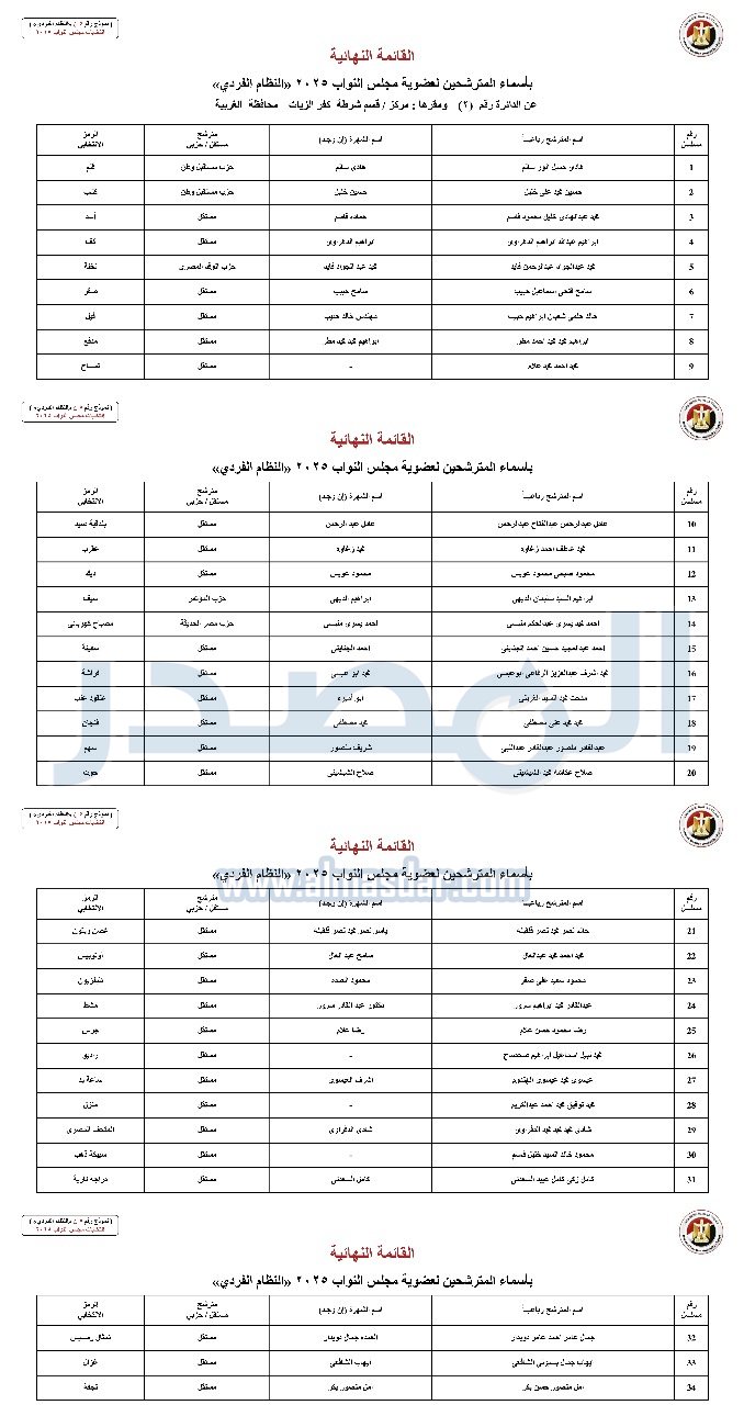 - القائمة النهائية بأسماء المترشحين لعضوية مجلس النواب 2025 "النظام الفردي" عن الدائرة رقم "2" ومقرها: مركز – قسم شرطة كفر الزيات – محافظة الغربية.