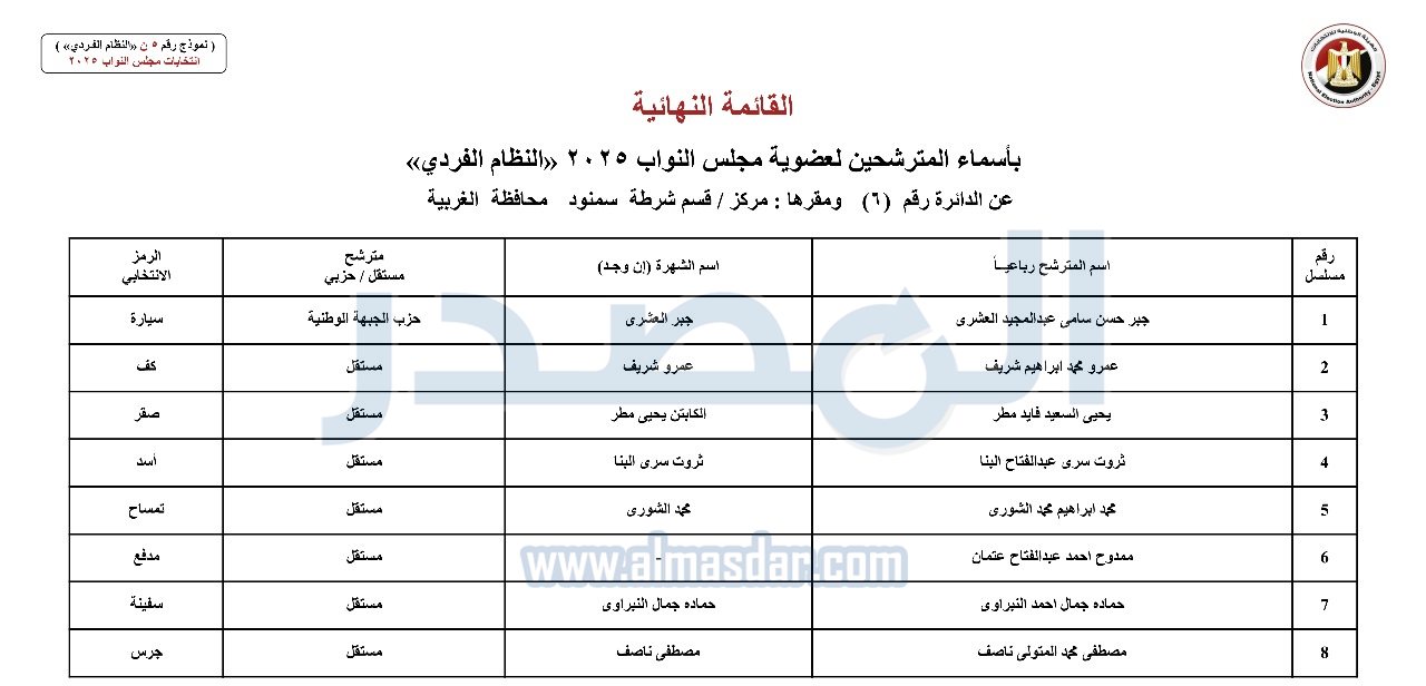 - القائمة النهائية بأسماء المترشحين لعضوية مجلس النواب 2025 "النظام الفردي" عن الدائرة رقم "6" ومقرها: مركز – قسم شرطة سمنود – محافظة الغربية.