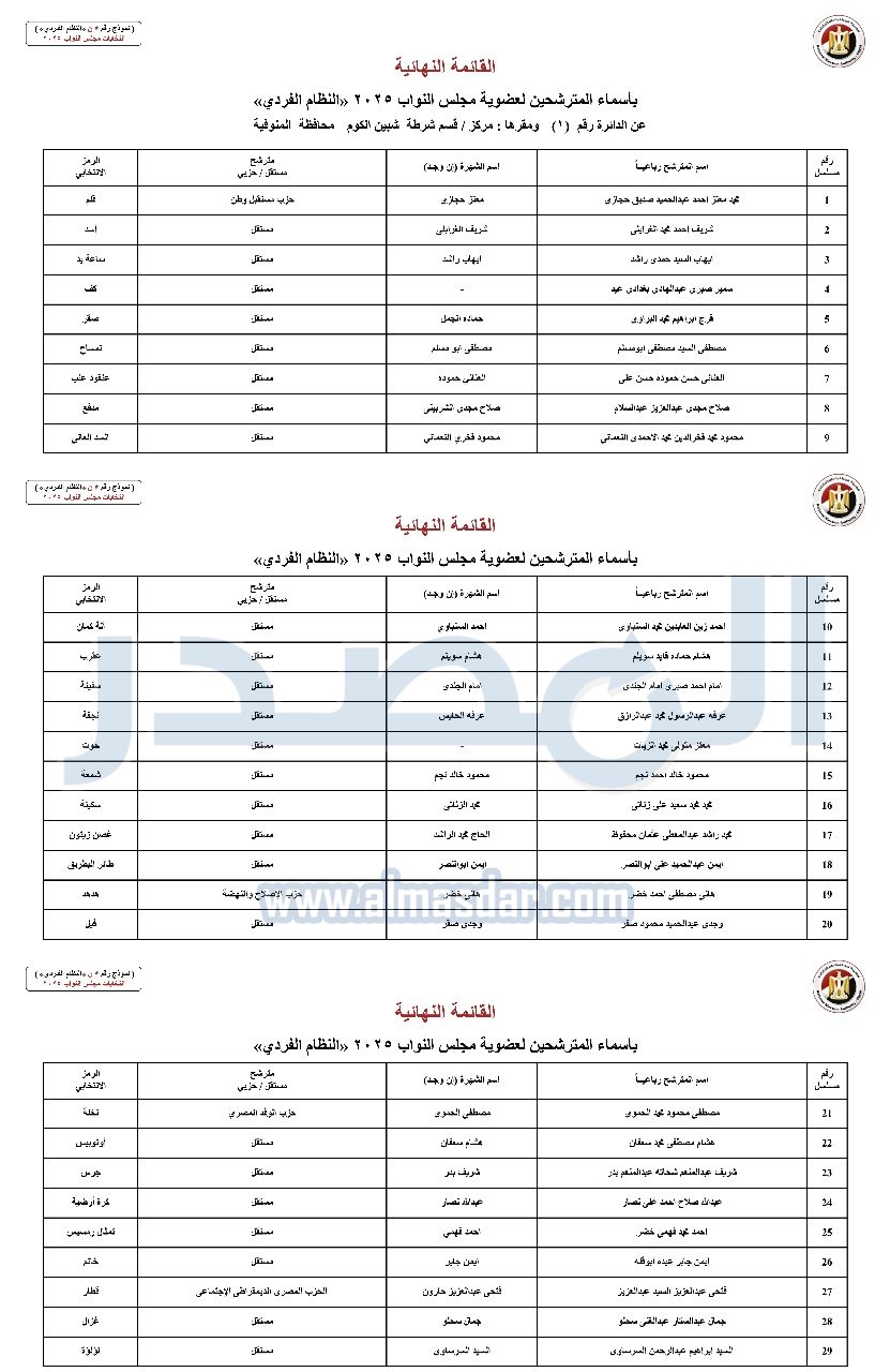 أعلنت اللجنة العليا للانتخابات القائمة النهائية لمترشحي دوائر محافظة المنوفية عن النظام الفردي.