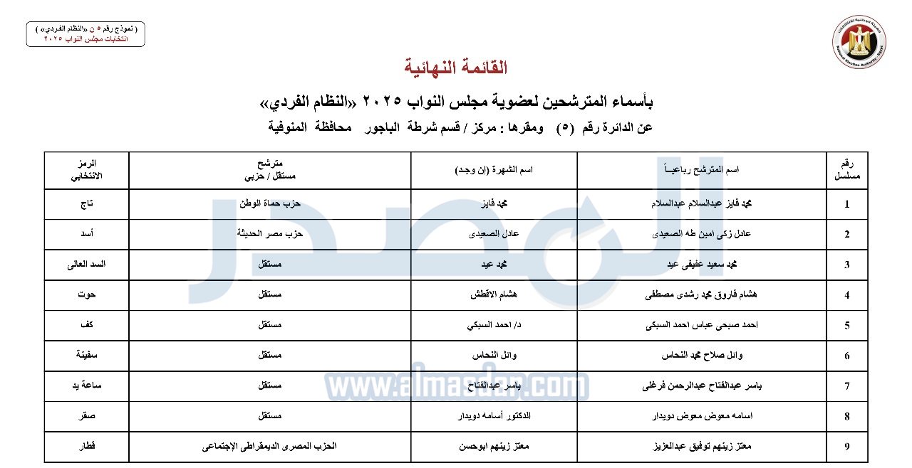 - القائمة النهائية بأسماء المترشحين لعضوية مجلس النواب 2025 "النظام الفردي" عن الدائرة رقم "5" ومقرها: مركز – قسم شرطة الباجور – محافظة المنوفية.