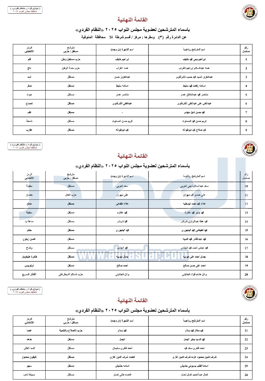- القائمة النهائية بأسماء المترشحين لعضوية مجلس النواب 2025 "النظام الفردي" عن الدائرة رقم "3" ومقرها: مركز – قسم شرطة تلا – محافظة المنوفية.
