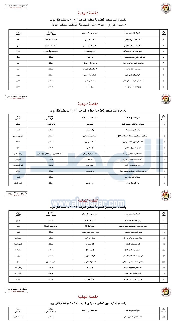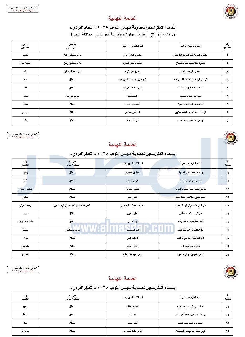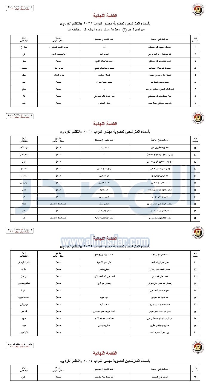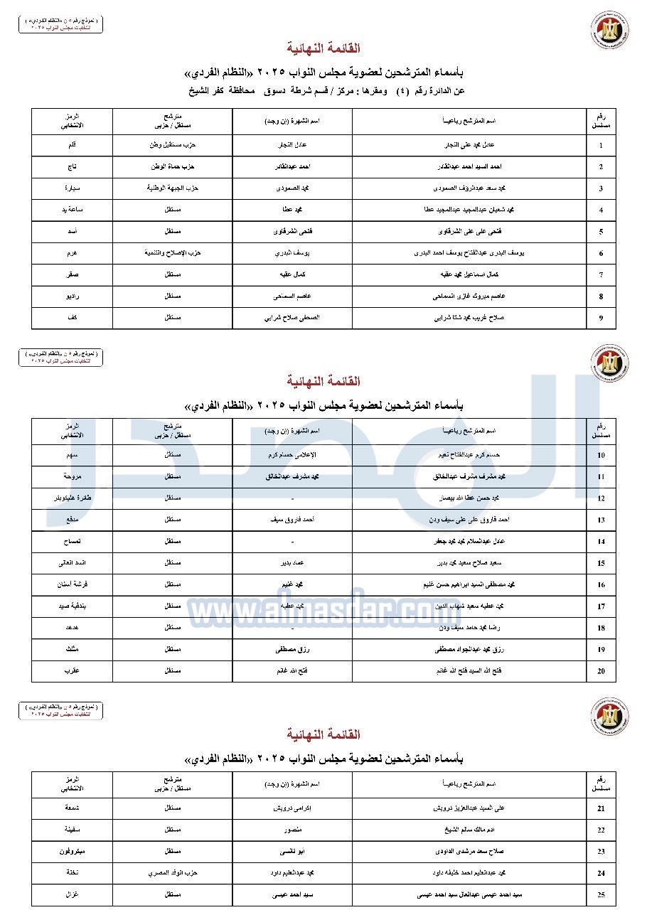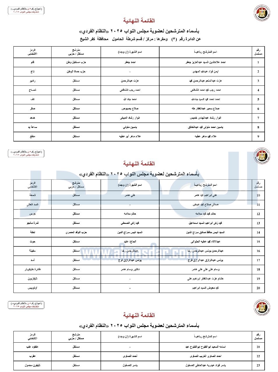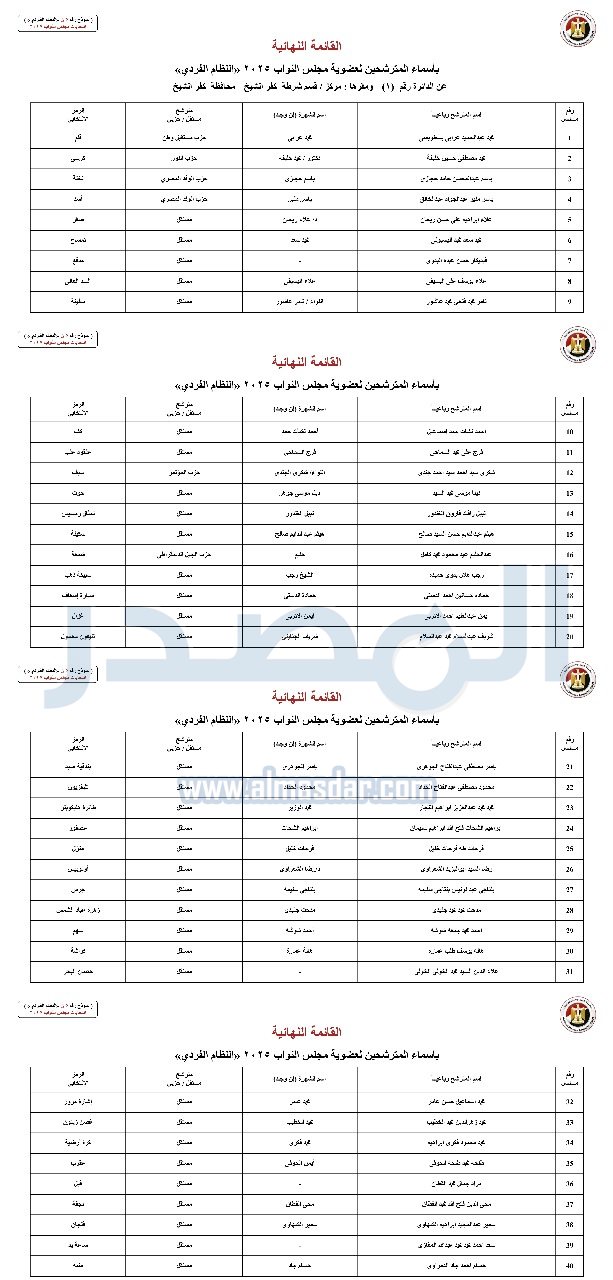 وتضم تلك الكشوف النهائية أسماء جميع المرشحين الذين استوفوا الشروط القانونية للترشح على النظام الفردي، في الدوائر الانتخابية المختلفة على مستوى الجمهورية.