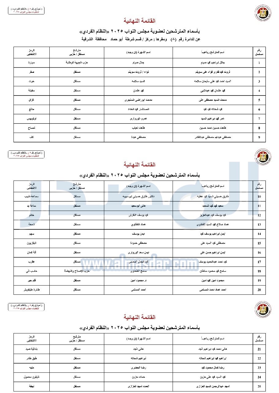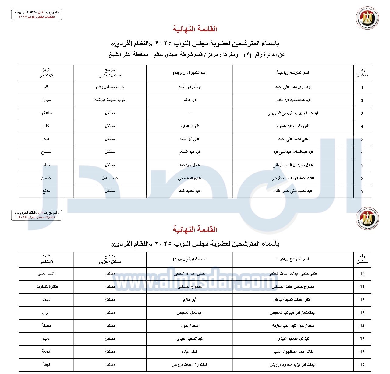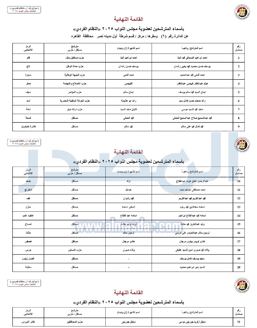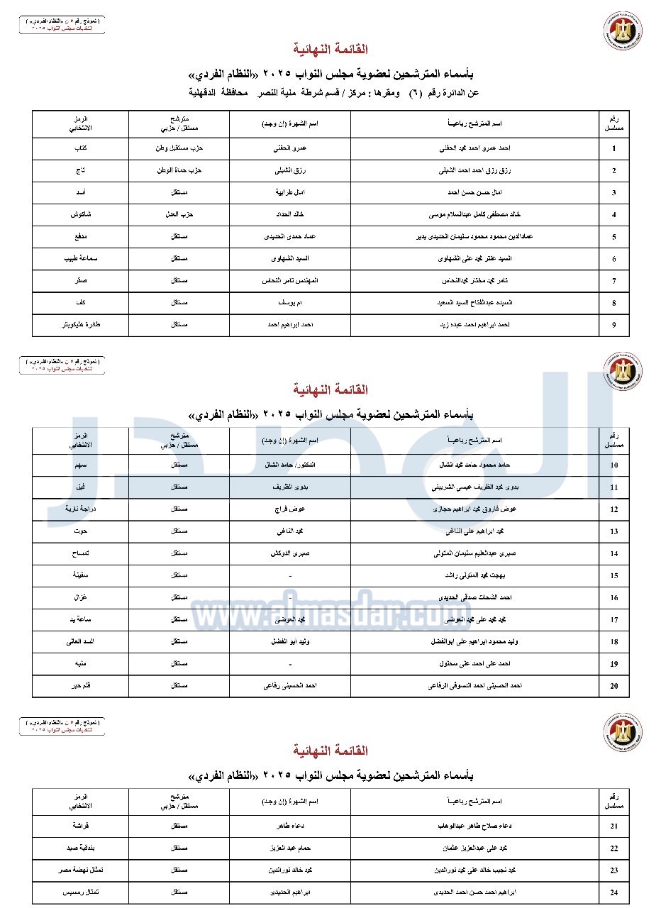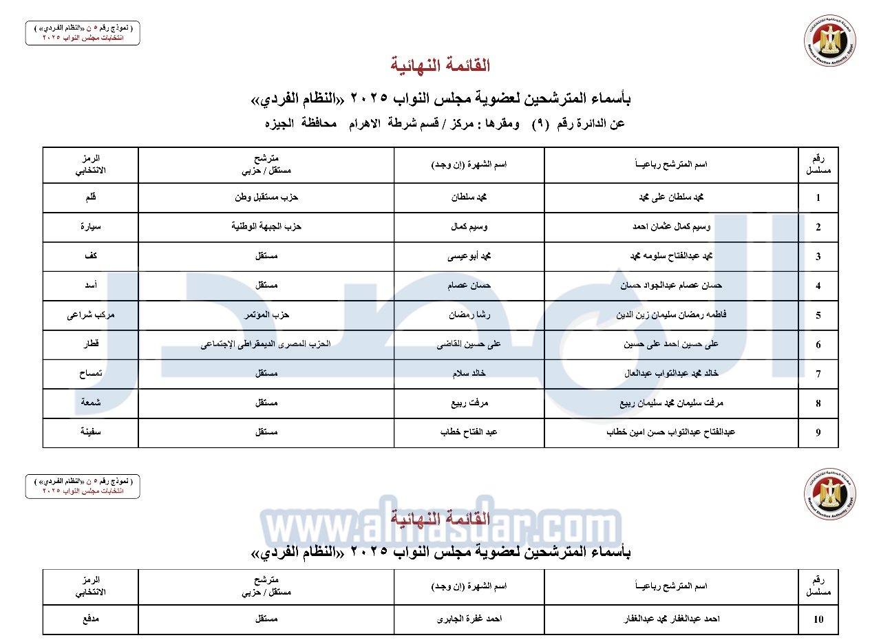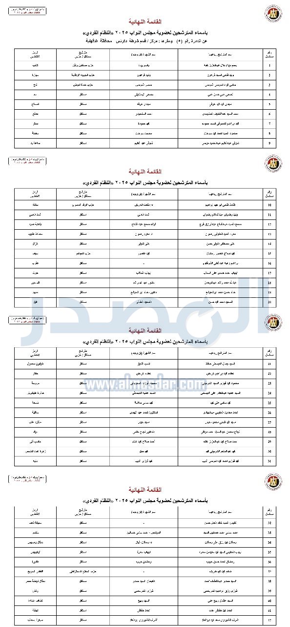 وتضم تلك الكشوف النهائية أسماء جميع المرشحين الذين استوفوا الشروط القانونية للترشح على النظام الفردي، في الدوائر الانتخابية المختلفة على مستوى الجمهورية.
