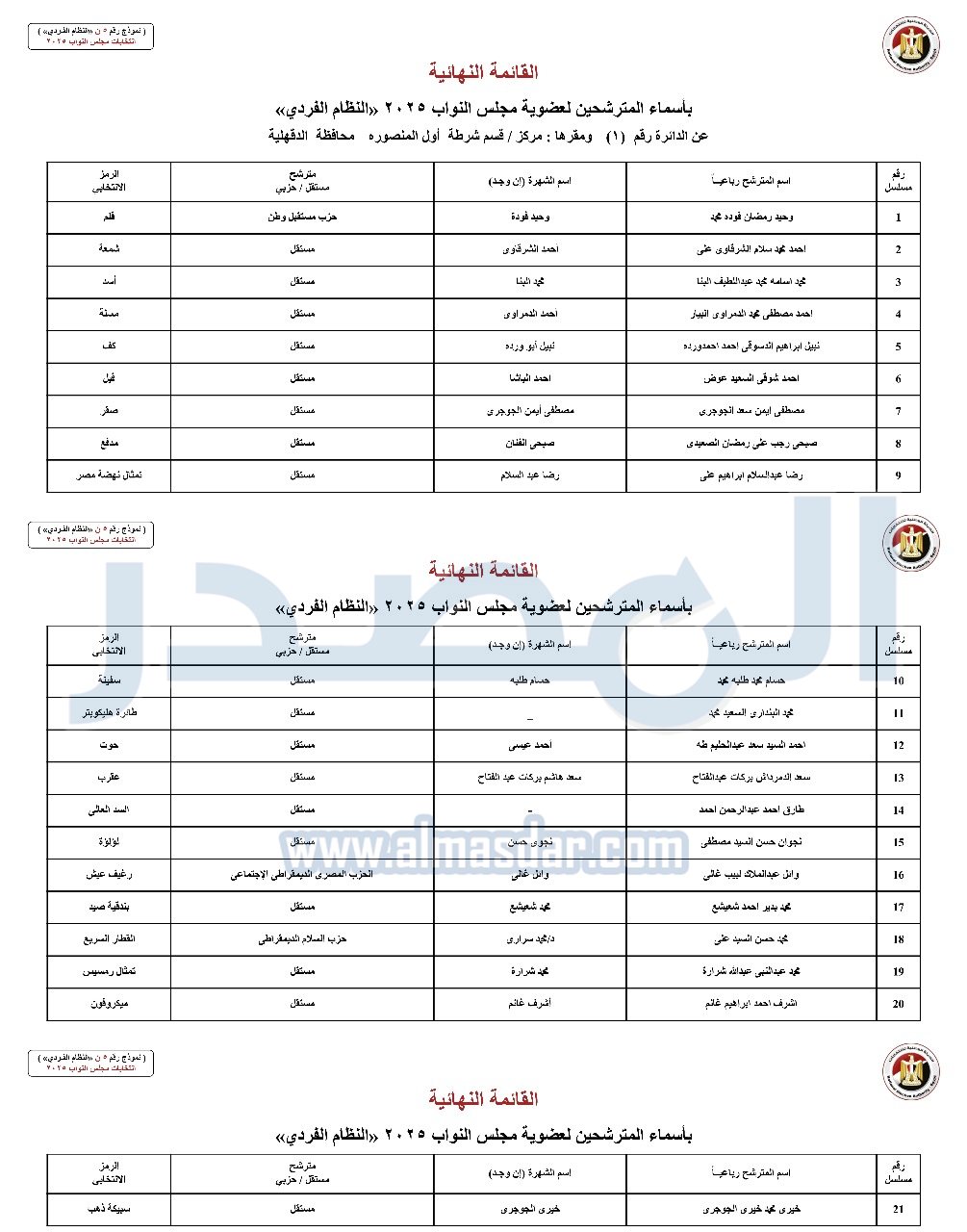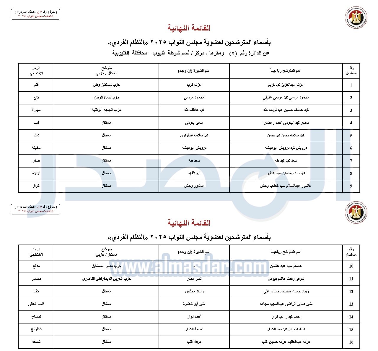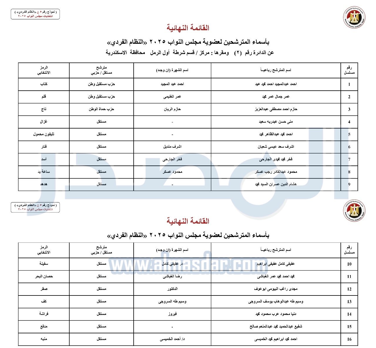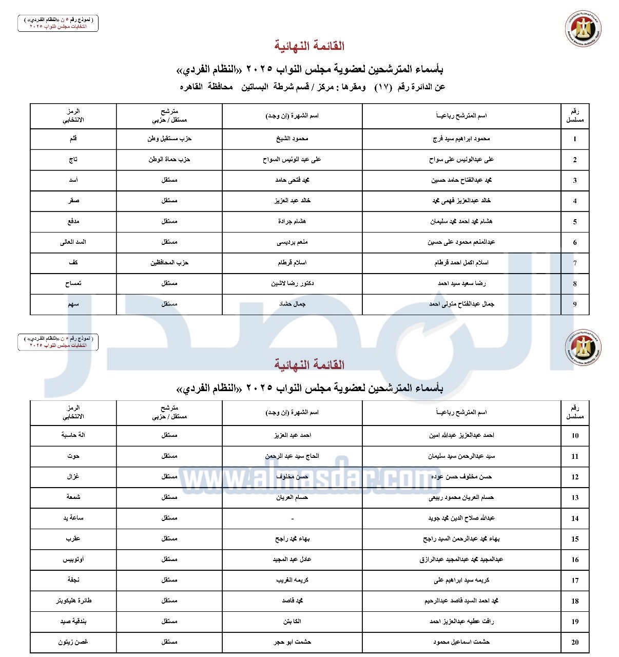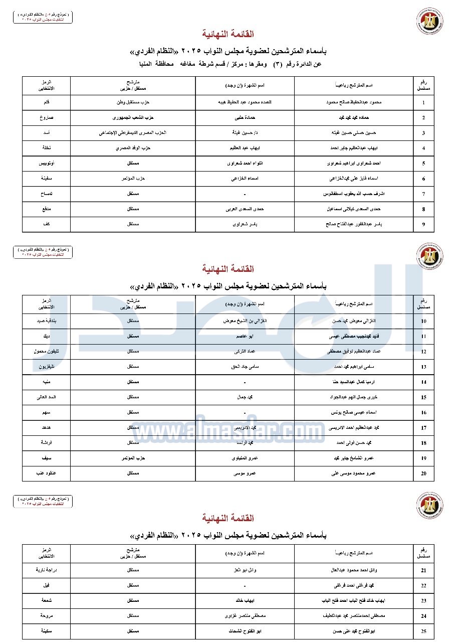 وتضم تلك الكشوف النهائية أسماء جميع المرشحين الذين استوفوا الشروط القانونية للترشح على النظام الفردي، في الدوائر الانتخابية المختلفة على مستوى الجمهورية.
