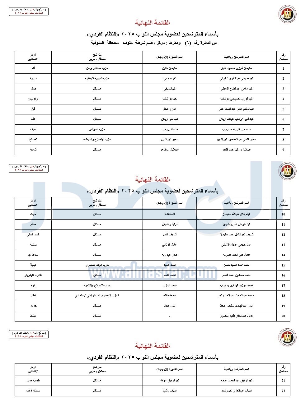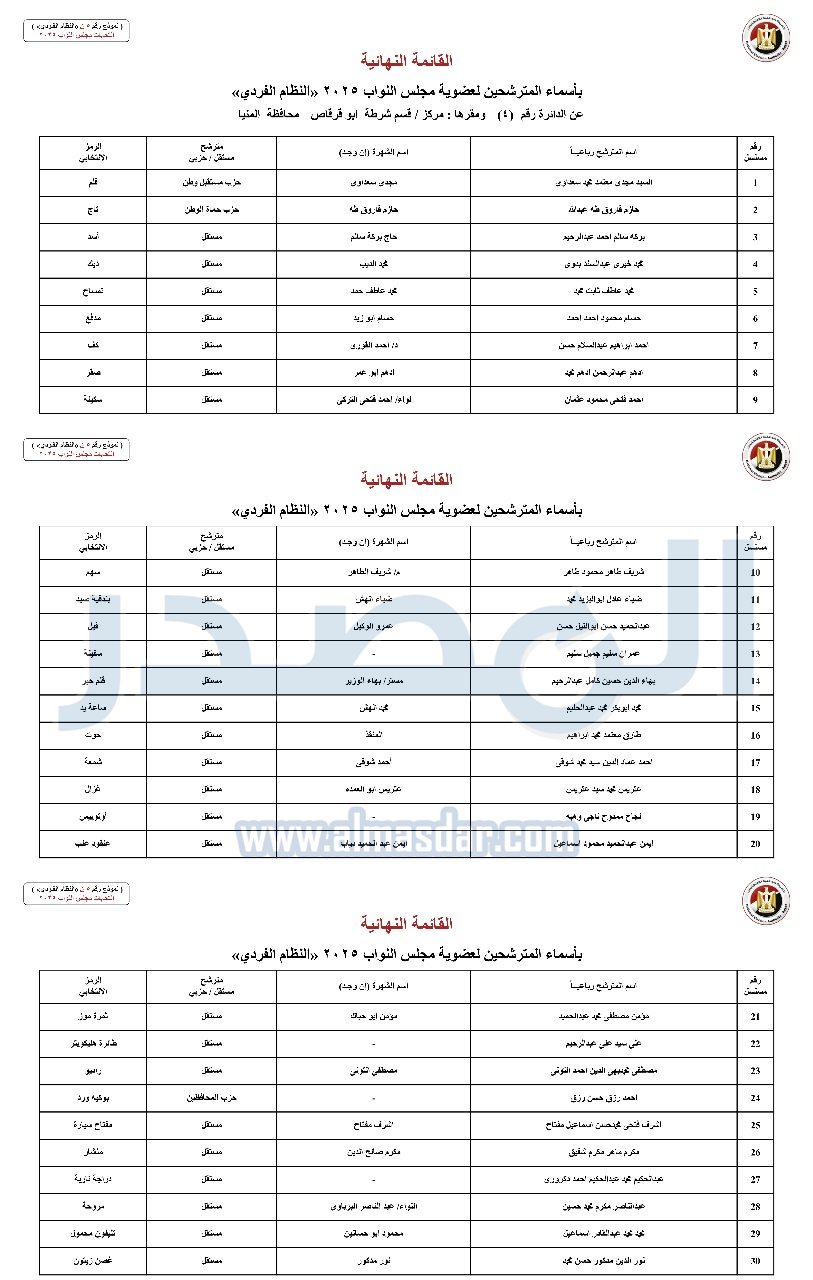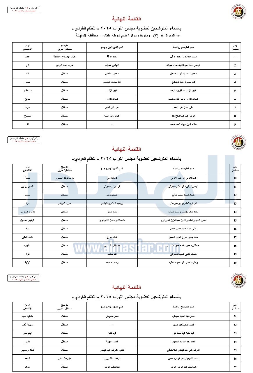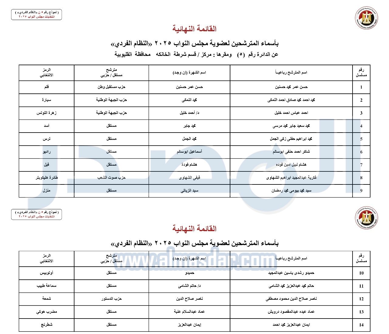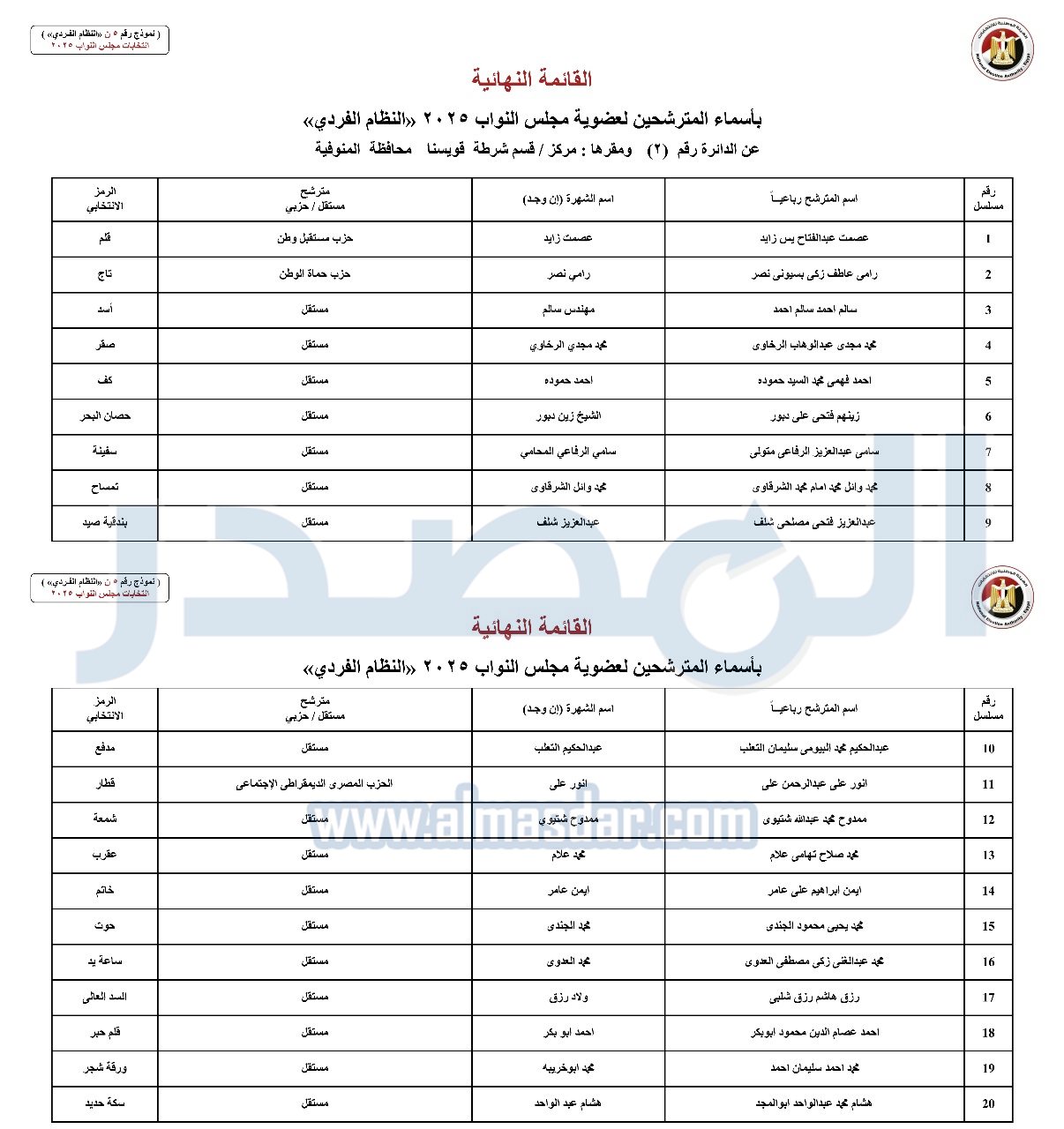 وتضم تلك الكشوف النهائية أسماء جميع المرشحين الذين استوفوا الشروط القانونية للترشح على النظام الفردي، في الدوائر الانتخابية المختلفة على مستوى الجمهورية.