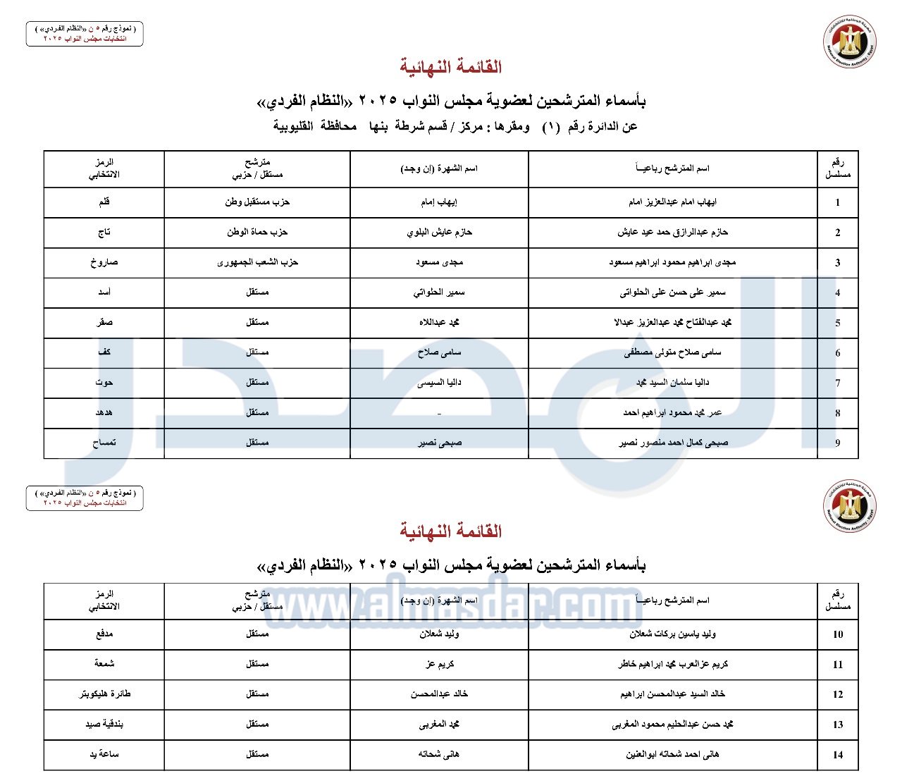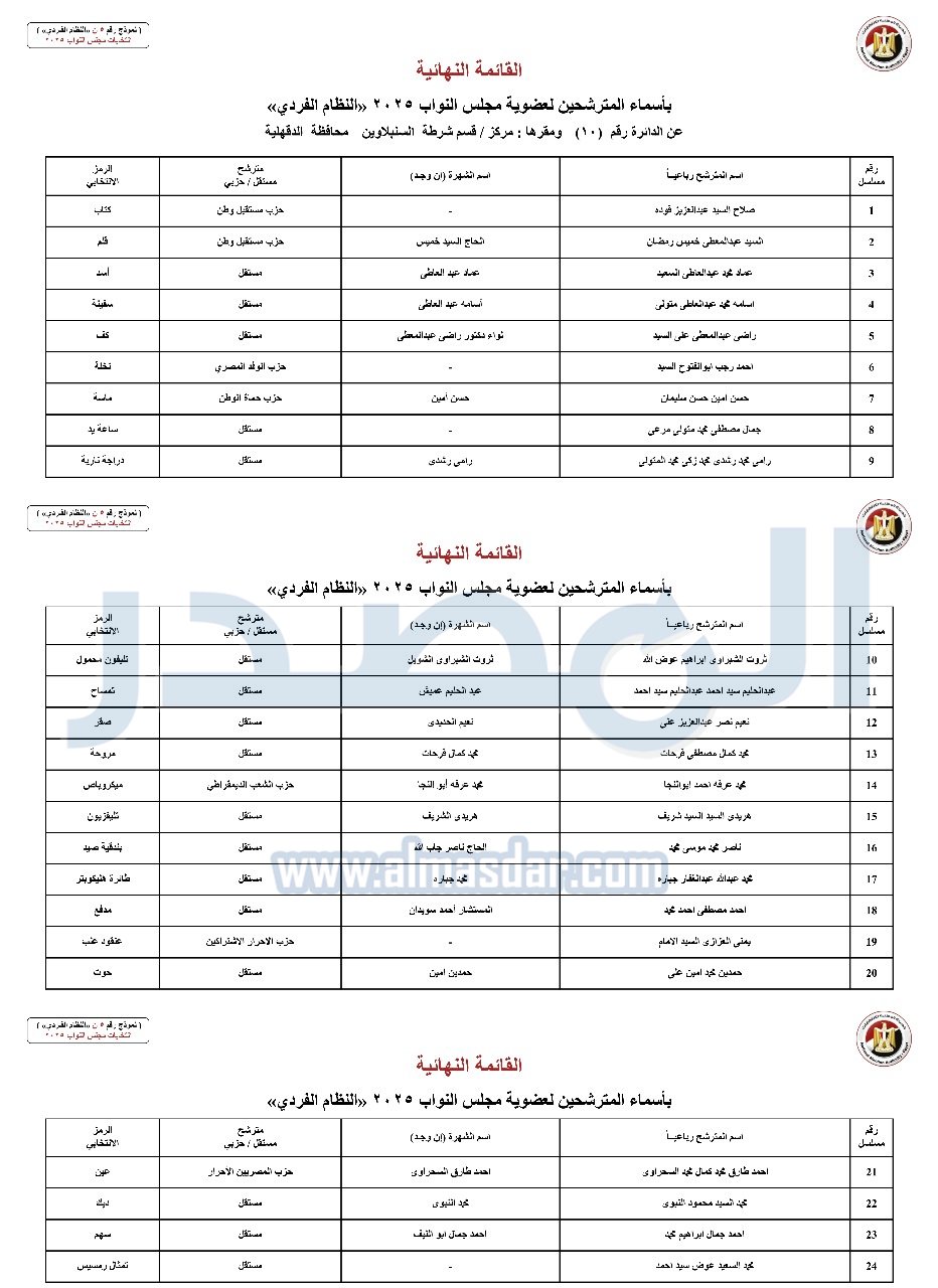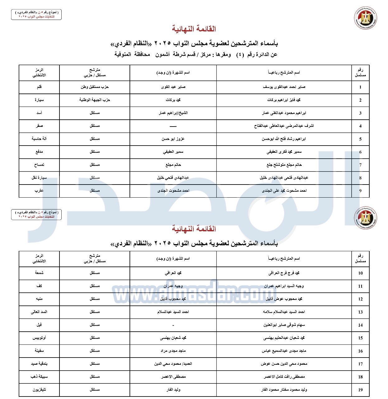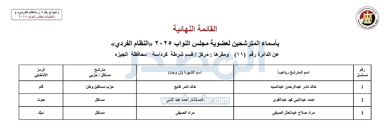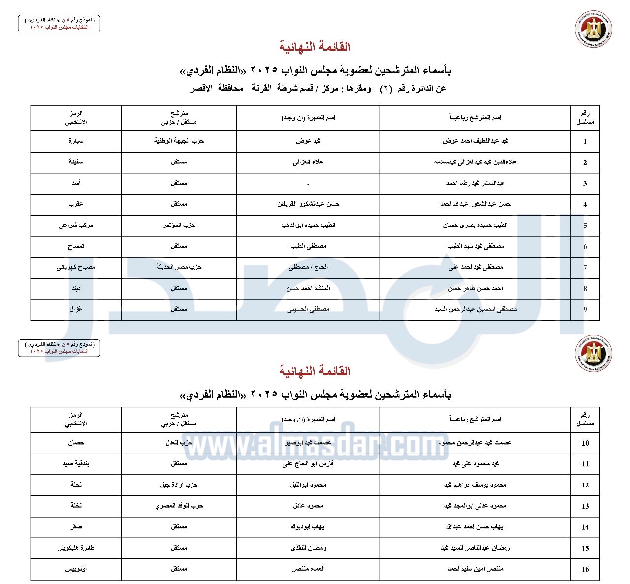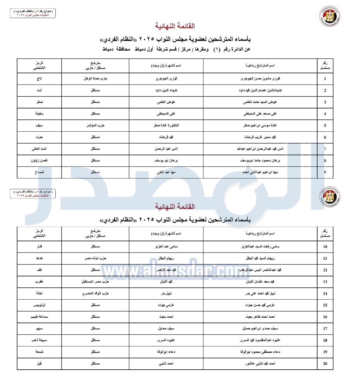 وتضم تلك الكشوف النهائية أسماء جميع المرشحين الذين استوفوا الشروط القانونية للترشح على النظام الفردي، في الدوائر الانتخابية المختلفة على مستوى الجمهورية.