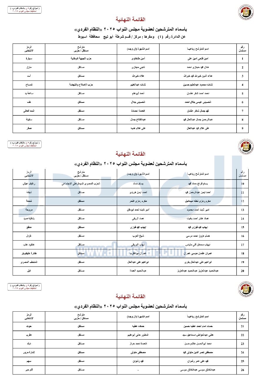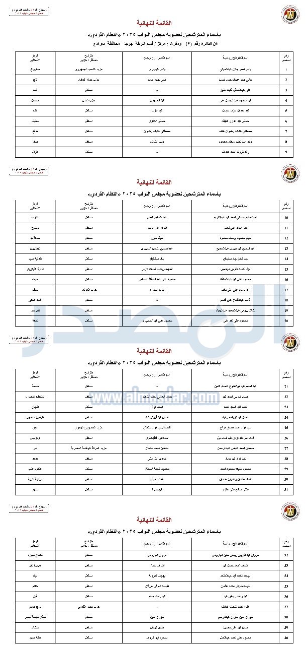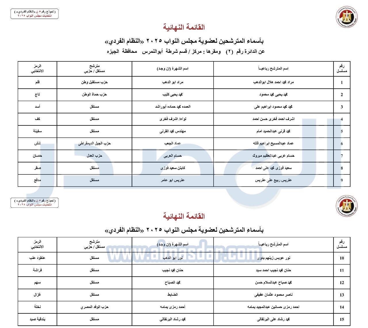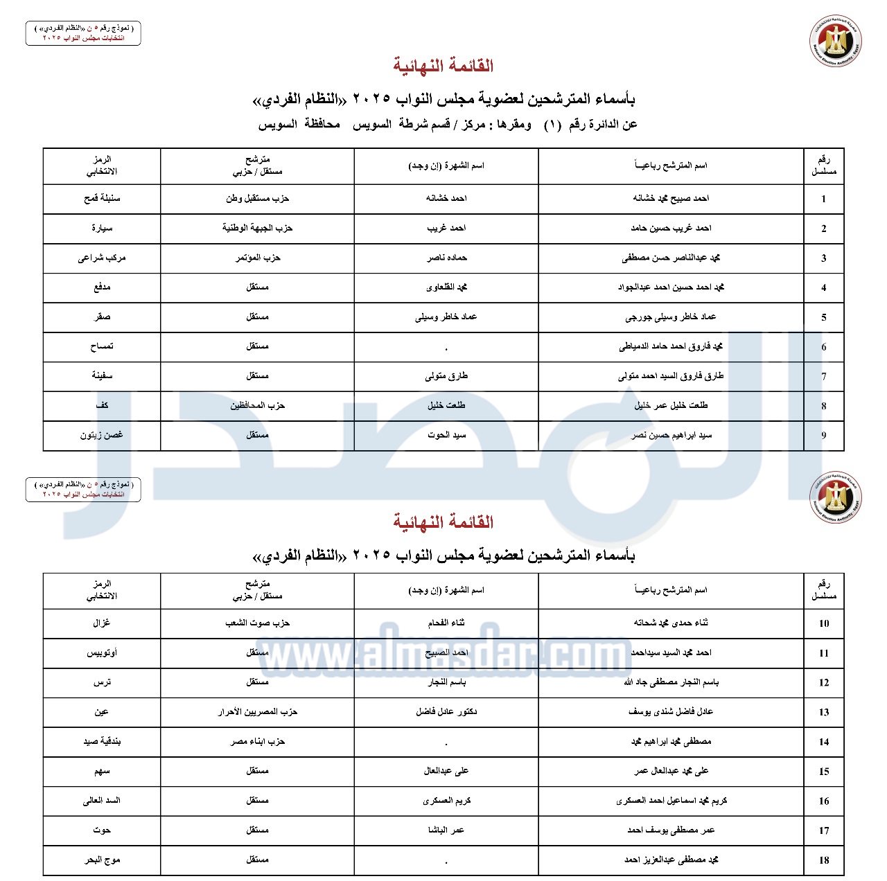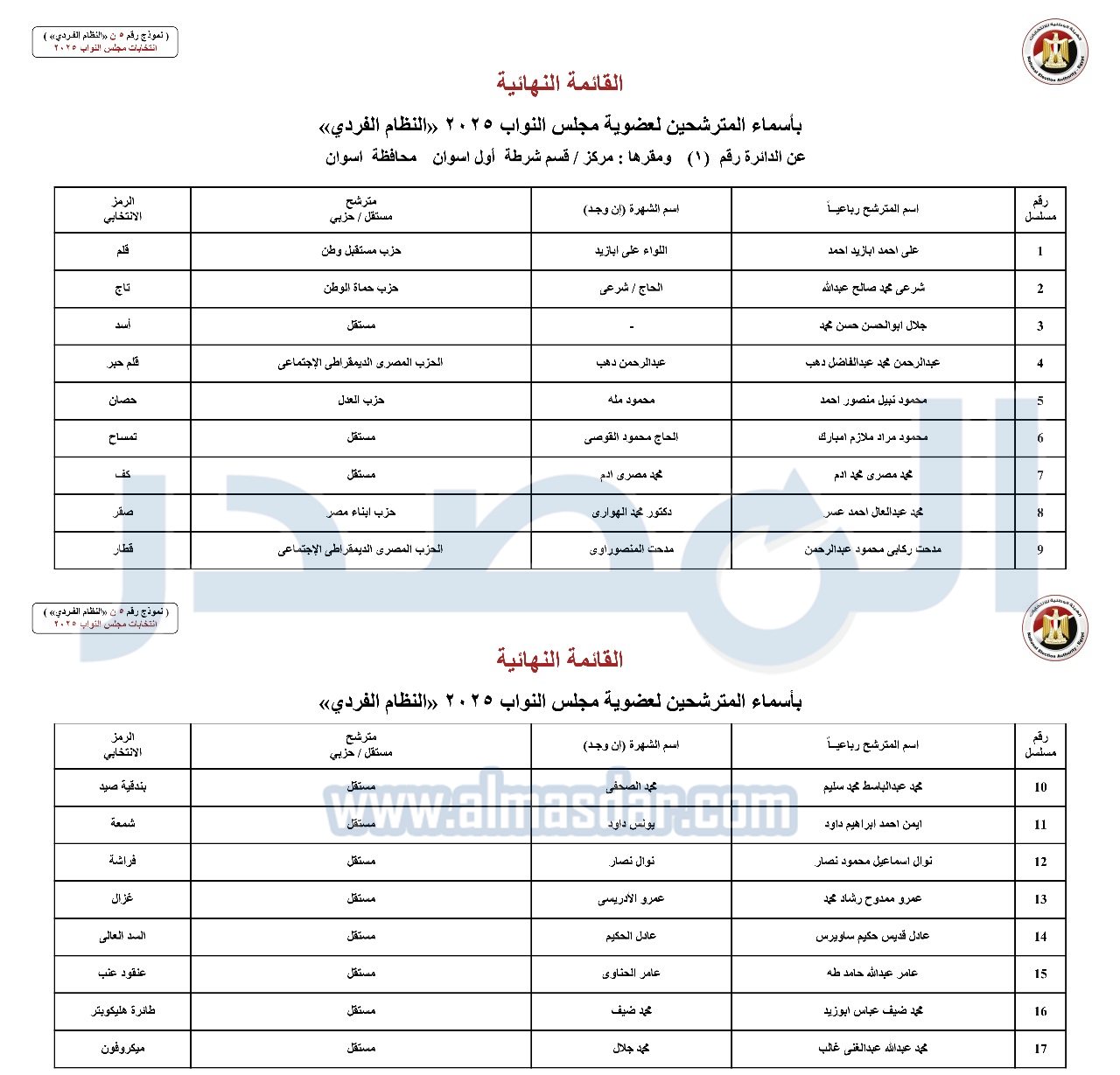 وتضم تلك الكشوف النهائية أسماء جميع المرشحين الذين استوفوا الشروط القانونية للترشح على النظام الفردي، في الدوائر الانتخابية المختلفة على مستوى الجمهورية.