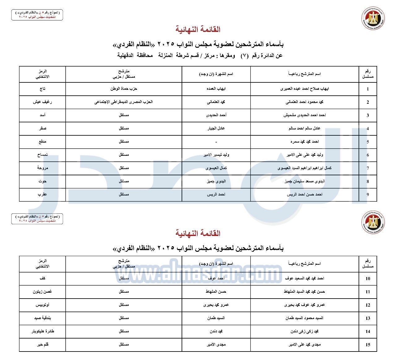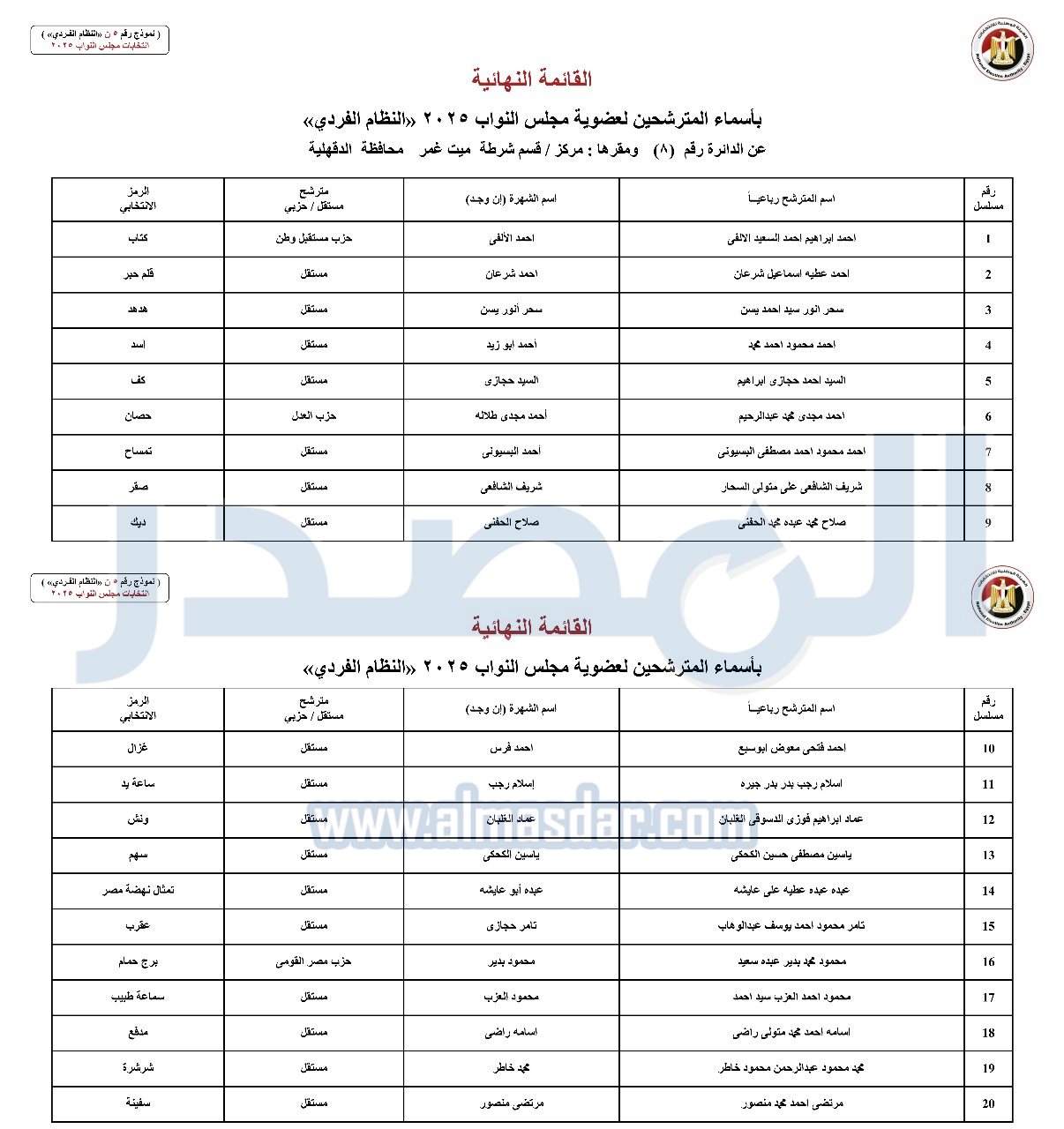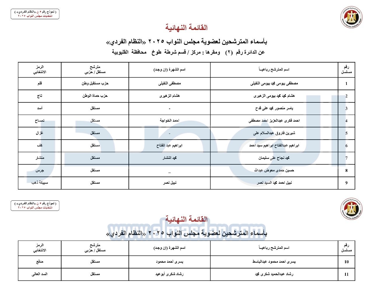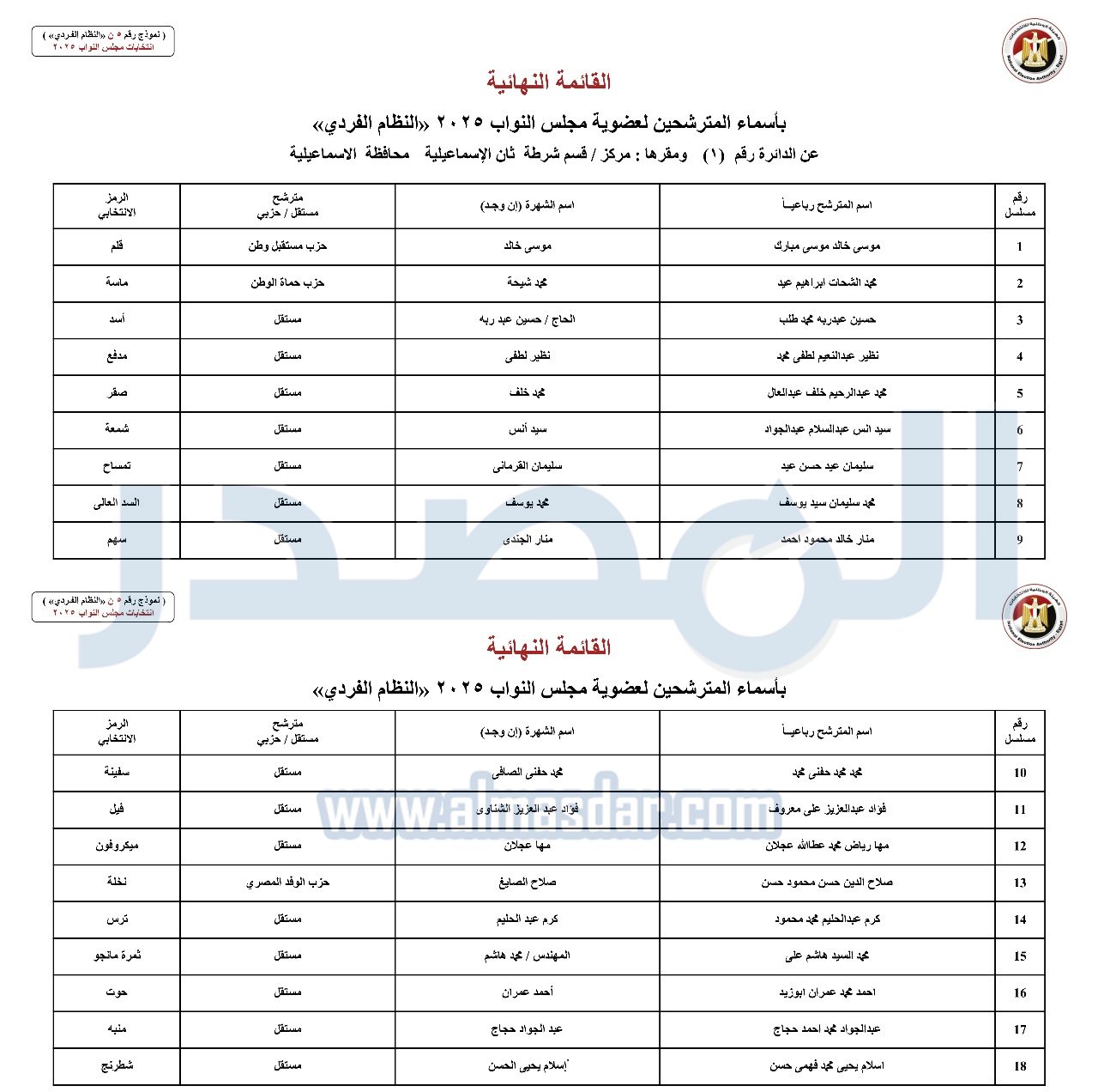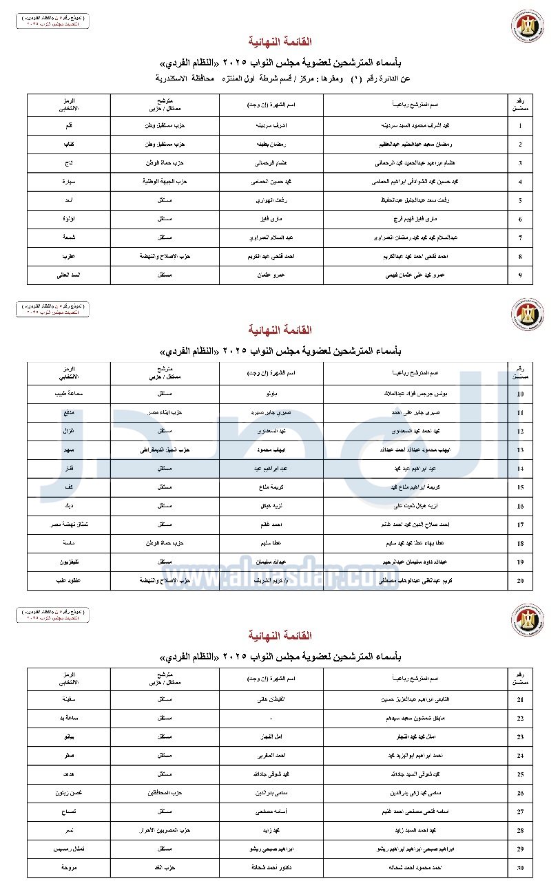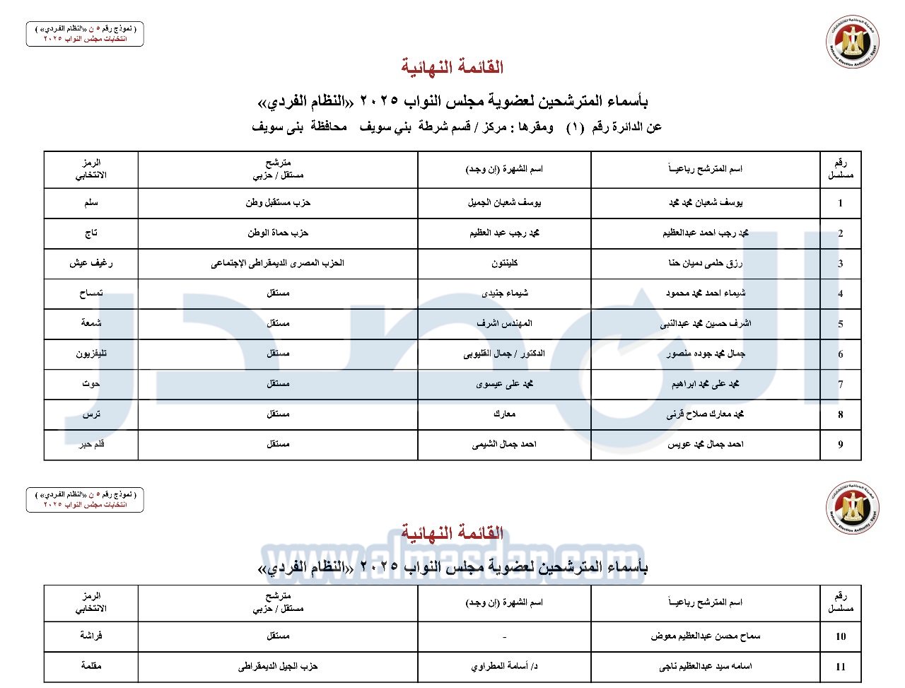 وتضم تلك الكشوف النهائية أسماء جميع المرشحين الذين استوفوا الشروط القانونية للترشح على النظام الفردي، في الدوائر الانتخابية المختلفة على مستوى الجمهورية.