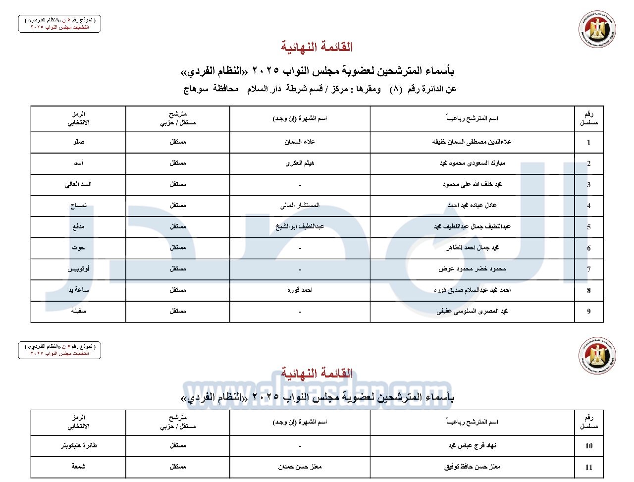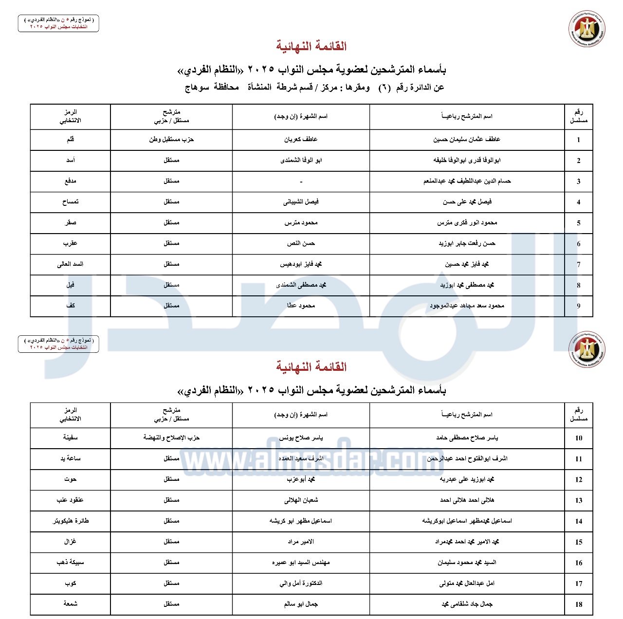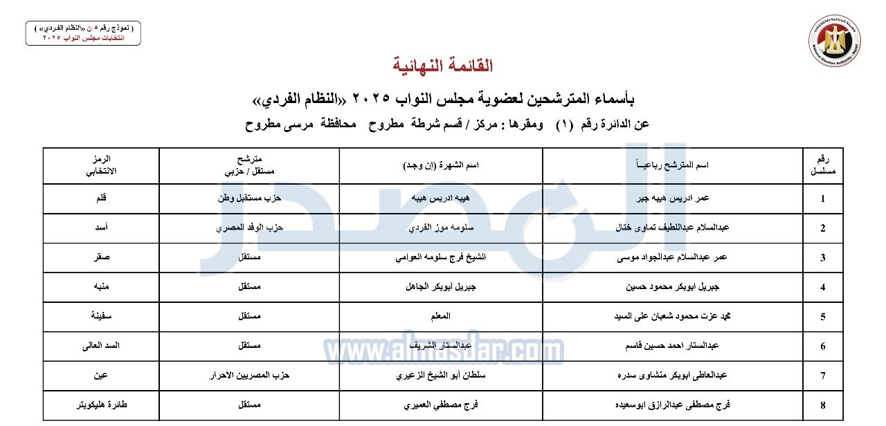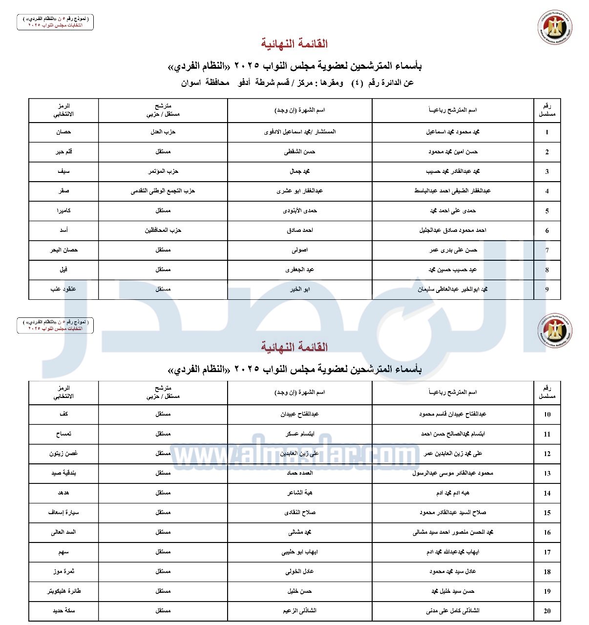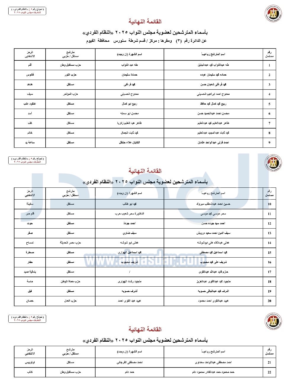 وتضم تلك الكشوف النهائية أسماء جميع المرشحين الذين استوفوا الشروط القانونية للترشح على النظام الفردي، في الدوائر الانتخابية المختلفة على مستوى الجمهورية.