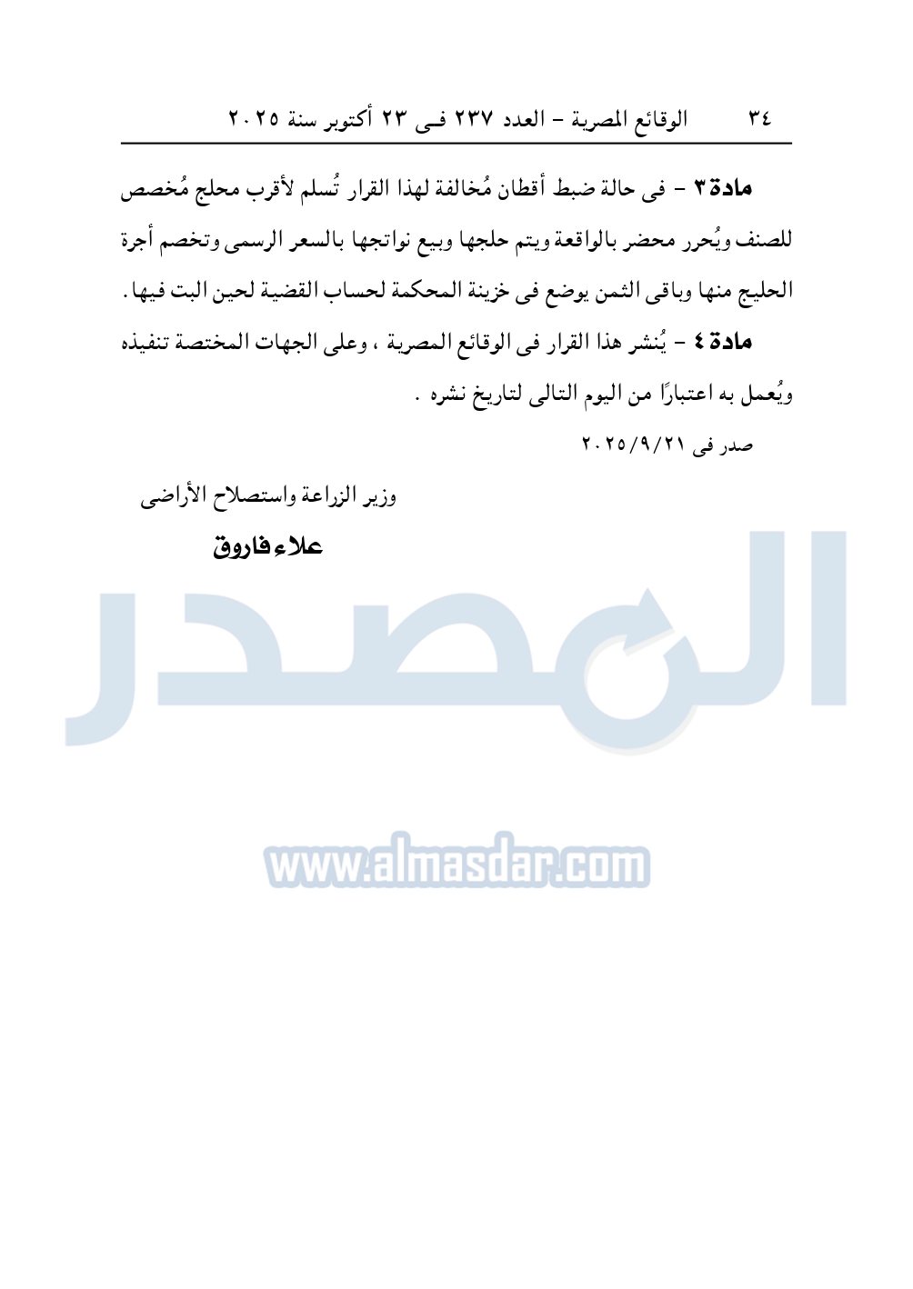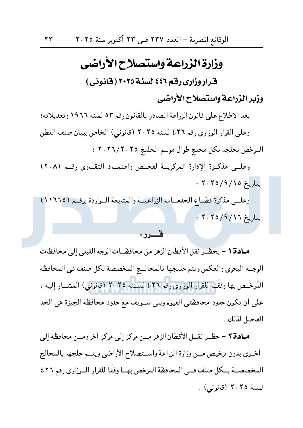 نشرت الوقائع المصرية، في العدد 237 الصادر في 23 أكتوبر 2025، قرار وزارة الزراعة واستصلاح الأراضى، رقم 446 لسنة 2025 "قانوني"، بشأن حظر نقل الأقطان الزهر من محافظات الوجه القبلى إلى محافظات الوجه البحرى.