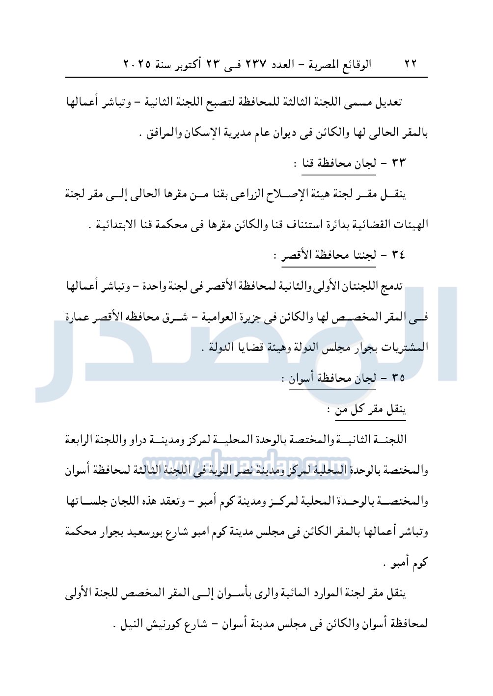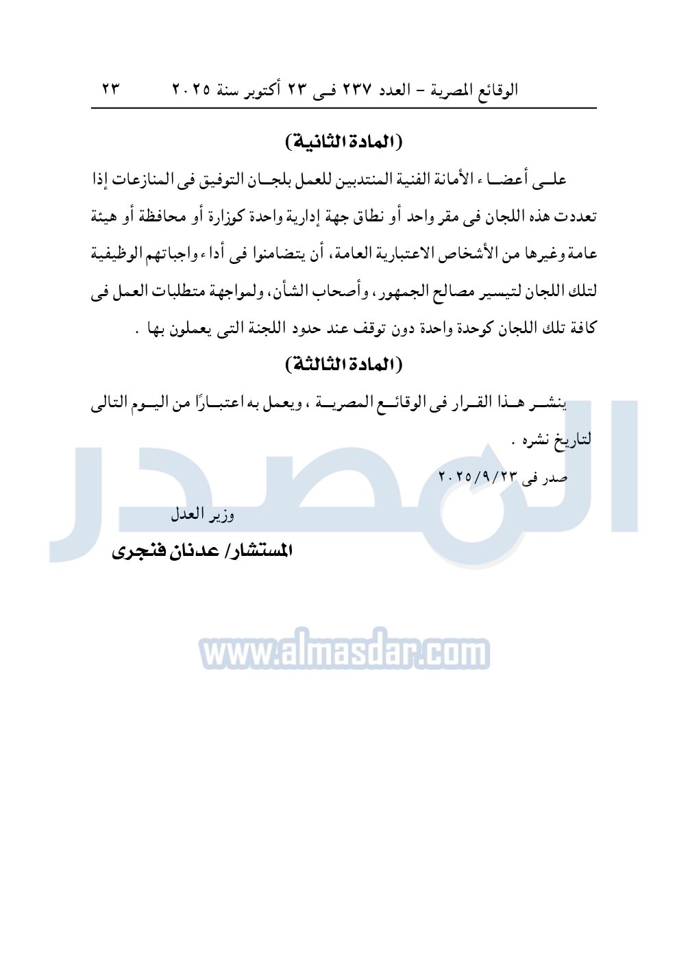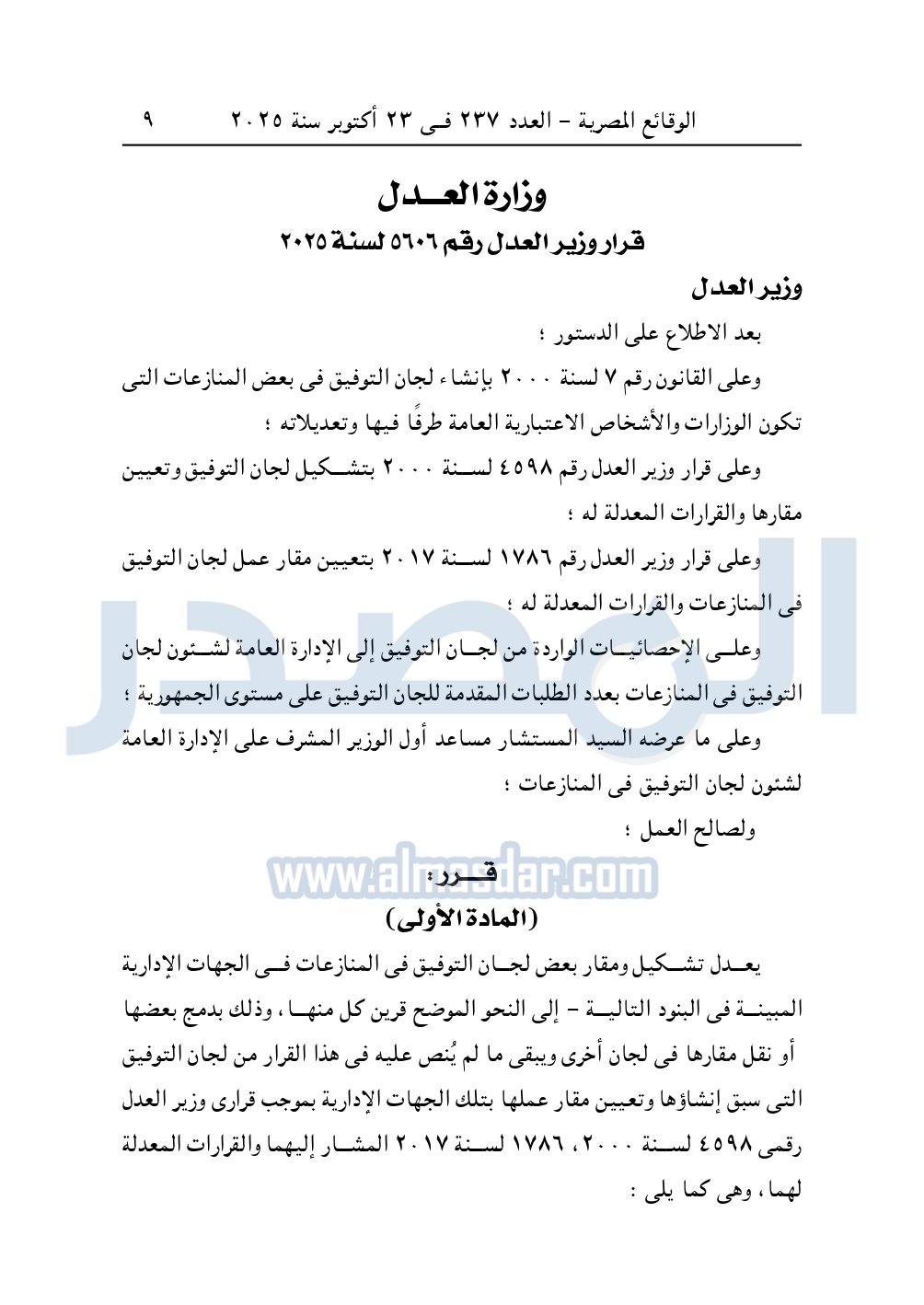 نشرت الوقائع المصرية، في العدد 237 الصادر في 23 أكتوبر 2025، قرار وزارة العدل، رقم 5606 لسنة 2025، بشأن تعديل تشكيل ومقار بعض لجان التوفيق فى المنازعات فى الجهات الإدارية.