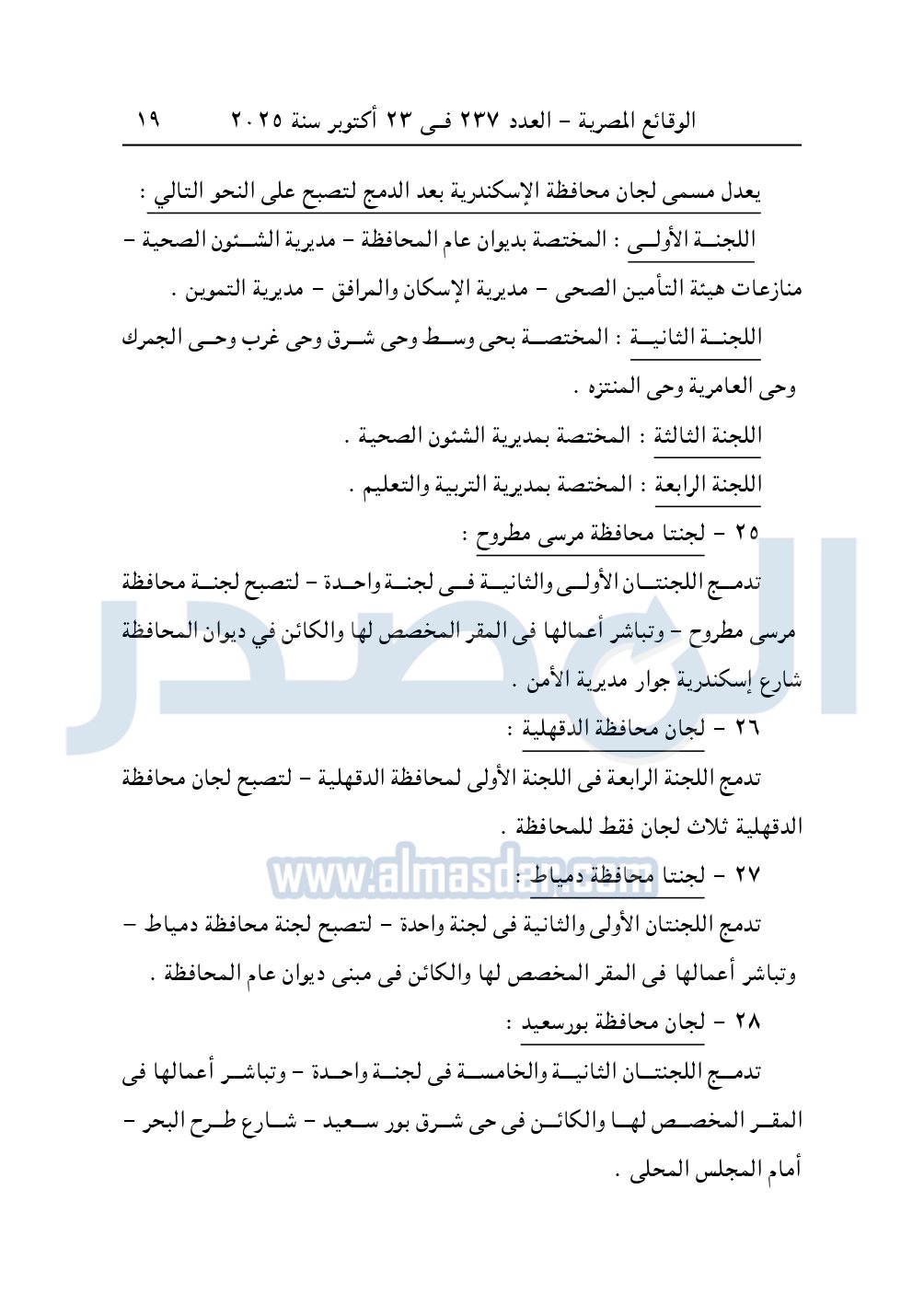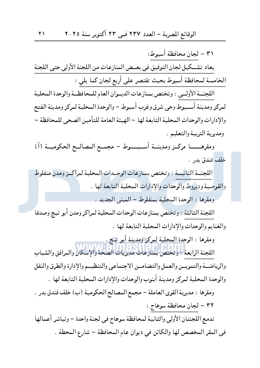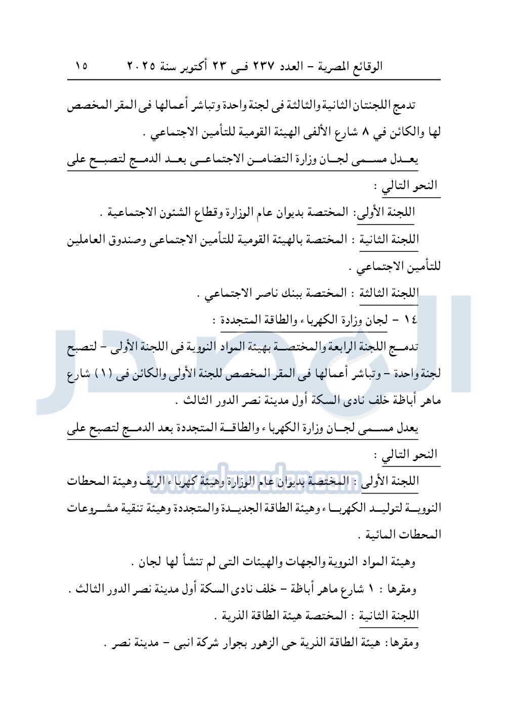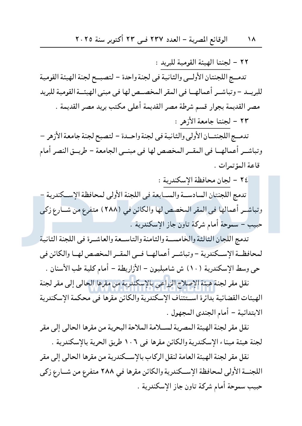 نشرت الوقائع المصرية، في العدد 237 الصادر في 23 أكتوبر 2025، قرار وزارة العدل، رقم 5606 لسنة 2025، بشأن تعديل تشكيل ومقار بعض لجان التوفيق فى المنازعات فى الجهات الإدارية.