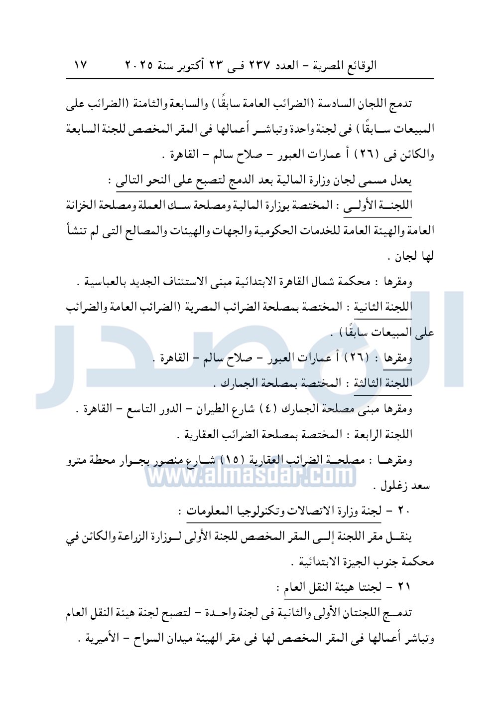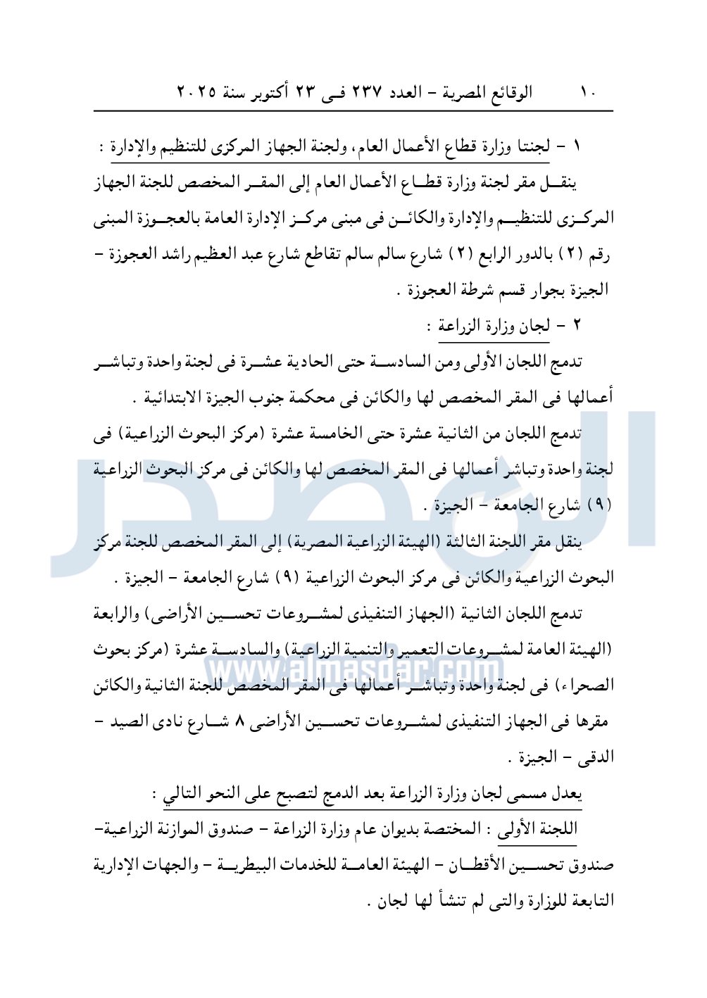 تدمج اللجان الثانية "الجهاز التنفيذى لمشروعات تحسين الأراضي" والرابعة "الهيئة العامة لمشروعات التعمير والتنمية الزراعية والسادسة عشرة "مركز بحوث الصحراء" في لجنة واحدة وتباشر أعمالها في المقر المخصص للجنة الثانية والكائن مقرها في الجهاز التنفيذي لمشروعات تحسين الأراضى 8 شارع نادى الصيد . الدقى - الجيزة.