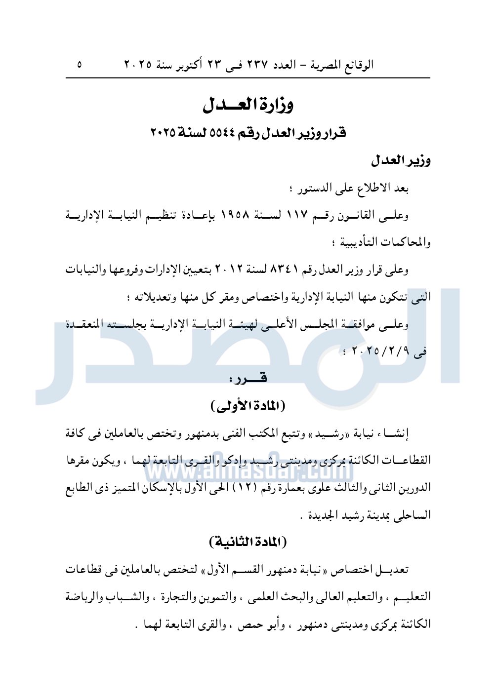 نشرت الوقائع المصرية، في العدد 237 تابع، الصادر في 23 أكتوبر 2025، قرار وزارة العدل، رقم 5544 لسنة 2025، بشأن إنشاء نيابة «رشيد» وتتبع المكتب الفنى بدمنهور.