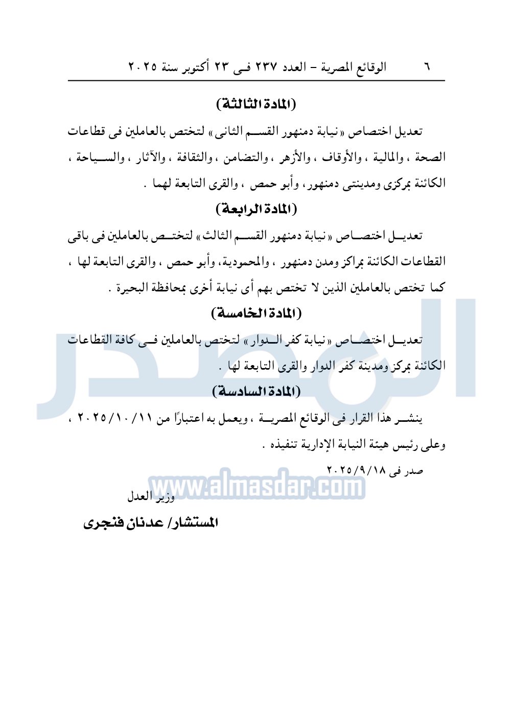 تعديل اختصاص «نيابة دمنهور القسم الثاني» لتختص بالعاملين في قطاعات الصحة، والمالية، والأوقاف، والأزهر، والتضامن، والثقافة، والآثار، والسياحة، الكائنة بمركزى ومدينتى دمنهور، وأبو حمص، والقرى التابعة لهما.