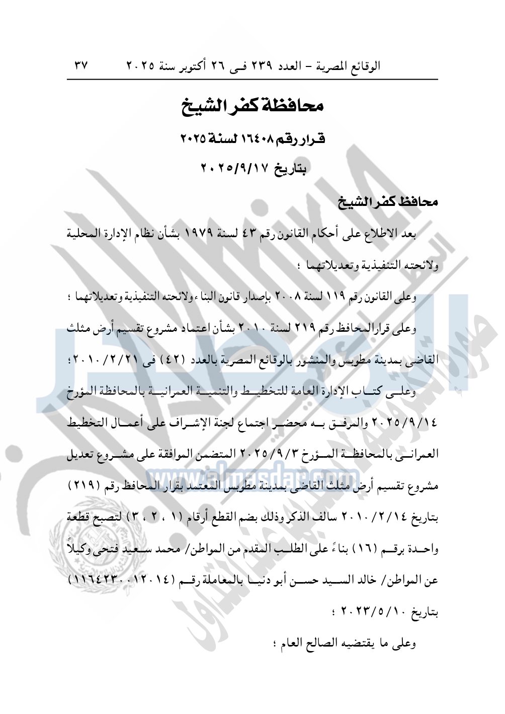 نشرت الوقائع المصرية في العدد 239، بتاريخ 26 أكتوبر 2025، قرار محافظة كفر الشيخ، رقم 16408 لسنة 2025، بتاريخ 17-9-2025، بشأن اعتماد تعديل مشروع تقسيم أرض مثلث القاضي بمدينة مطوبس.