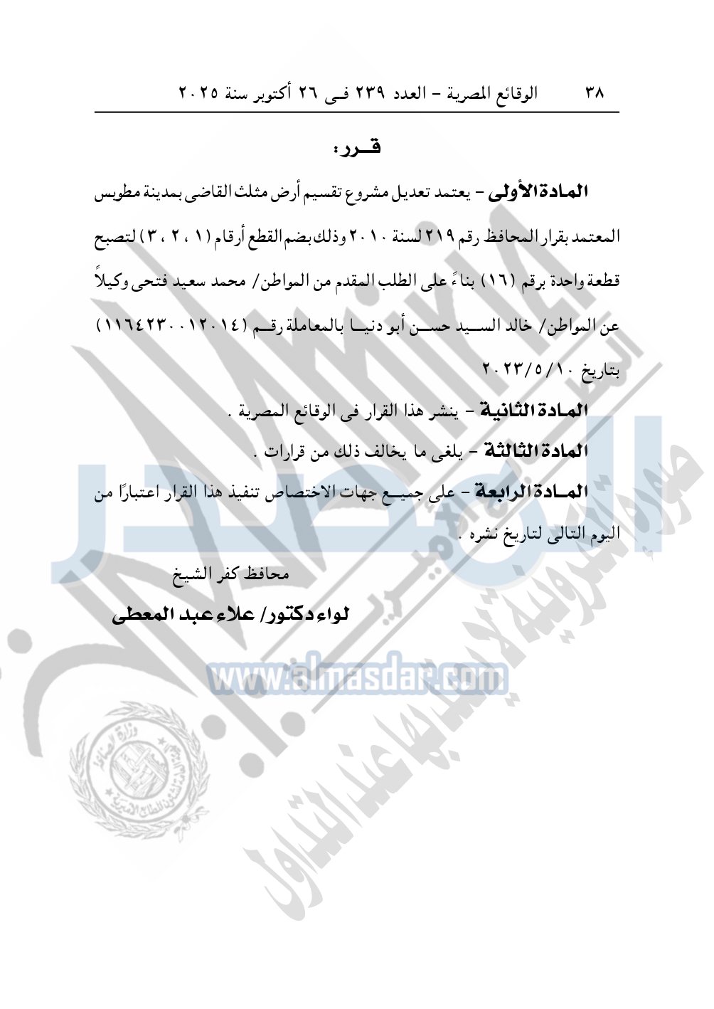 يعتمد تعديل مشروع تقسيم أرض مثلث القاضي بمدينة مطوبس المعتمد بقرار المحافظ رقم 219 لسنة 2010 وذلك بضم القطع أرقام "1، 2، 3" لتصبح قطعة واحدة برقم "16" بناءً على الطلب المقدم من المواطن محمد سعيد فتحى وكيلاً عن المواطن خالد السيد حسن أبو دنيا بالمعاملة رقم "1164230012014" بتاريخ 10-5-2023.