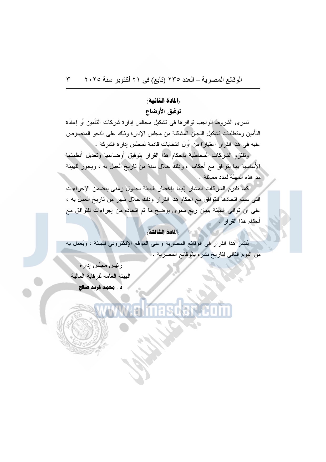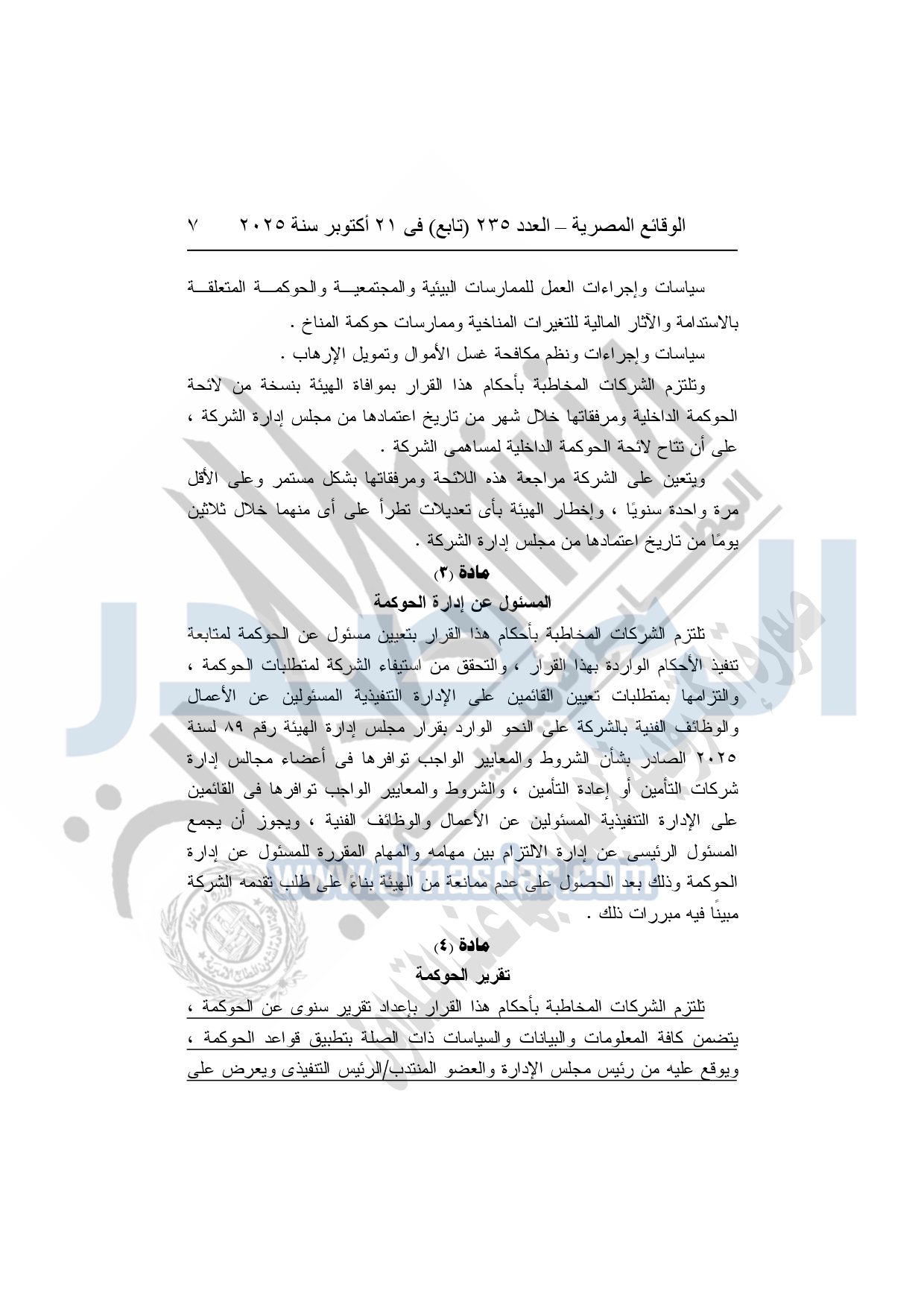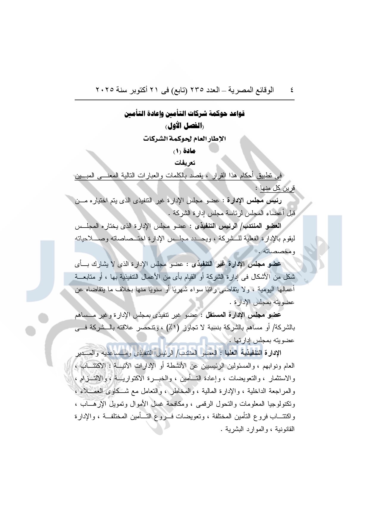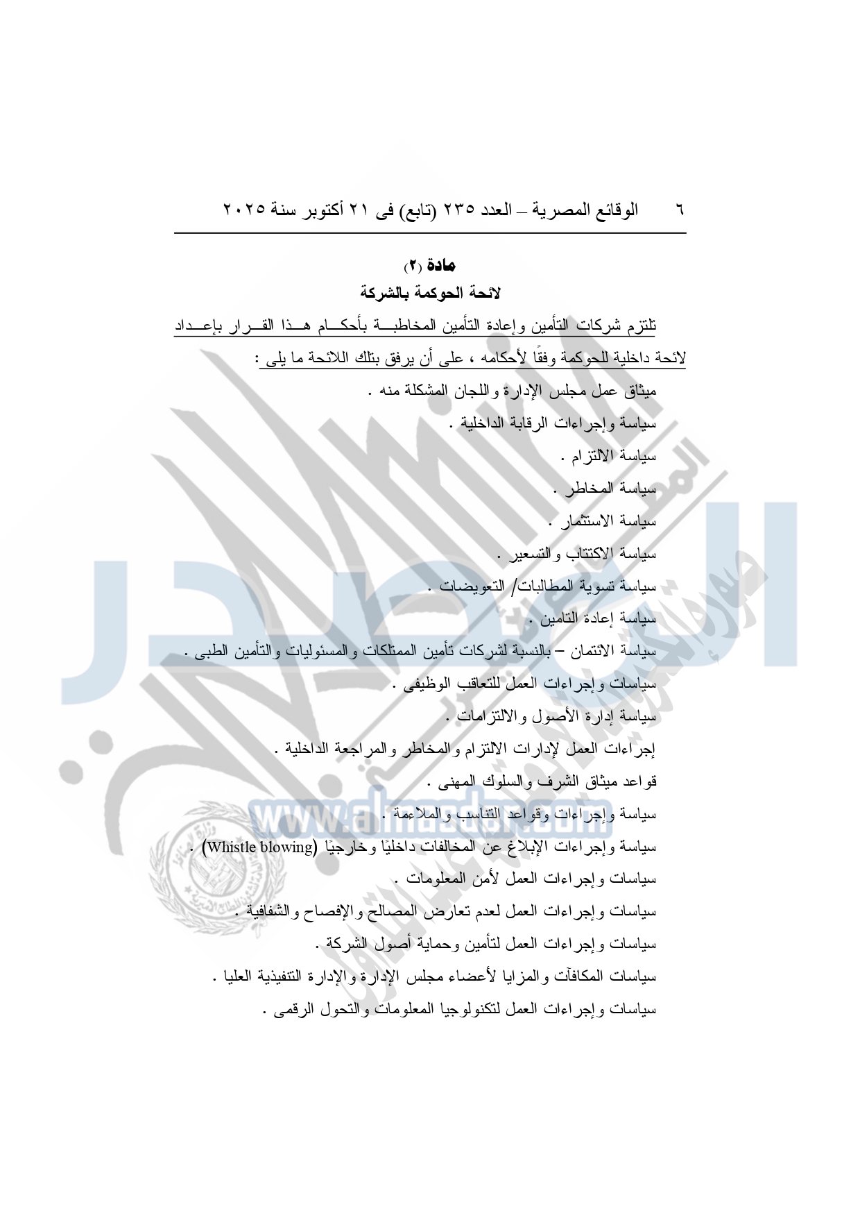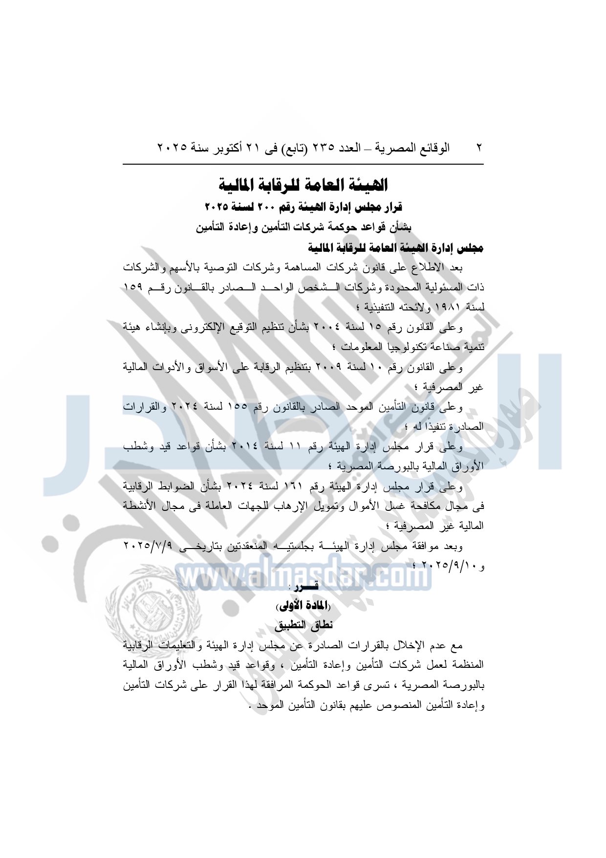 نشرت الوقائع المصرية في العدد 235 "تابع"، بتاريخ 21 أكتوبر 2025، قرار الهيئة العامة للرقابة المالية، رقم 200 لسنة 2025، بشأن قواعد حوكمة شركات التأمين وإعادة التأمين.
