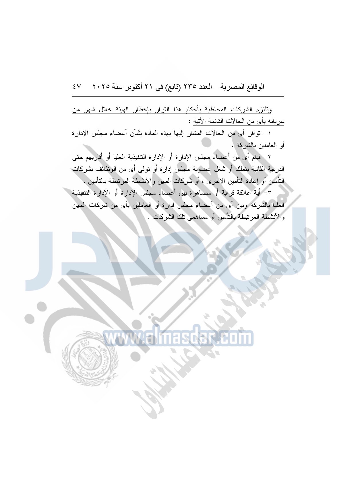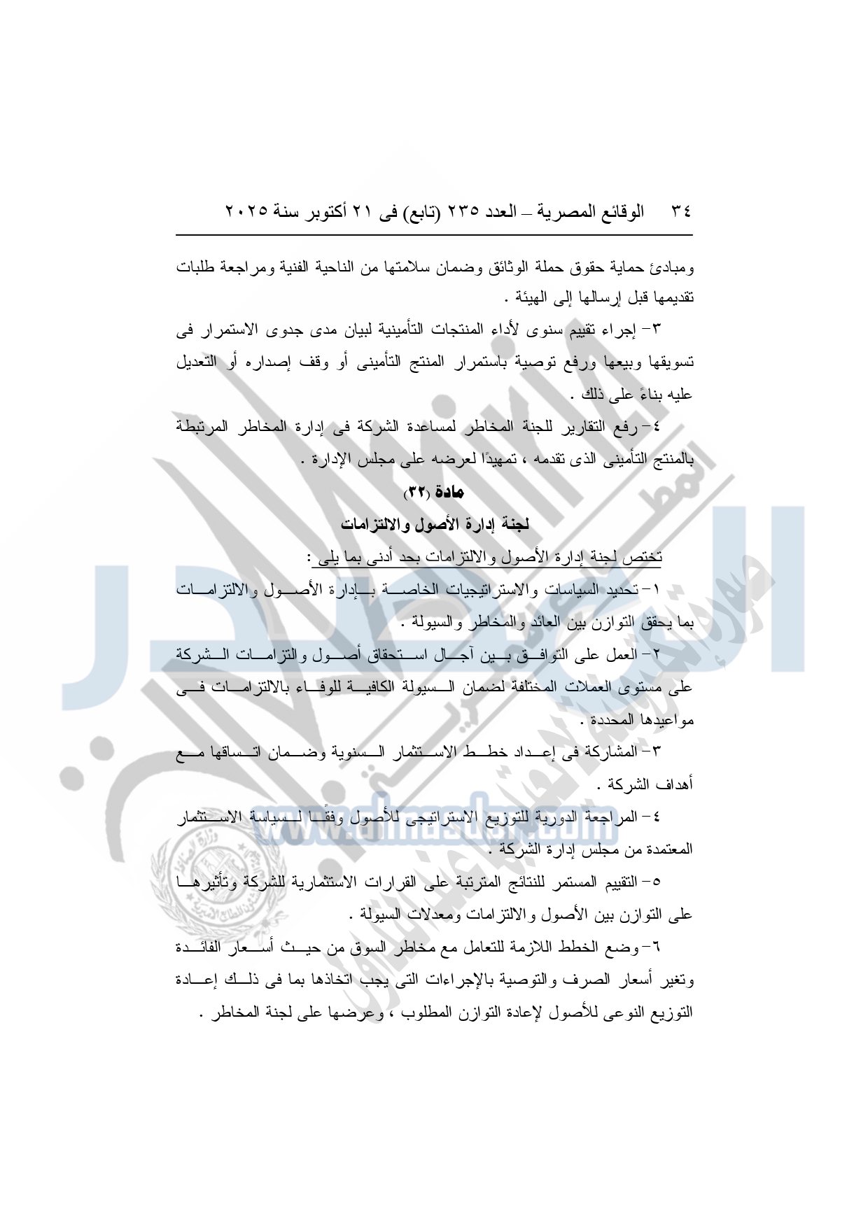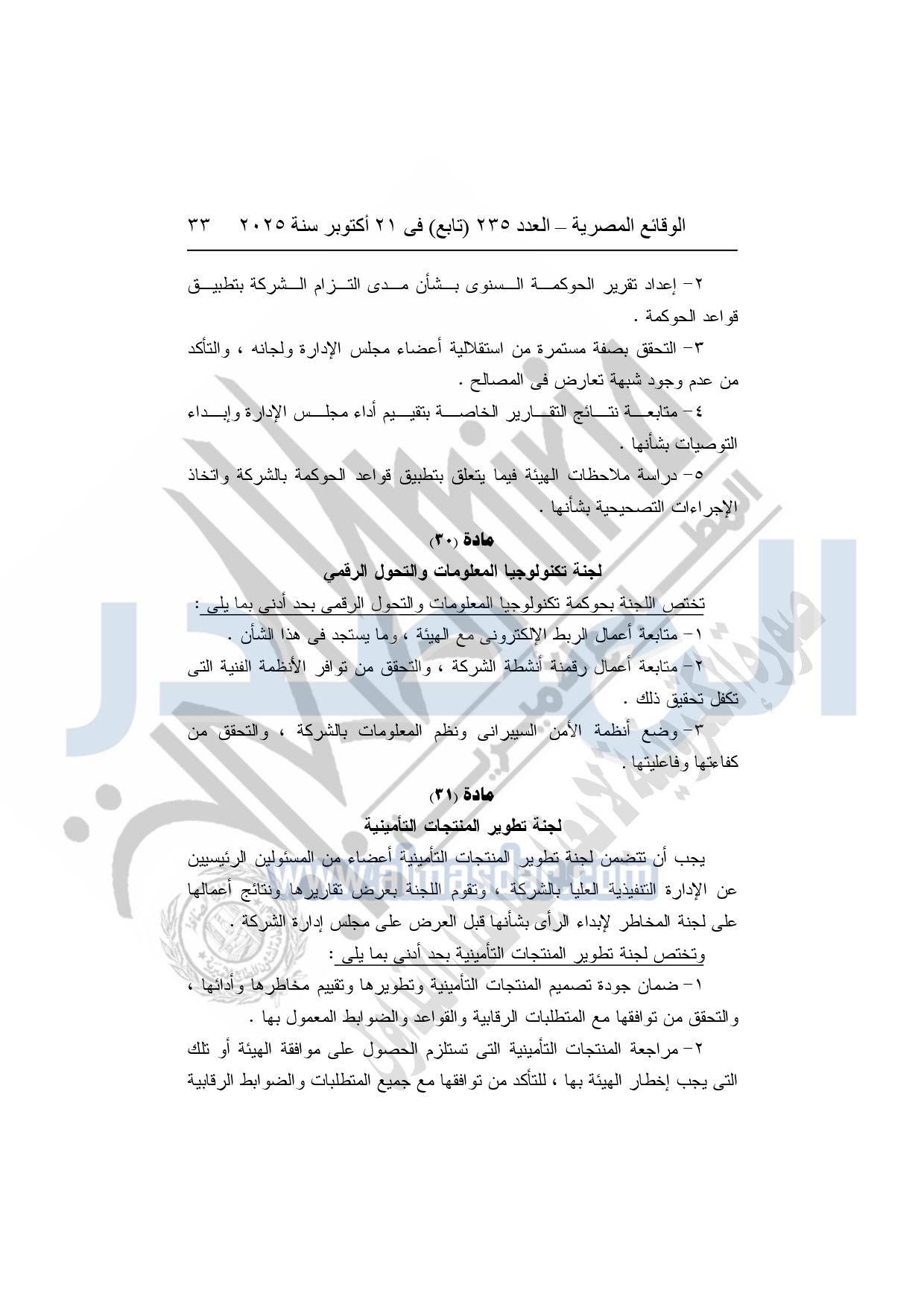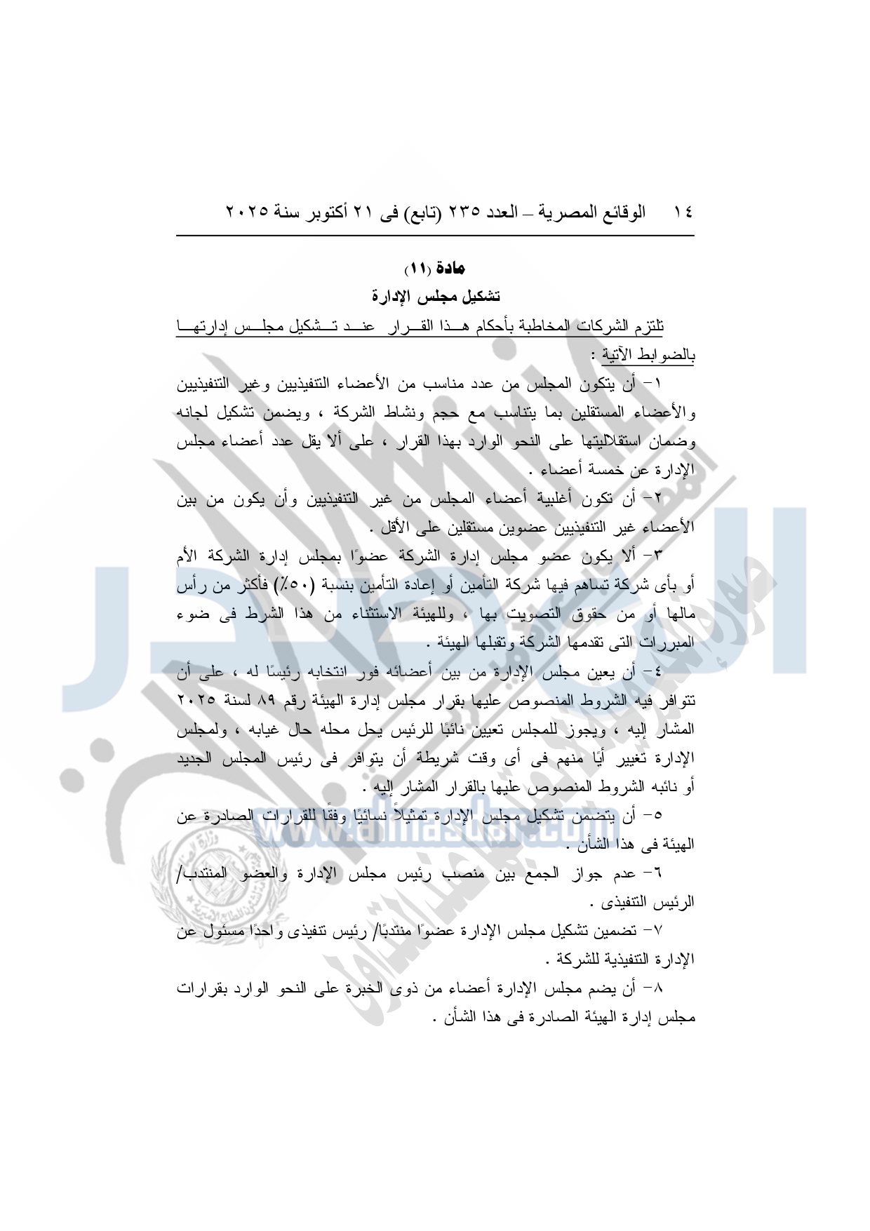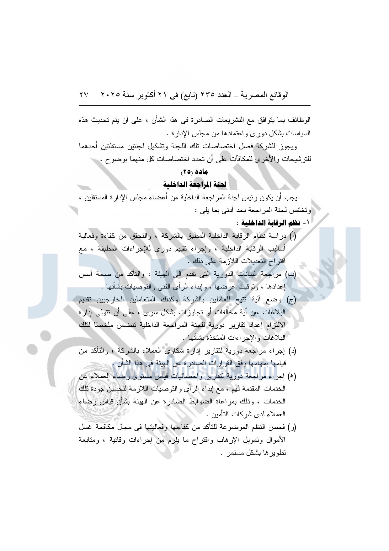 نشرت الوقائع المصرية في العدد 235 "تابع"، بتاريخ 21 أكتوبر 2025، قرار الهيئة العامة للرقابة المالية، رقم 200 لسنة 2025، بشأن قواعد حوكمة شركات التأمين وإعادة التأمين.