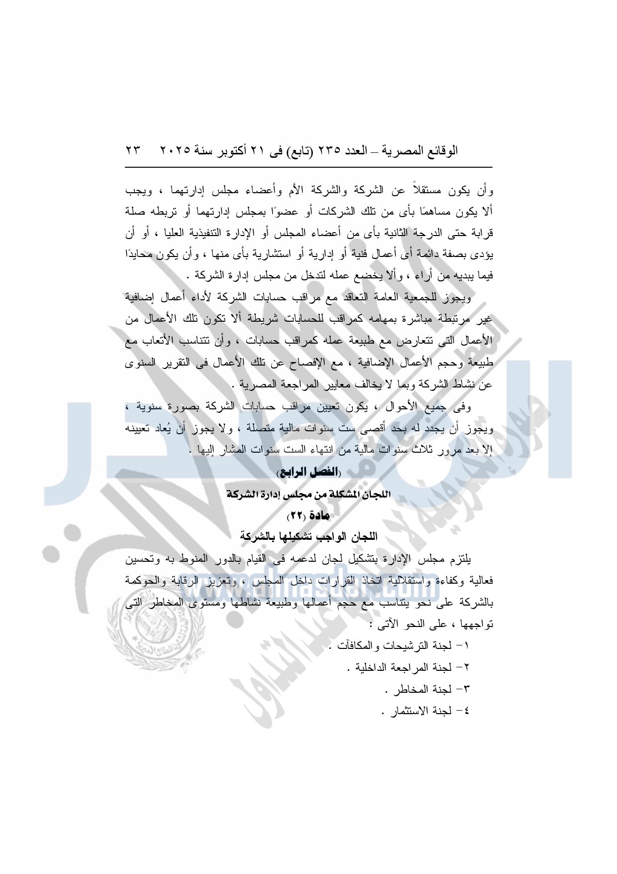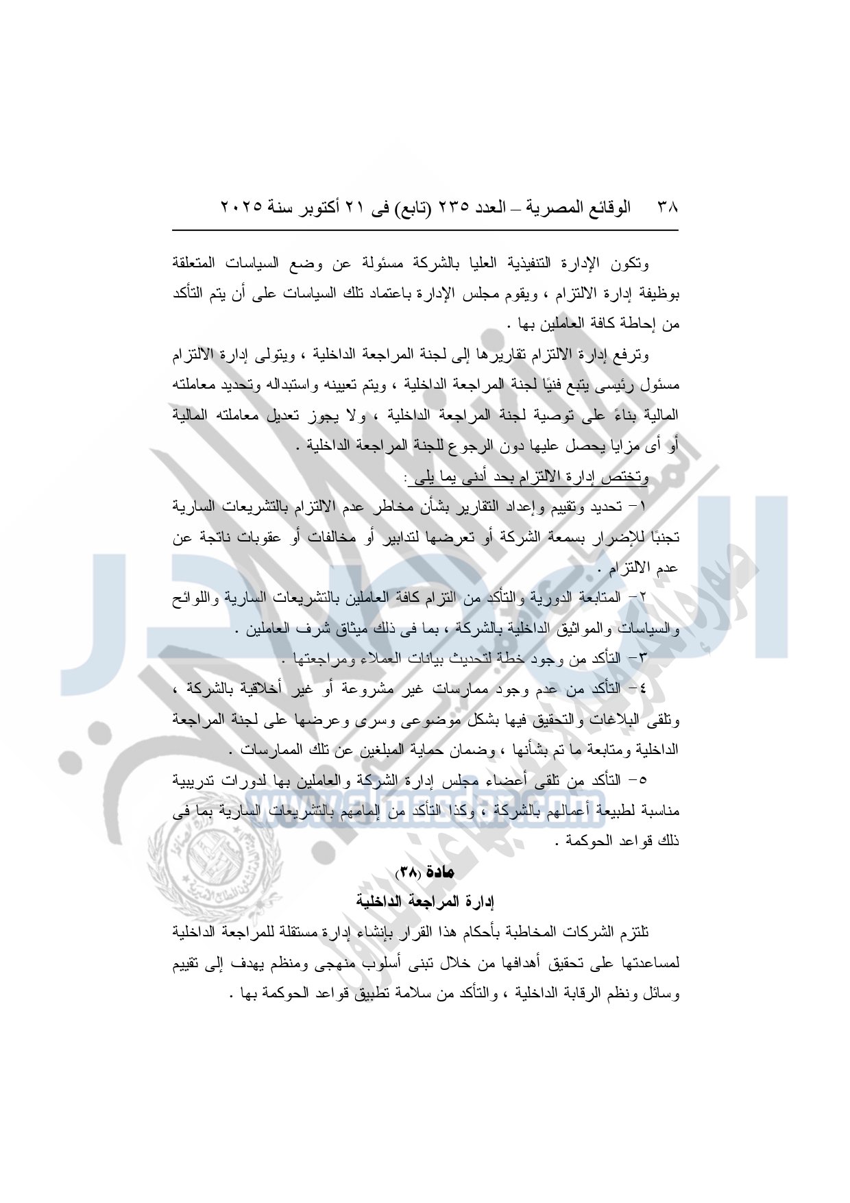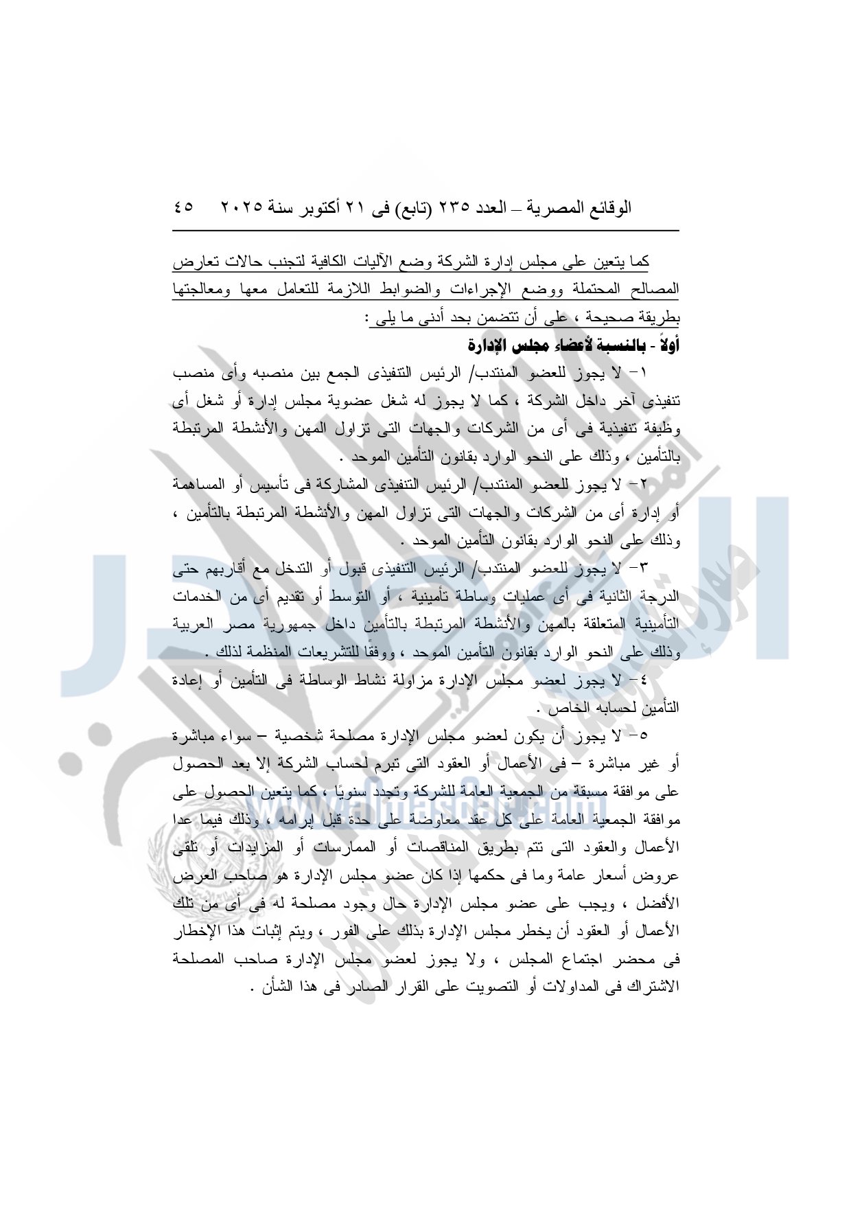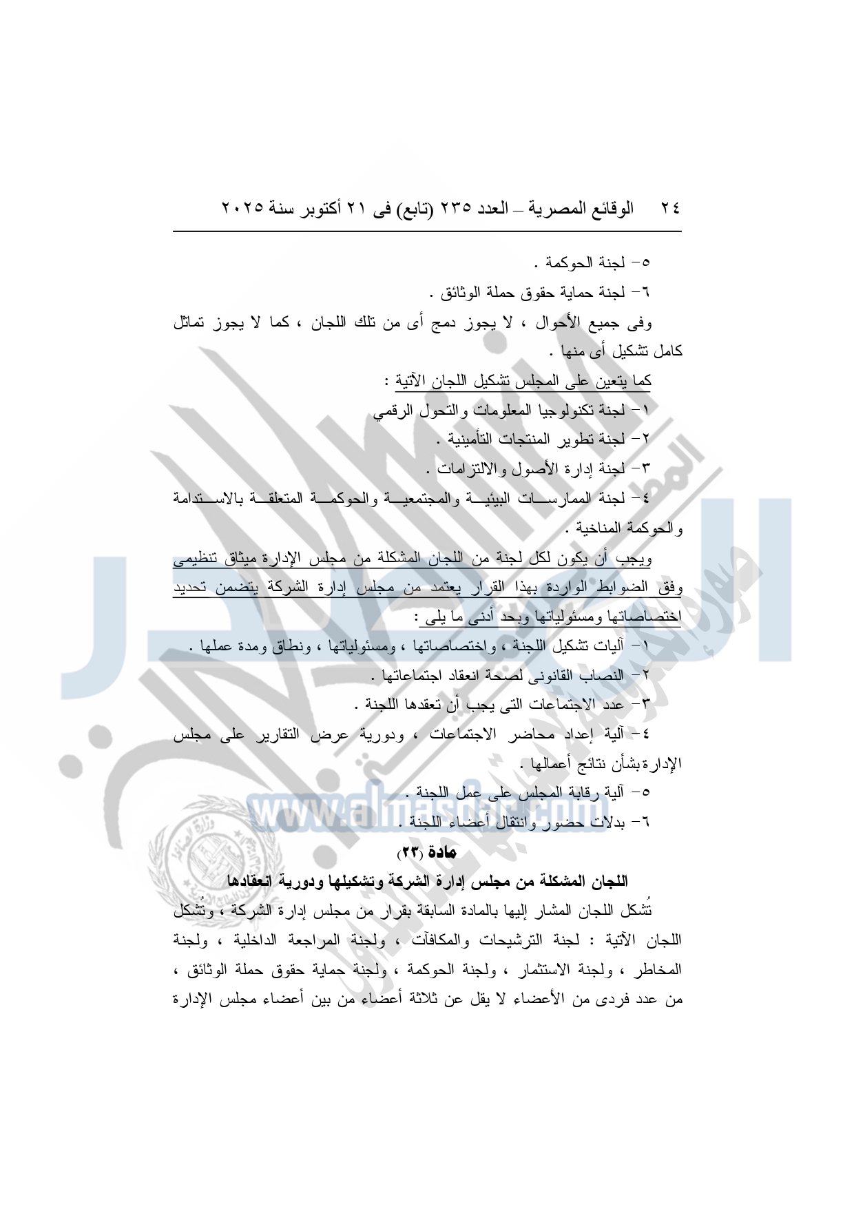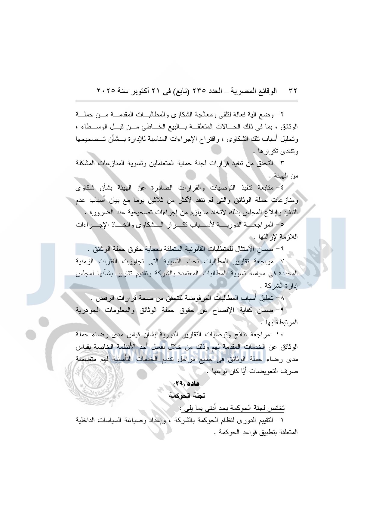 نشرت الوقائع المصرية في العدد 235 "تابع"، بتاريخ 21 أكتوبر 2025، قرار الهيئة العامة للرقابة المالية، رقم 200 لسنة 2025، بشأن قواعد حوكمة شركات التأمين وإعادة التأمين.