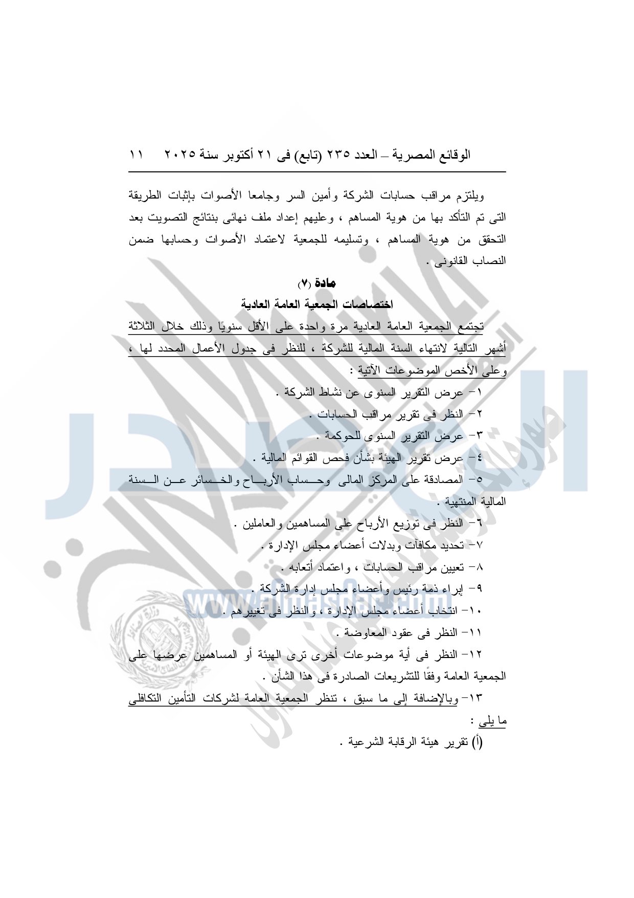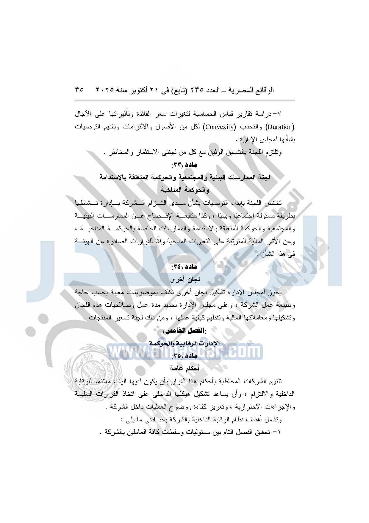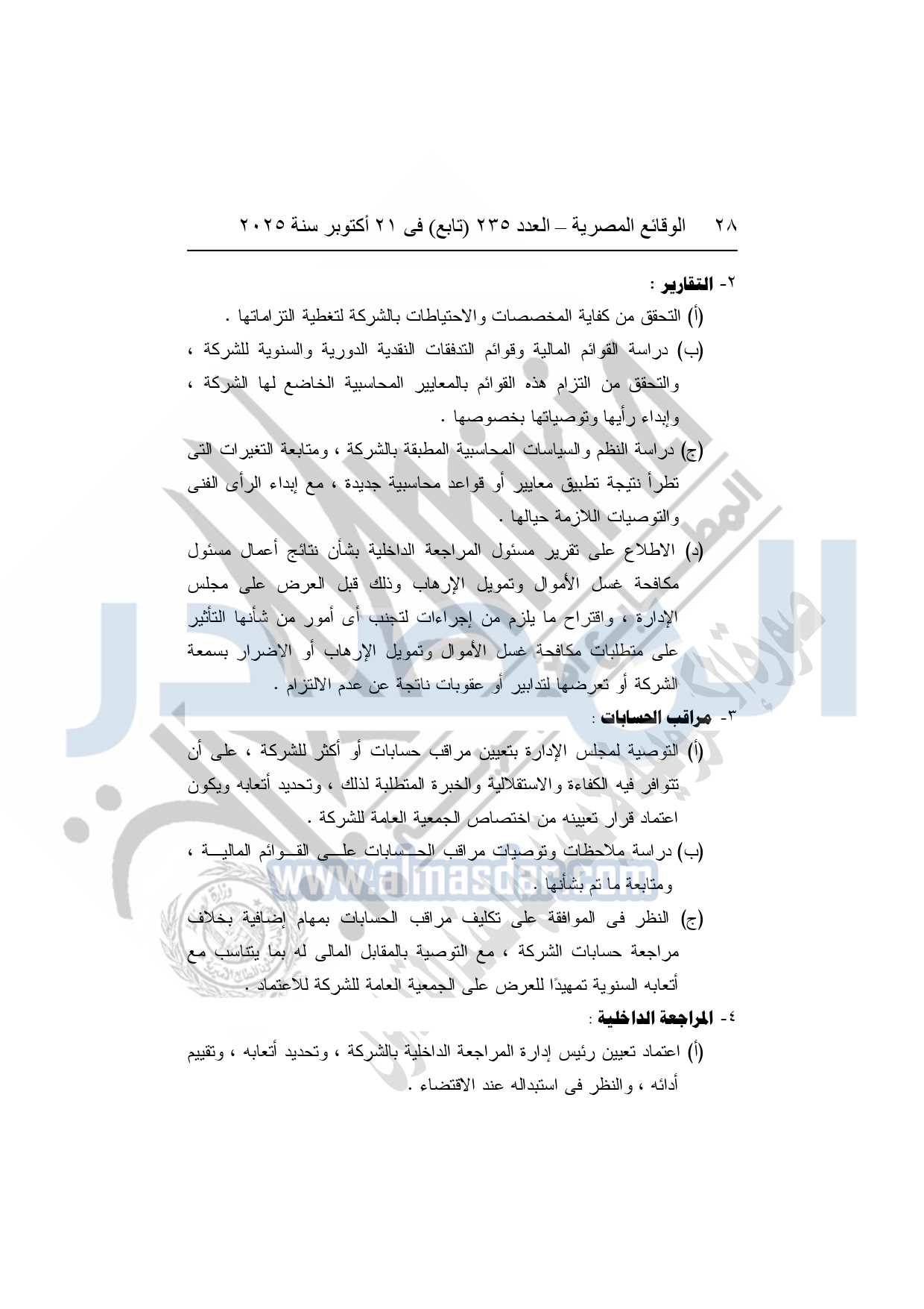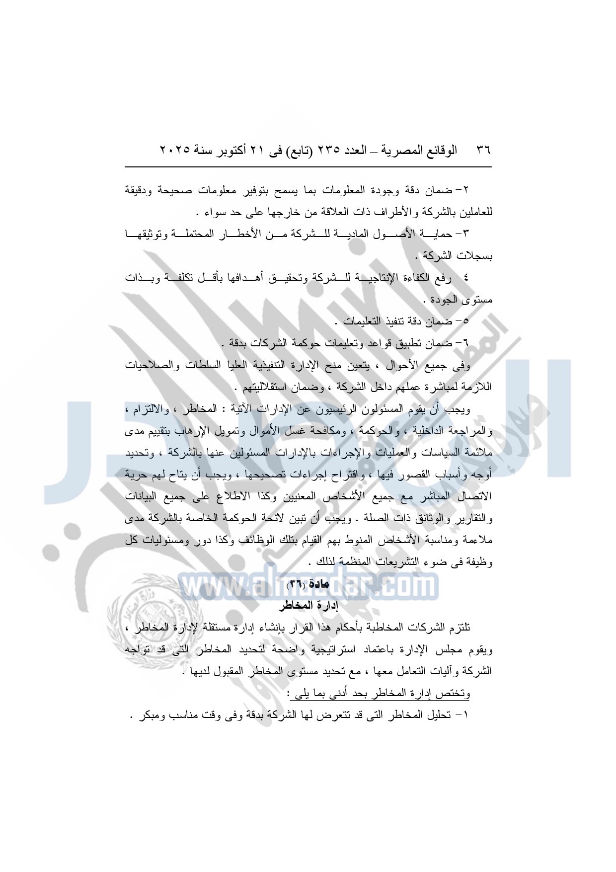 نشرت الوقائع المصرية في العدد 235 "تابع"، بتاريخ 21 أكتوبر 2025، قرار الهيئة العامة للرقابة المالية، رقم 200 لسنة 2025، بشأن قواعد حوكمة شركات التأمين وإعادة التأمين.