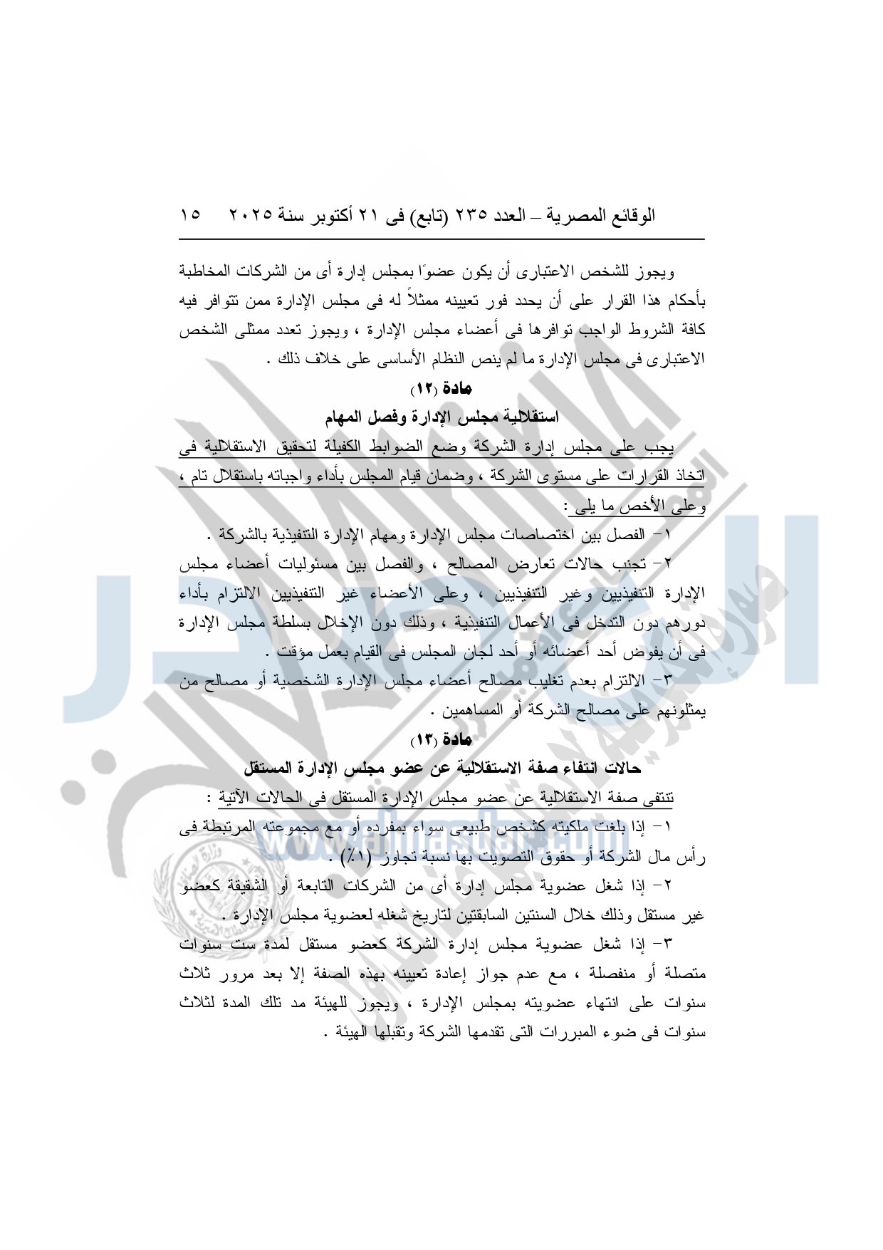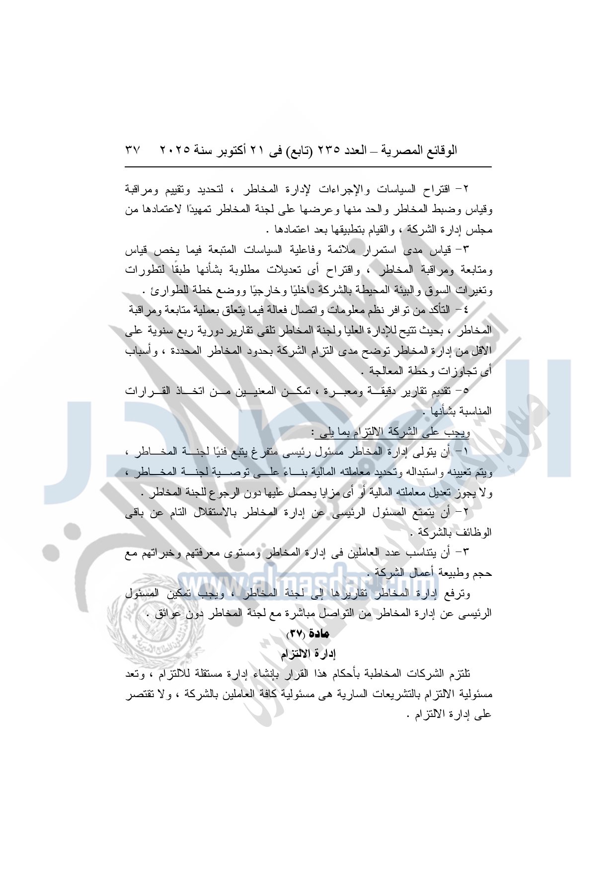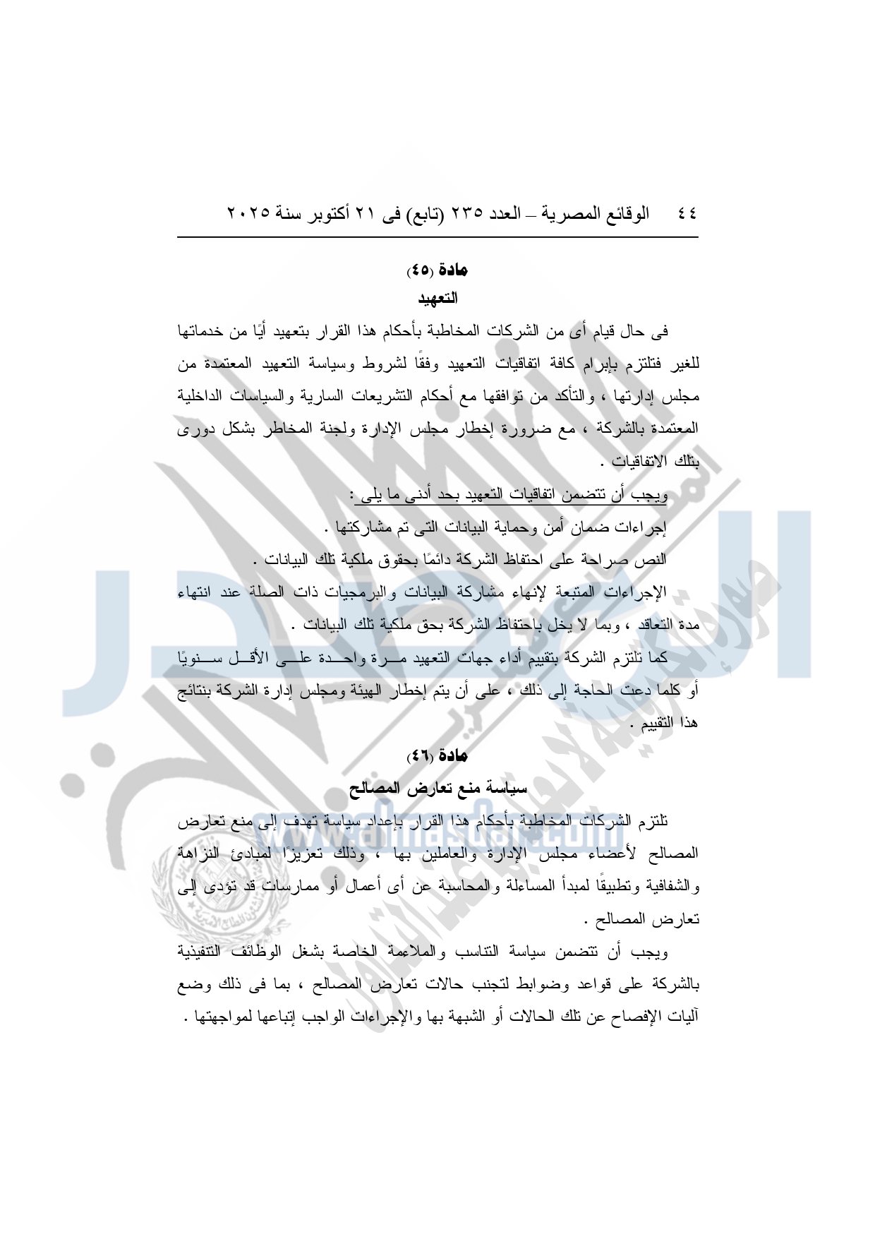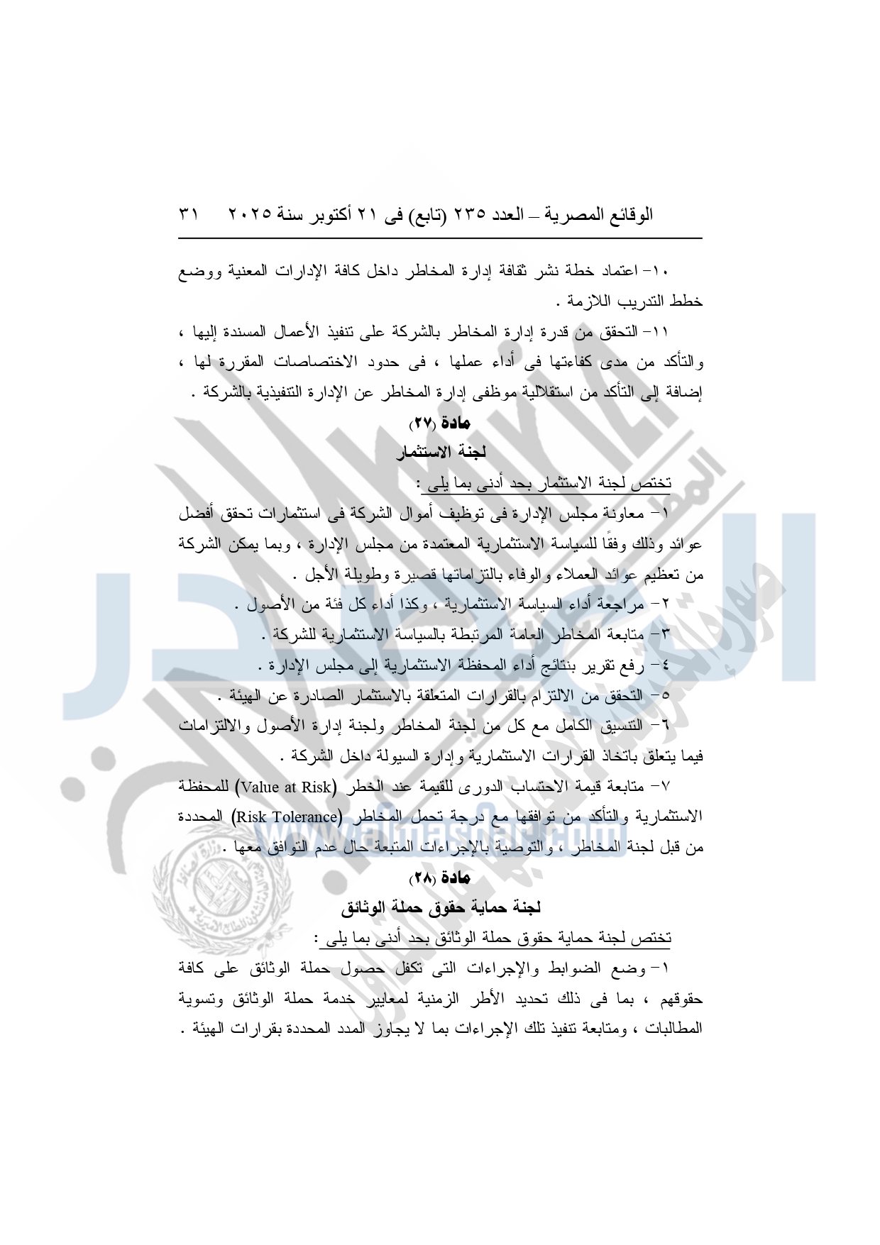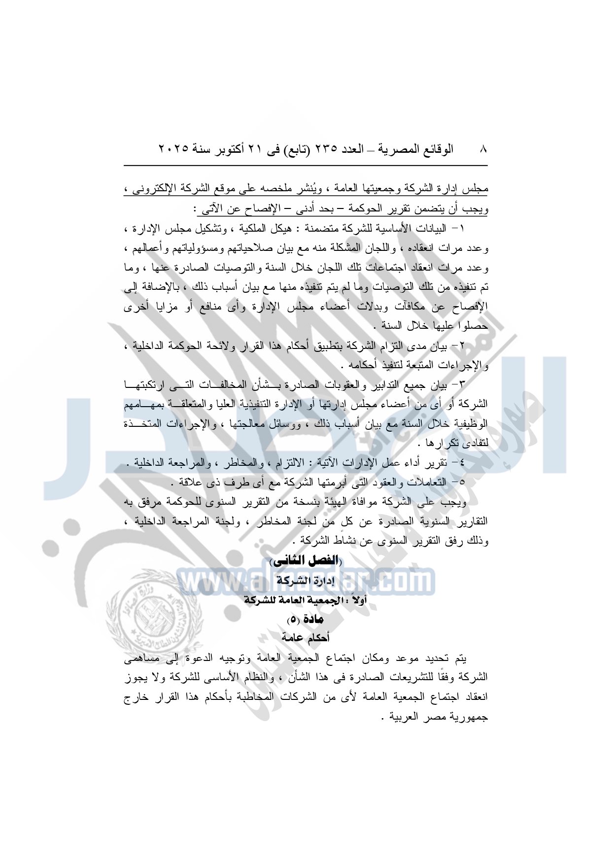 نشرت الوقائع المصرية في العدد 235 "تابع"، بتاريخ 21 أكتوبر 2025، قرار الهيئة العامة للرقابة المالية، رقم 200 لسنة 2025، بشأن قواعد حوكمة شركات التأمين وإعادة التأمين.