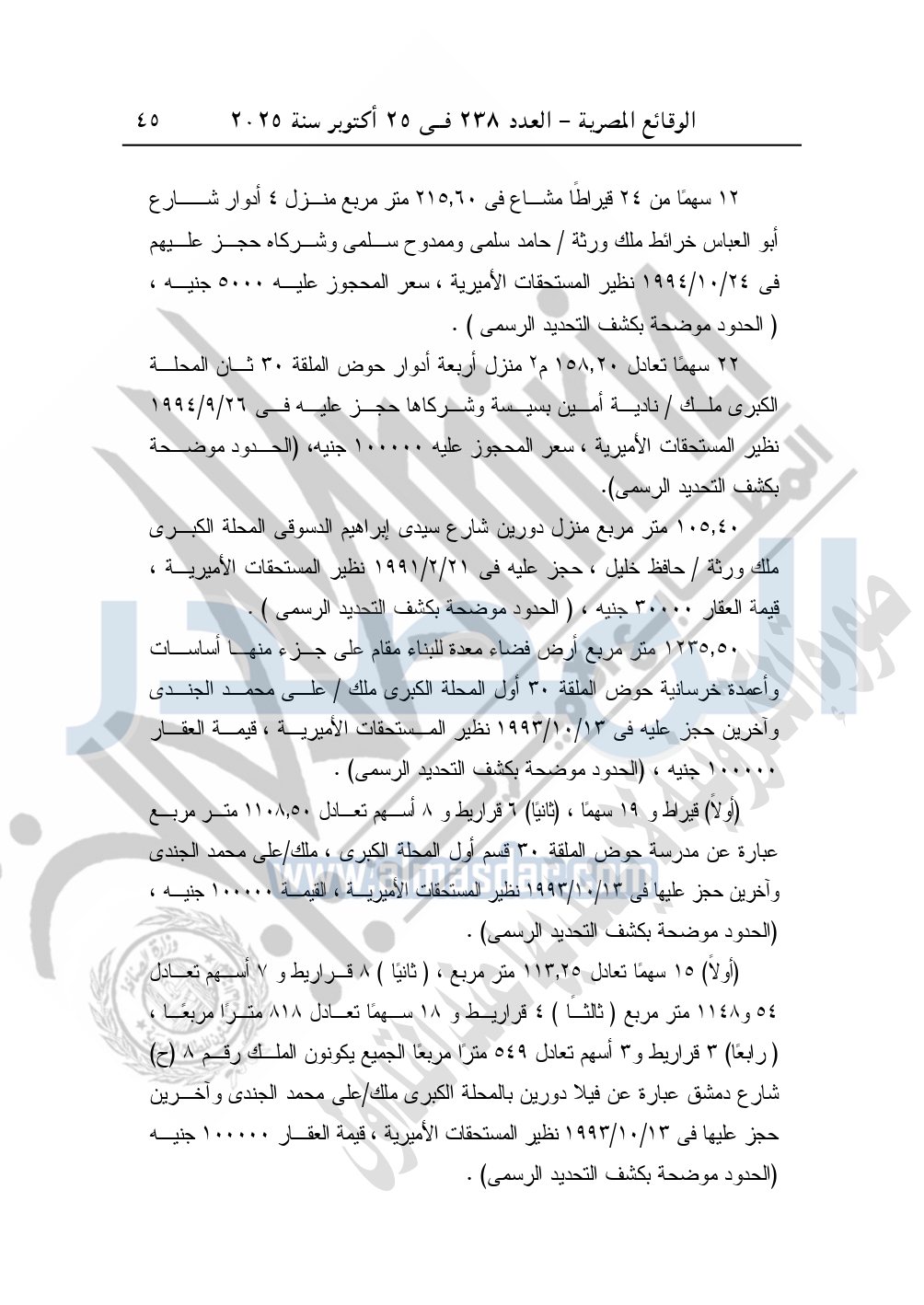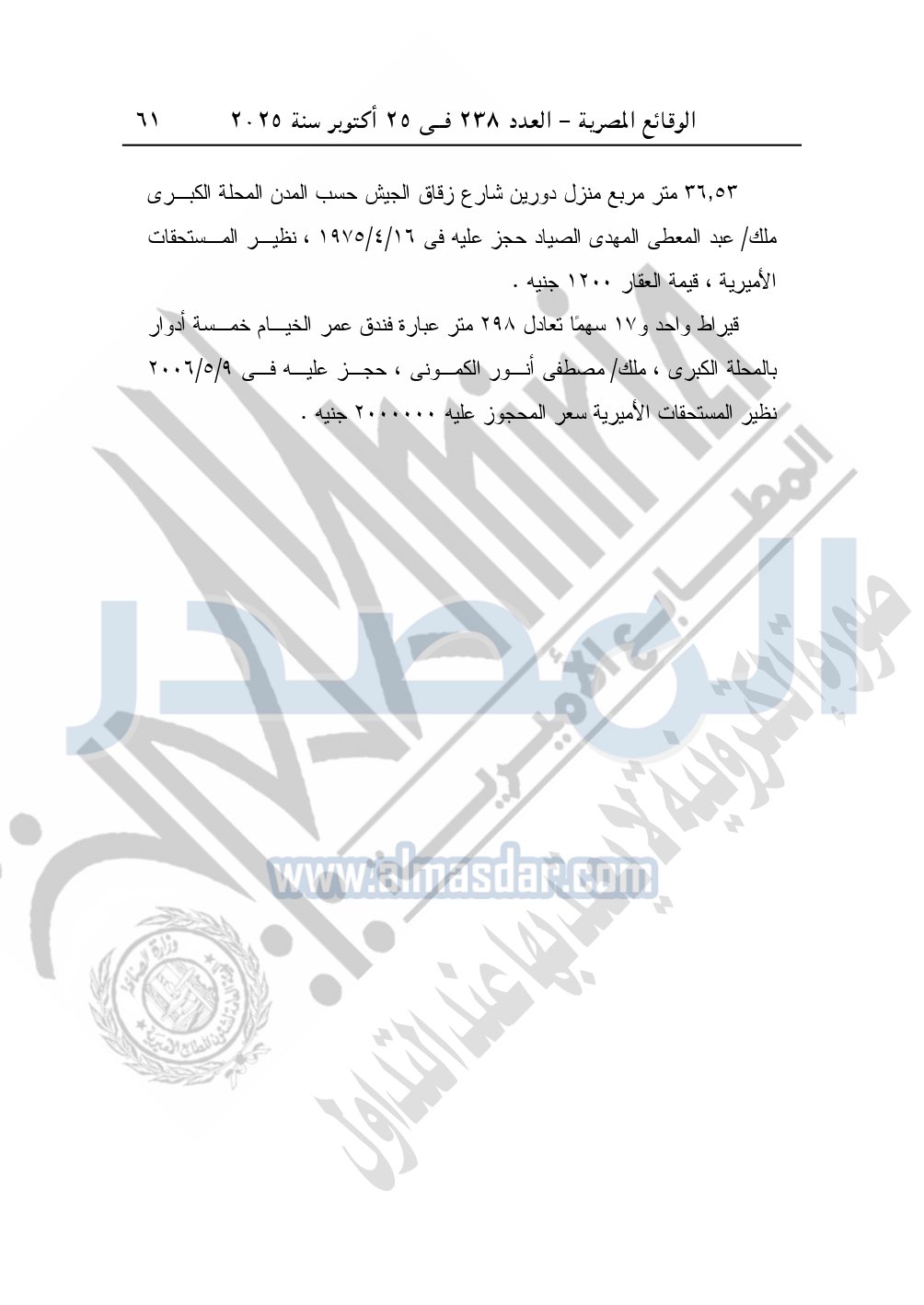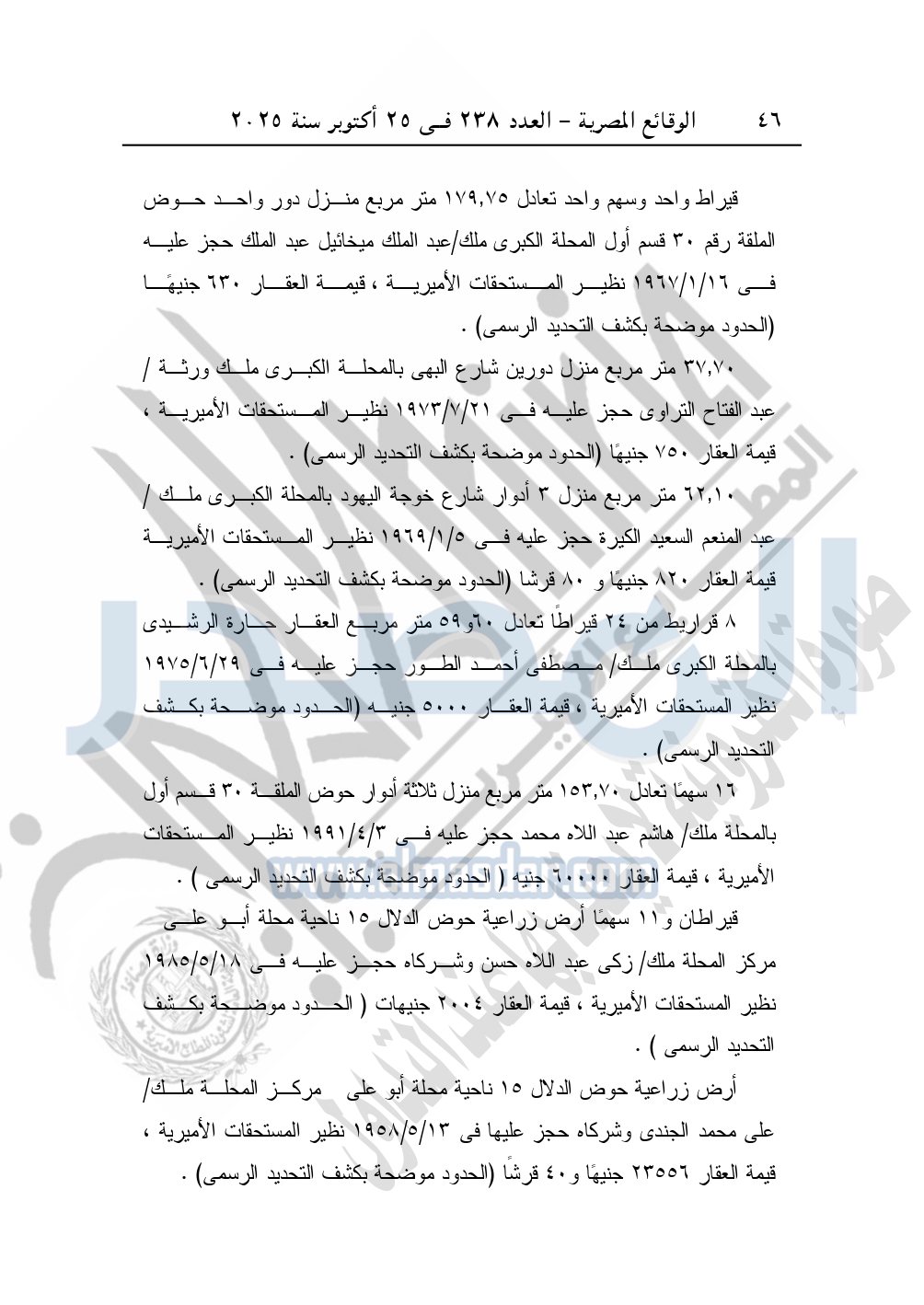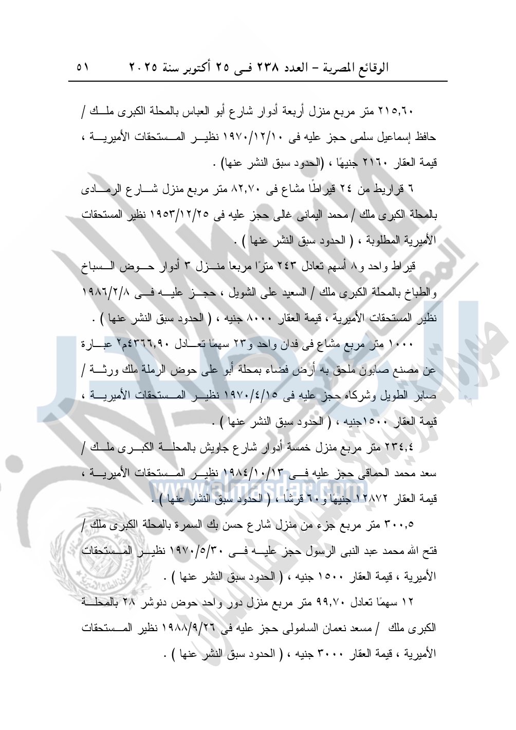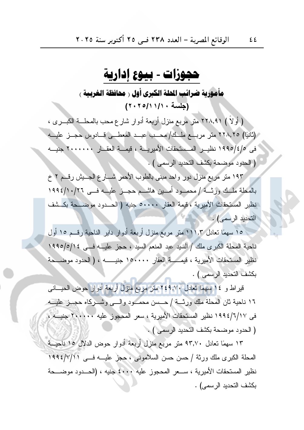 نشرت الوقائع المصرية في العدد 238، بتاريخ 25 أكتوبر 2025، حجوزات - بيوع إدارية، قرار مأمورية ضرائب المحلة الكبرى أول "محافظة الغربية" "جلسة 10-11-2025".
