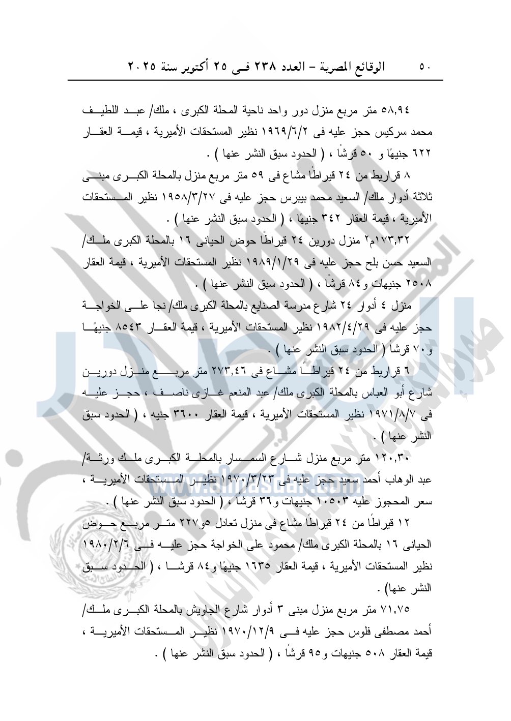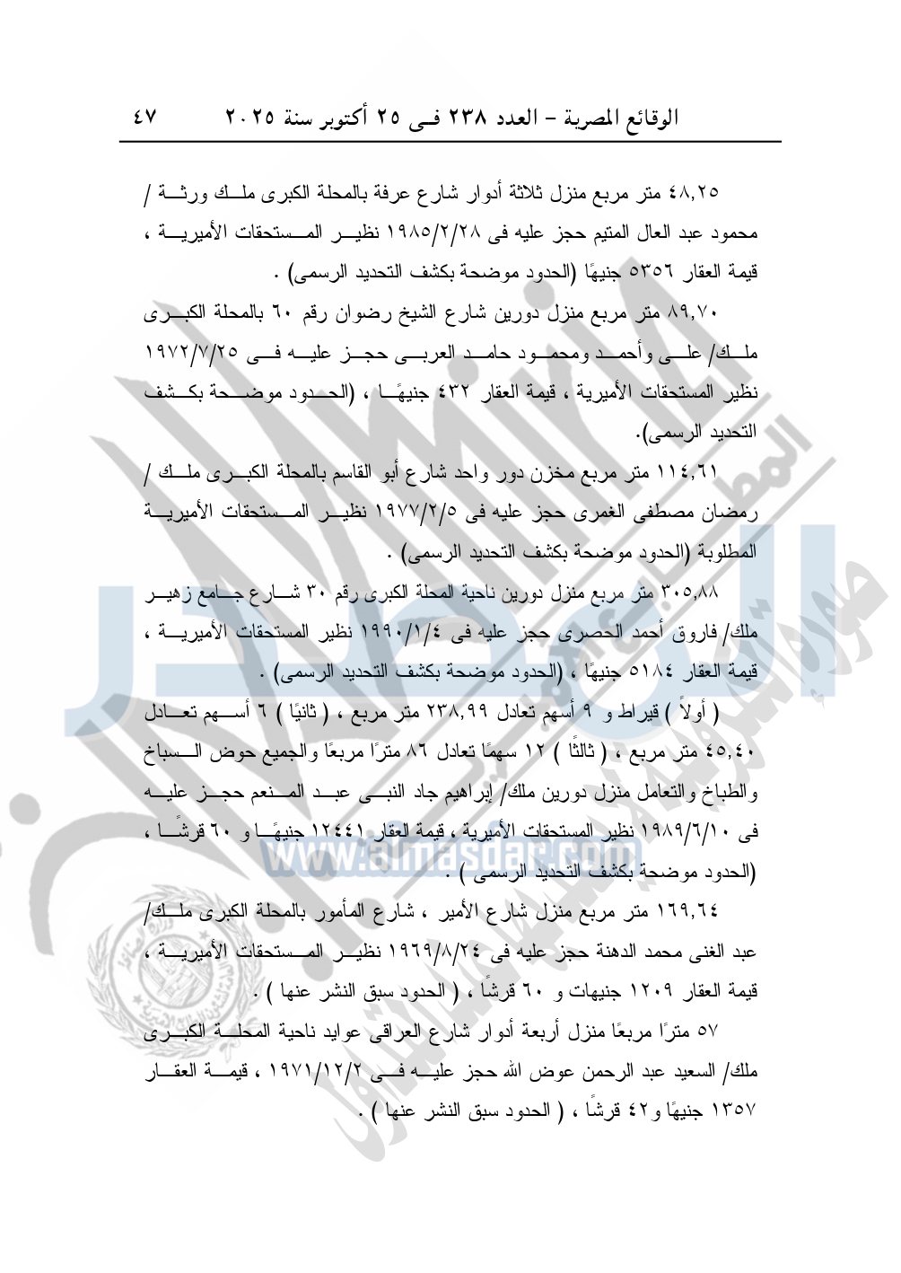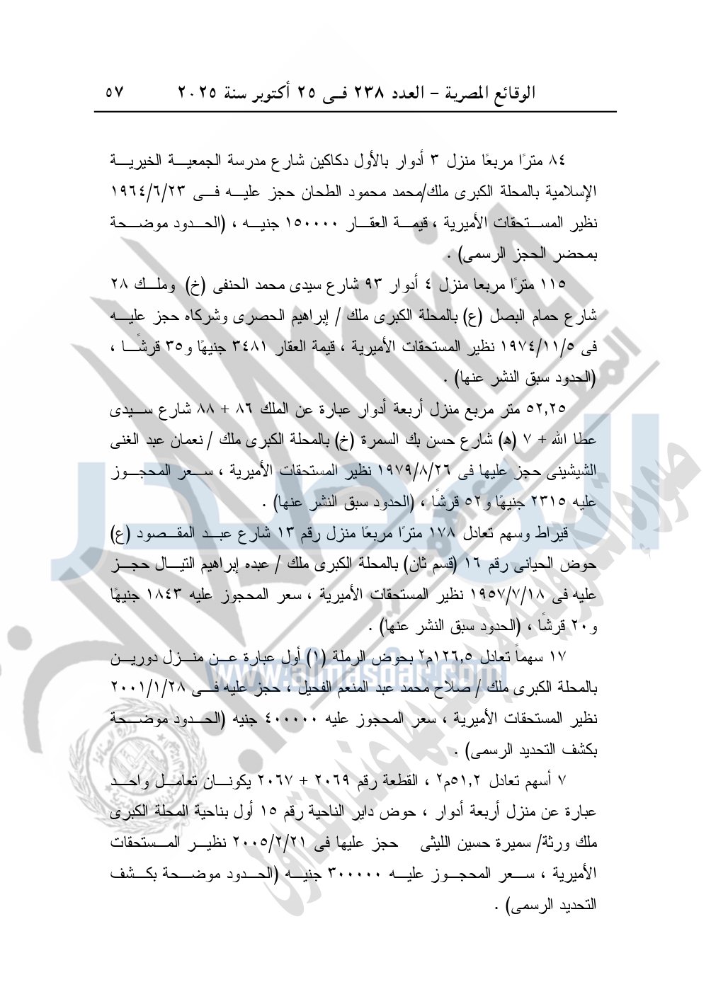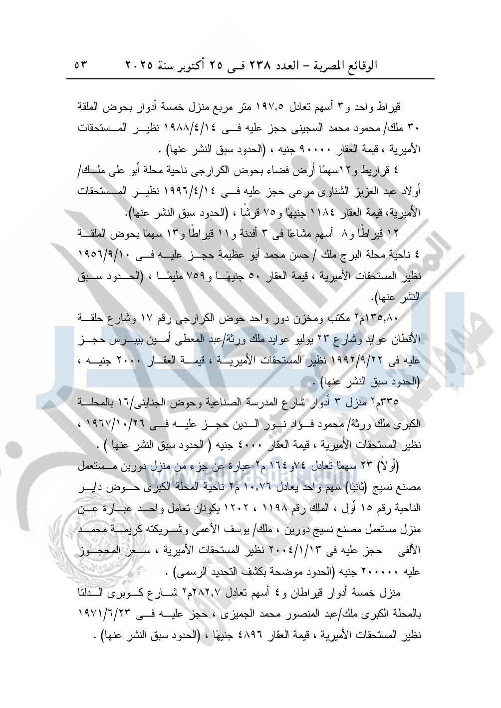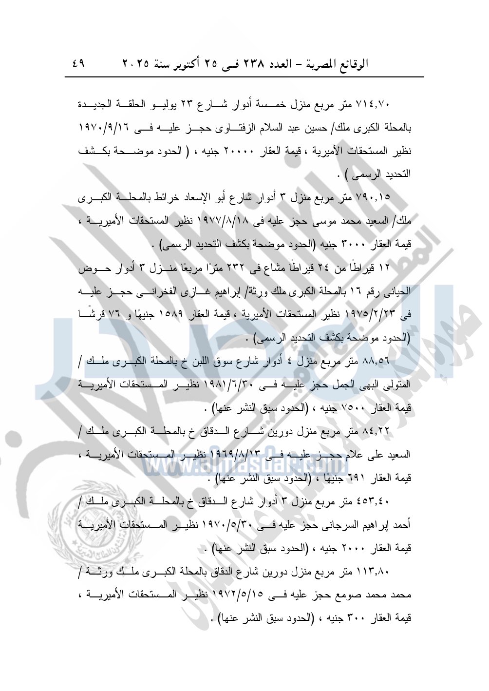 193 متر مربع منزل دور واحد مبنى بالطوب الأحمر شارع الجيش رقم 2 خ بالمحلة ملك ورثة محمـود أمـين هاشم حجز عليـه في 26-10-1994 نظير المستحقات الأميرية، قيمة العقار 50000 جنيه "الحدود موضحة بكشف التحديد الرسمي".