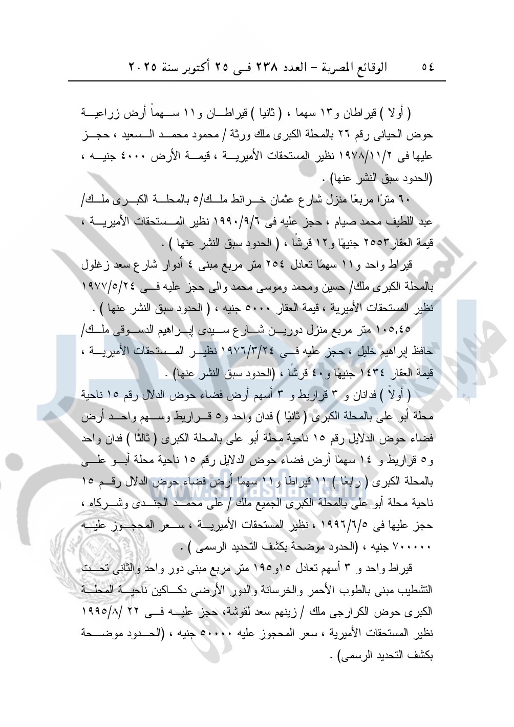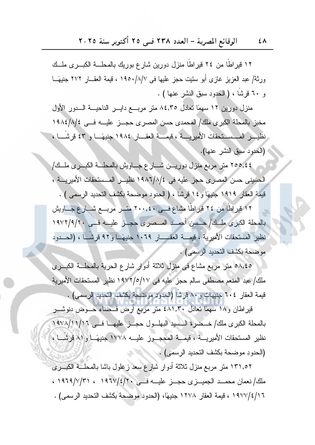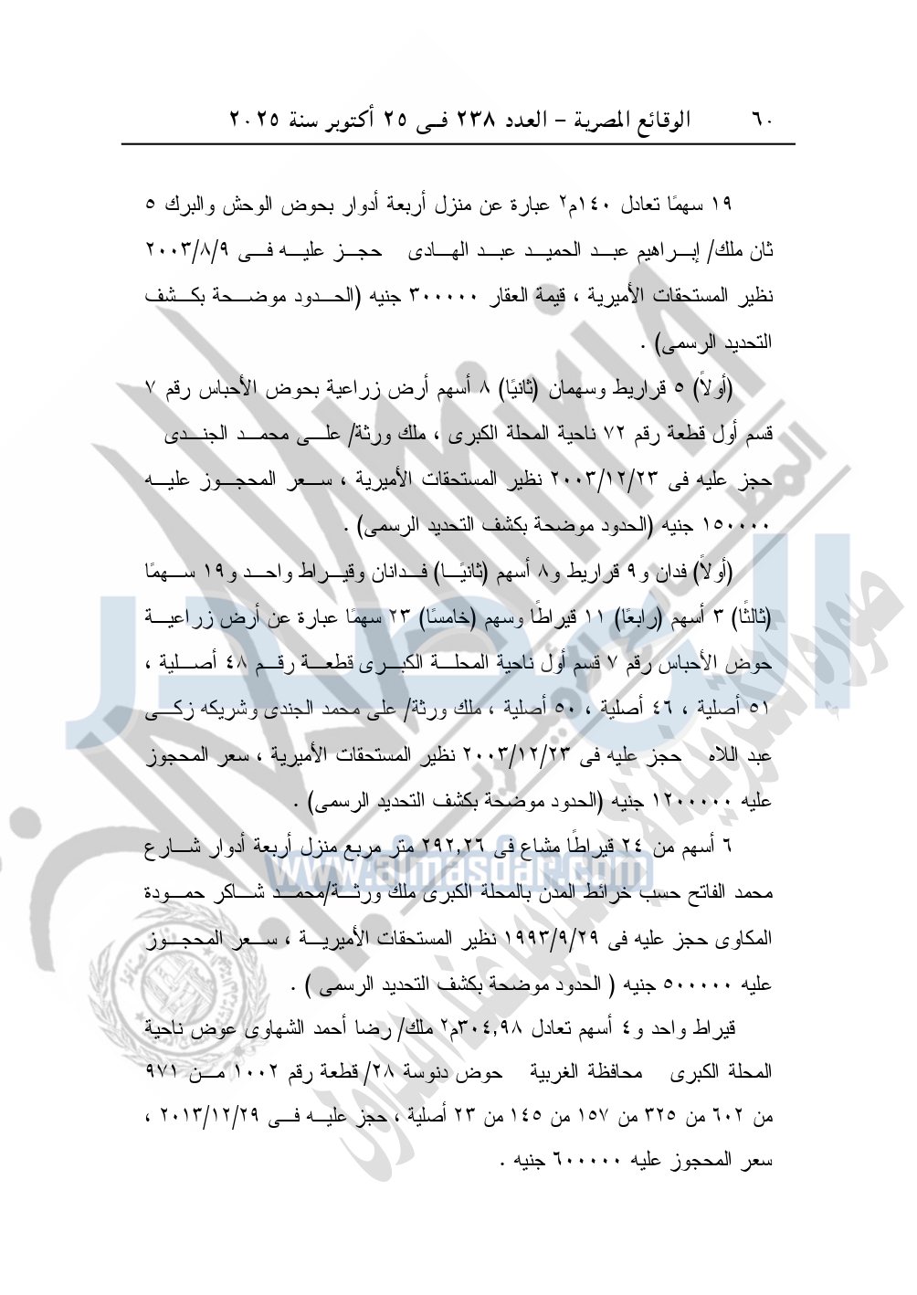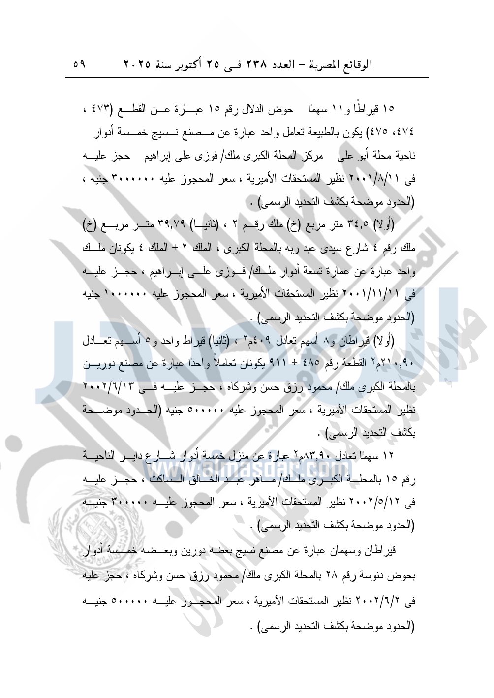 قیراط و14 سهما تعادل 249.70 متر مربع، منزل أربعة أدوار حوض الحياني 16 ناحية ثان المحلة ملك ورثة حسـن محمود والي وشركاه حجز عليـه في 17-6-1994 نظير المستحقات الأميرية، سعر المحجوز عليه 200000 جنيه، "الحدود موضحة بكشف التحديد الرسمي".