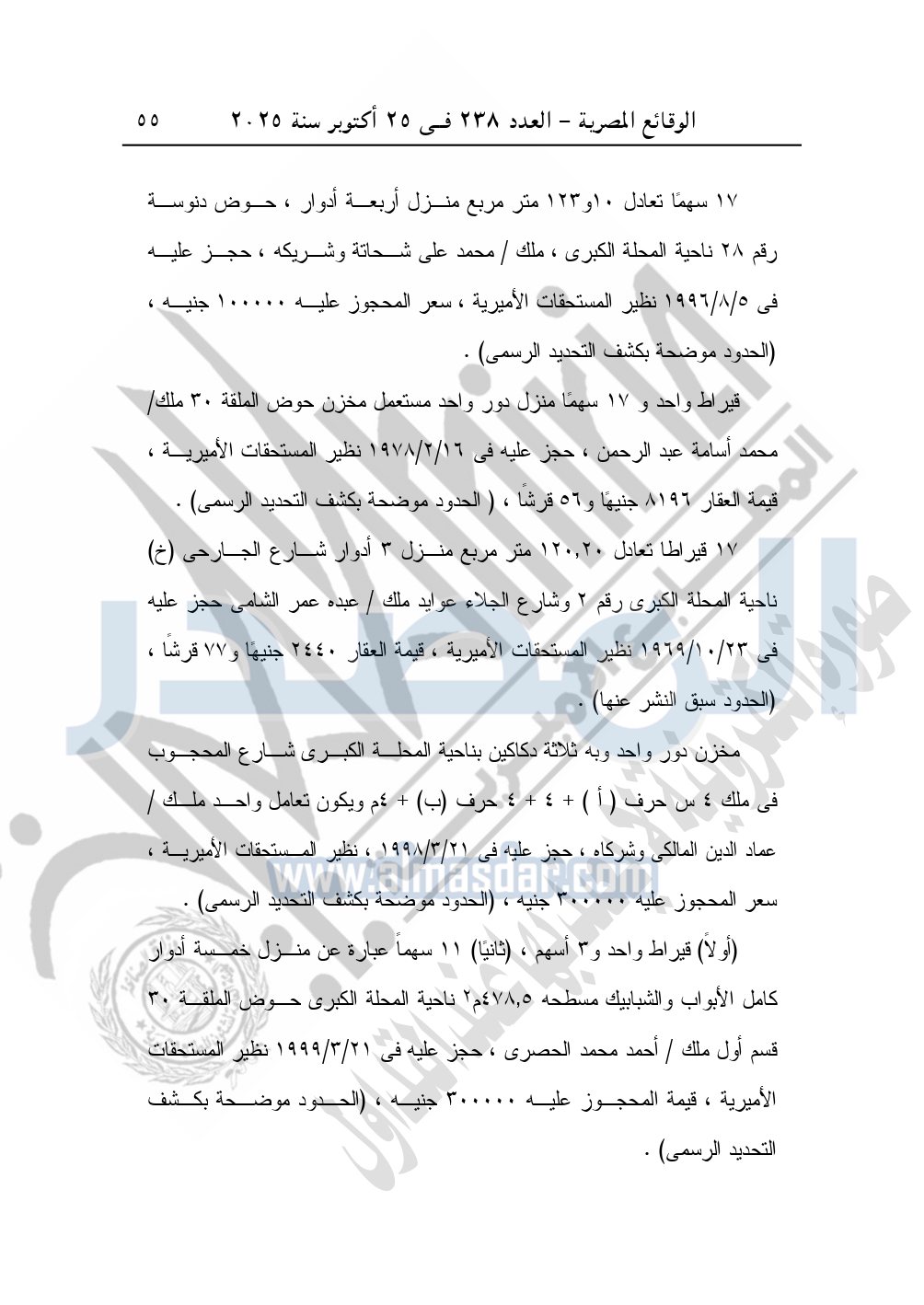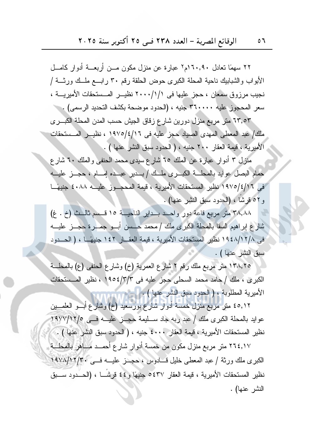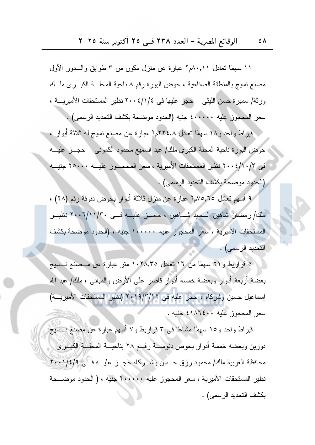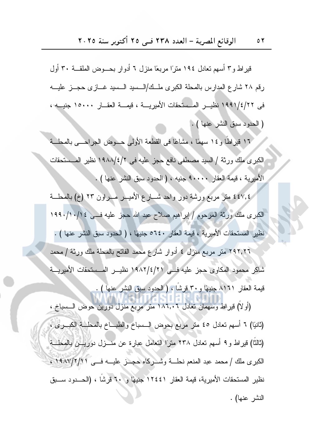 قیراط و14 سهما تعادل 249.70 متر مربع، منزل أربعة أدوار حوض الحياني 16 ناحية ثان المحلة ملك ورثة حسـن محمود والي وشركاه حجز عليـه في 17-6-1994 نظير المستحقات الأميرية، سعر المحجوز عليه 200000 جنيه، "الحدود موضحة بكشف التحديد الرسمي".