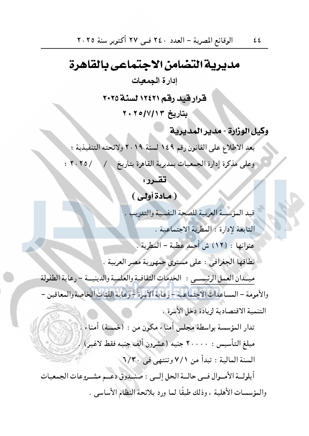 كما نشرت الوقائع المصرية في العدد 240، بتاريخ 27 أكتوبر 2025، قرار مديرية التضامن الاجتماعي بالقاهرة، قيد رقم 12421 لسنة 2025، بتاريخ 13-7-2025، بشأن قيد المؤسسة العربية للصحة النفسية والتدريب.