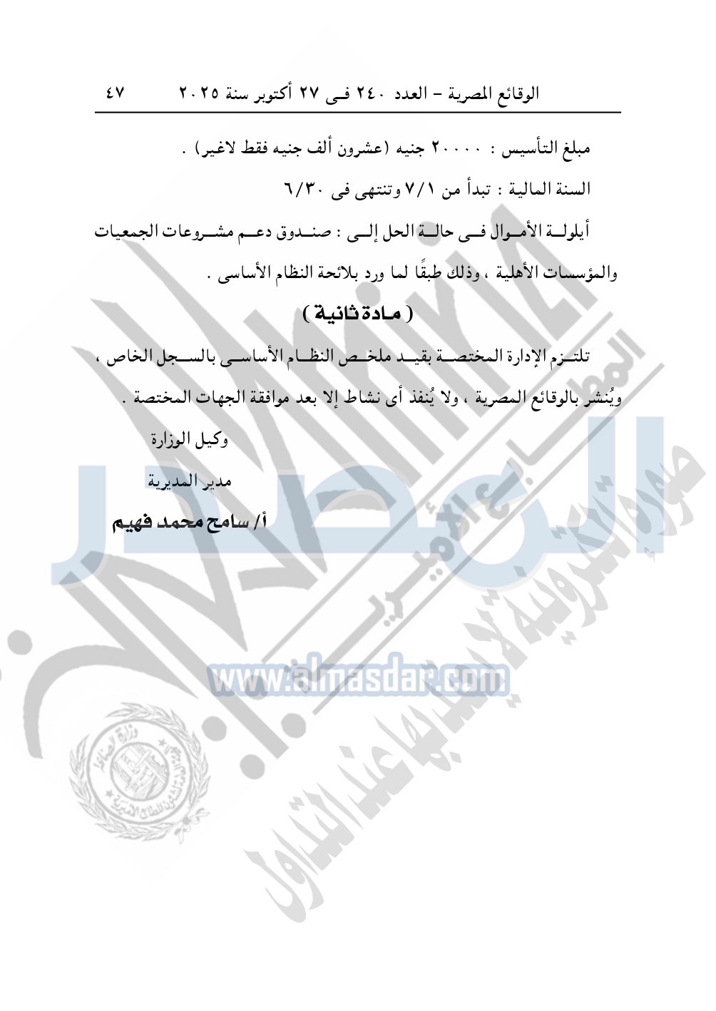 وأيضا نشرت الوقائع المصرية في العدد 240، بتاريخ 27 أكتوبر 2025، قرار مديرية التضامن الاجتماعي بالقاهرة، قيد رقم 12454 لسنة 2025، بتاريخ 27-7-2025، بشأن قيد مؤسسة السور كريستين للتنمية والأعمال الخيرية.