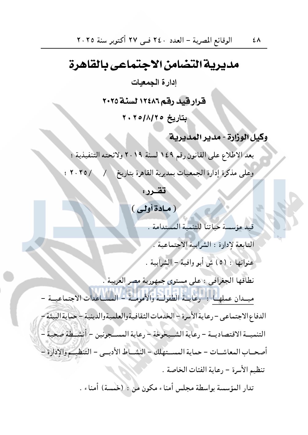 ونشرت الوقائع المصرية في العدد 240، بتاريخ 27 أكتوبر 2025، قرار مديرية التضامن الاجتماعي بالقاهرة، قيد رقم 12486 لسنة 2025، بتاريخ 25-8-2025، بشأن قيد مؤسسة حياتنا للتنمية المستدامة.
