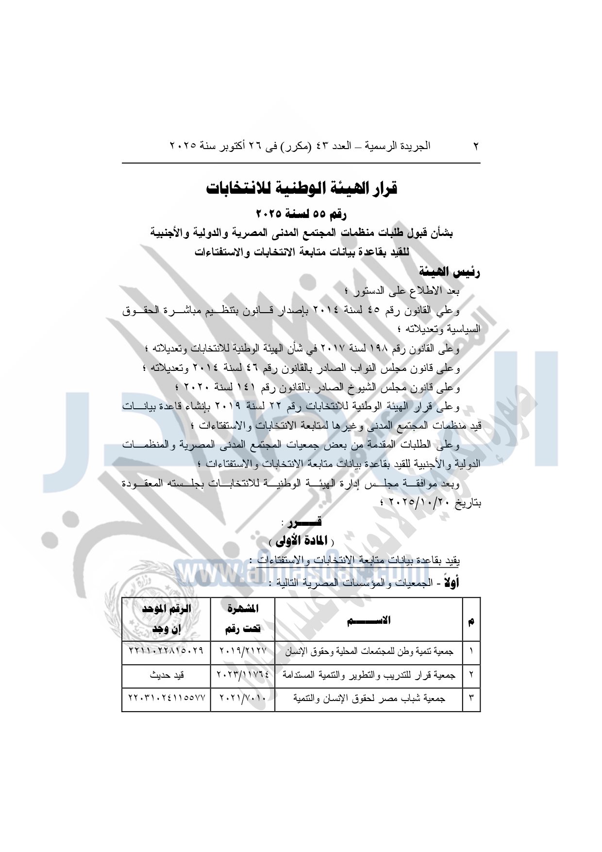 وأضافت الجريدة الرسمية، أن القرار جاء بعد الاطلاع أيضا على قرار الهيئة الوطنية للانتخابات رقم 22 لسنة 2019 بإنشاء قاعدة بيانات قيد منظمات المجتمع المدنى وغيرها لمتابعة الانتخابات والاستفتاءات؛ وعلى الطلبات المقدمة من بعض جمعيات المجتمع المدنى المصرية والمنظمات الدولية والأجنبية للقيد بقاعدة بيانات متابعة الانتخابات والاستفتاءات؛ وبعد موافقة مجلس إدارة الهيئة الوطنية للانتخابات بجلسته المعقودة بتاريخ 20-10-2025.