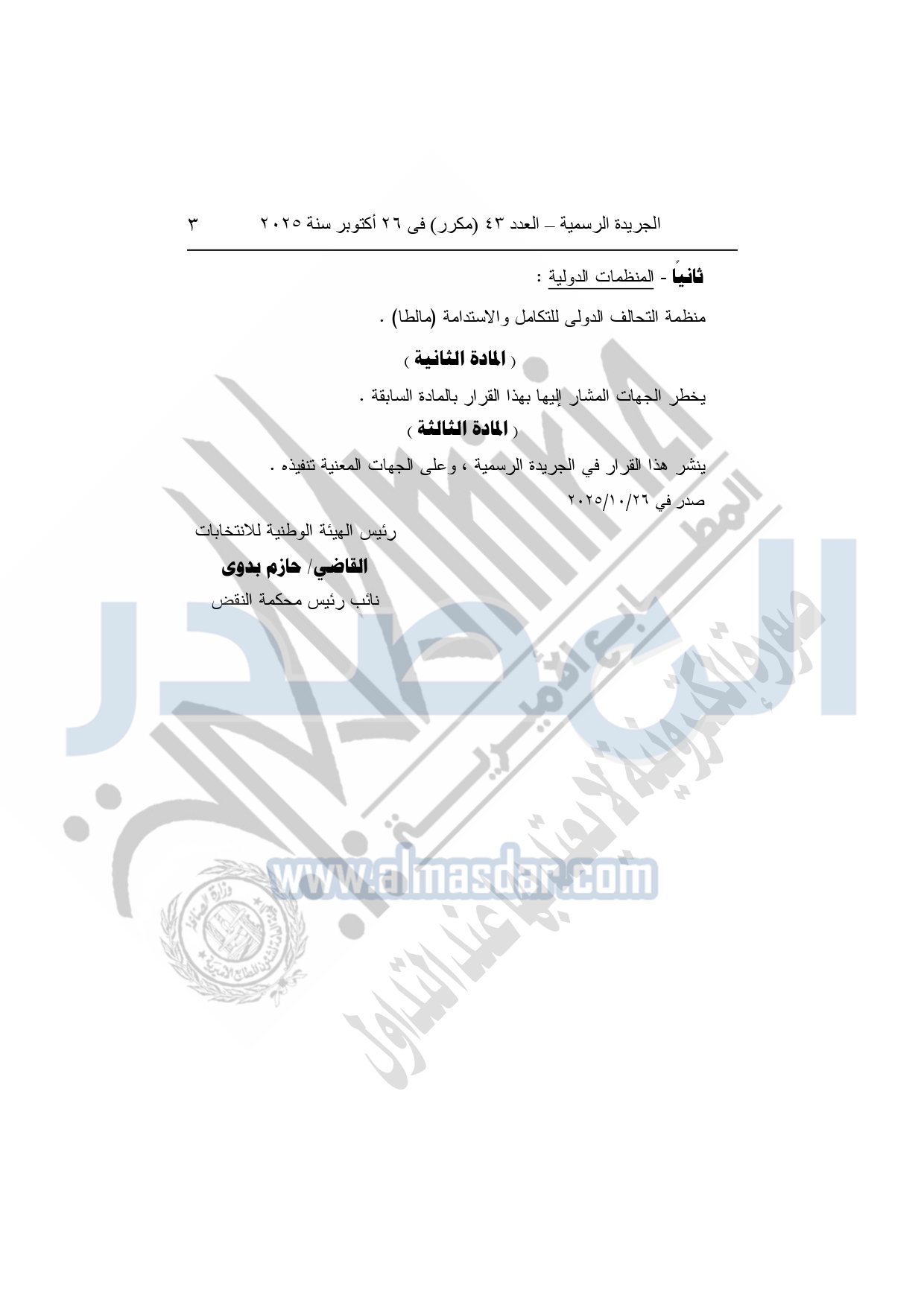 نشرت الجريدة الرسمية في العدد 43 "مكرر"، بتاريخ 26 أكتوبر 2025، قرار الهيئة الوطنية للانتخابات، رقم 55 لسنة 2025، بشأن قبول طلبات منظمات المجتمع المدنى المصرية والدولية والأجنبية للقيد بقاعدة بيانات متابعة الانتخابات والاستفتاءات.