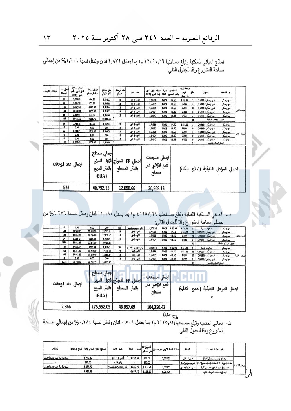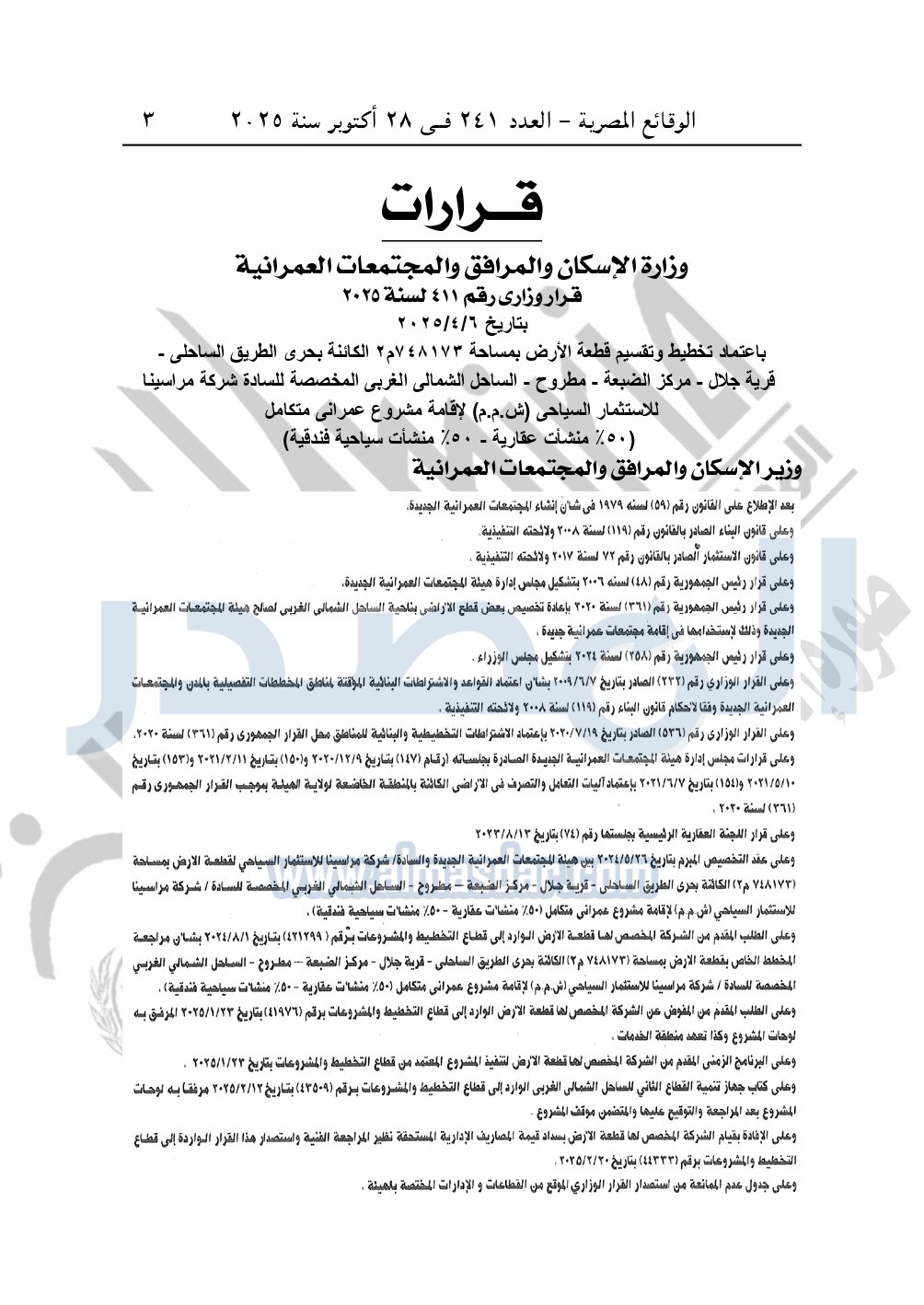 نشرت الوقائع المصرية في العدد 241، بتاريخ 28 أكتوبر 2025، قرار وزارة الإسكان والمرافق والمجتمعات العمرانية، رقم 411 لسنة 2025، بتاريخ 4-6-2025، بشأن اعتماد تخطيط وتقسيم قطعة أرض الكائنة بحرى الطريق الساحلي - قرية جلال - مركز الضبعة - مطروح - الساحل الشمالي الغربي المخصصة لـ شركة مراسينا للاستثمار السياحي لإقامة مشروع عمراني متكامل.