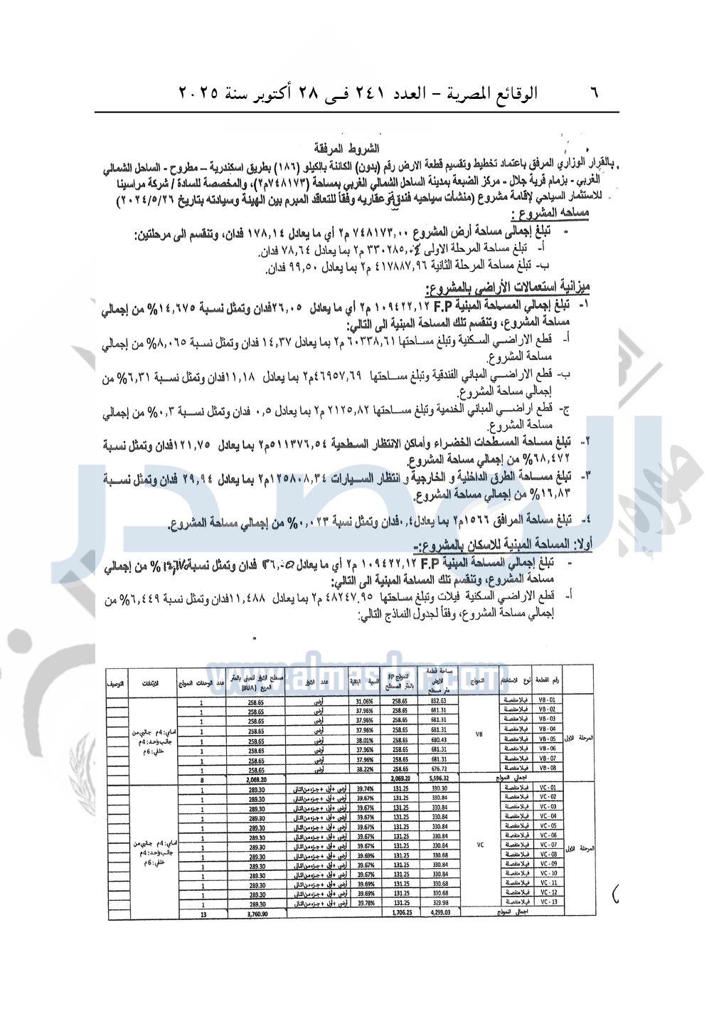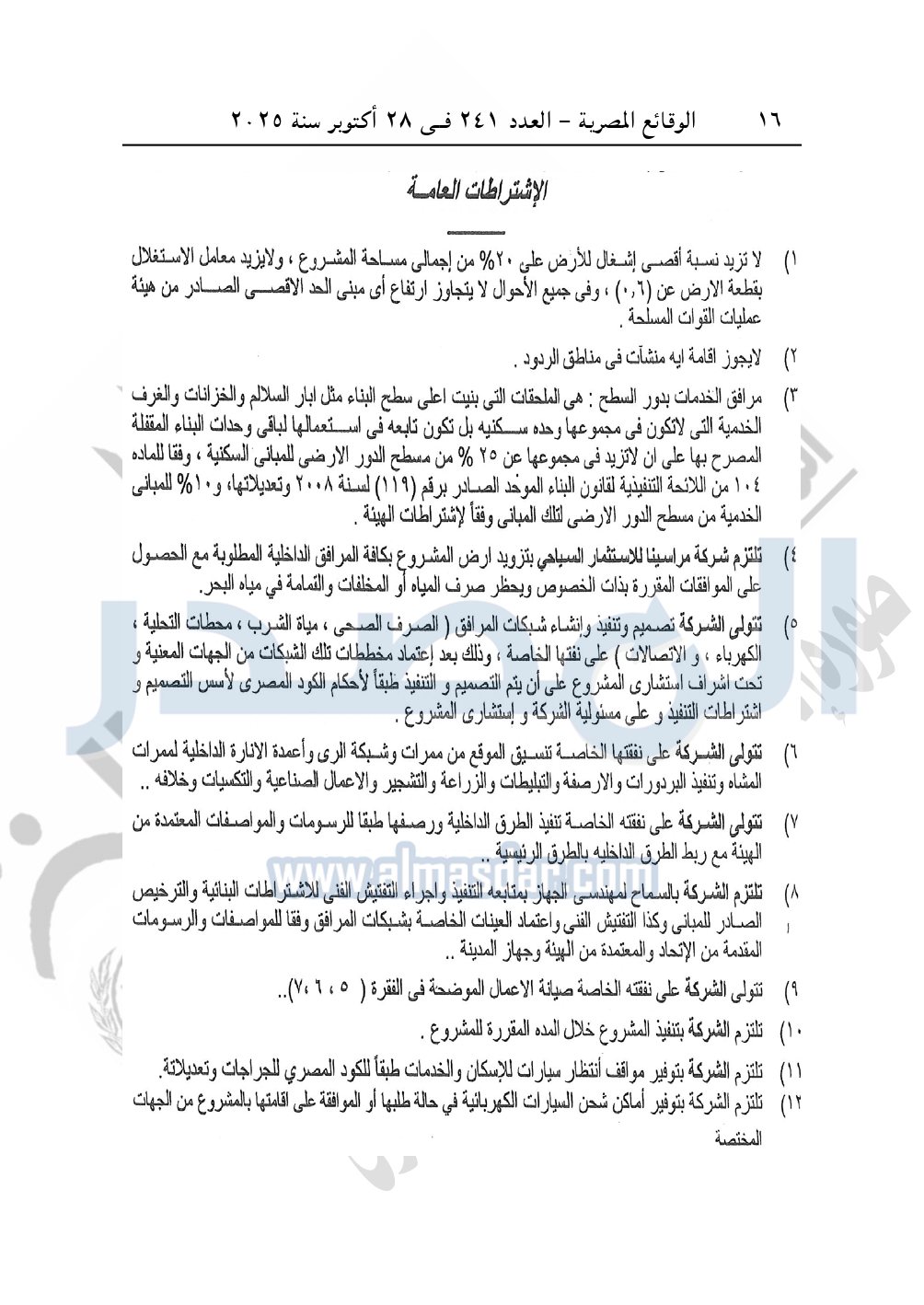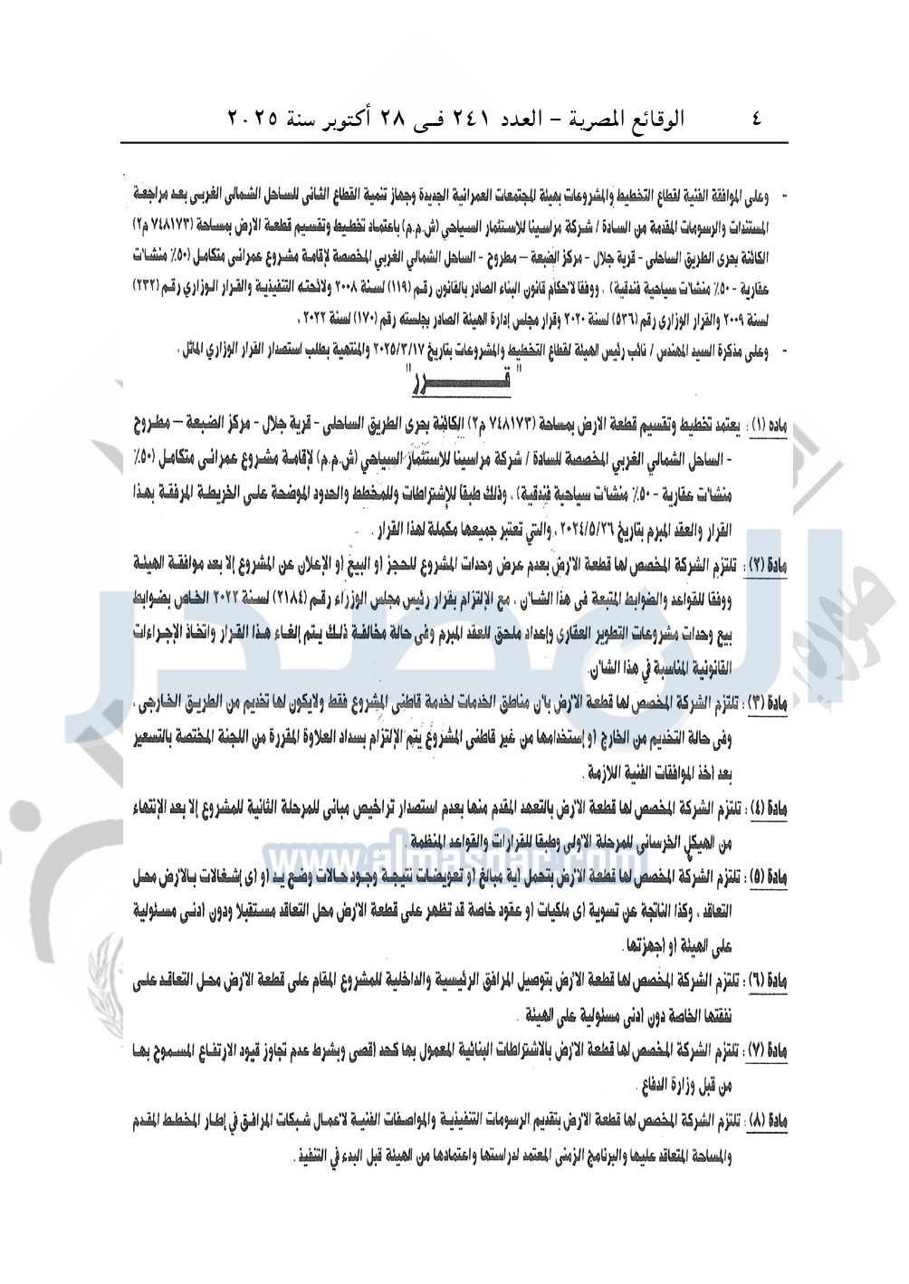 يعتمد تخطيط وتقسيم قطعة الأرض بمساحة 748173م2 الكائنة بحرى الطريق الساحلي - قرية جلال - مركز الضبعة - مطروح - الساحل الشمالي الغربي المخصصة لـ شركة مراسينا للاستثمار السياحي "ش.م.م" لإقامة مشروع عمراني متكامل "50% منشأت عقارية – 50% منشآت سياحية فندقية"، وذلك طبقا للإشتراطات وللمخطط والحدود الموضحة على الخريطة المرفقة بهذا القرار والعقد المبرم بتاريخ 26-5-2024، والتي تعتبر جميعها مكملة لهذا القرار.