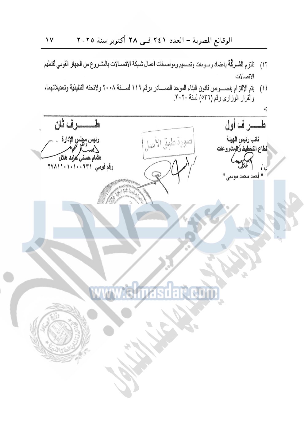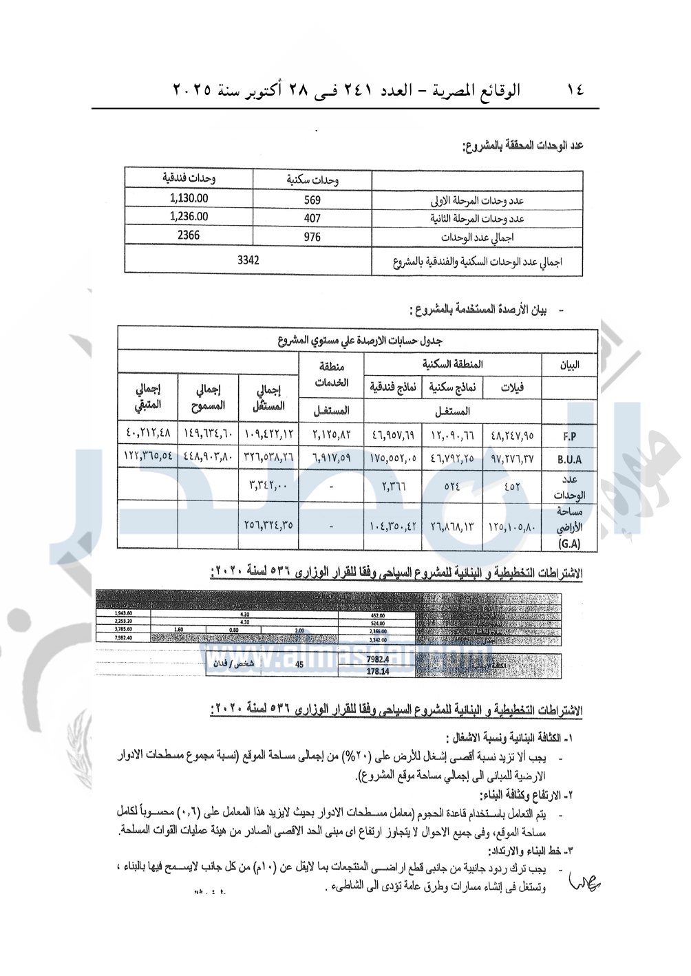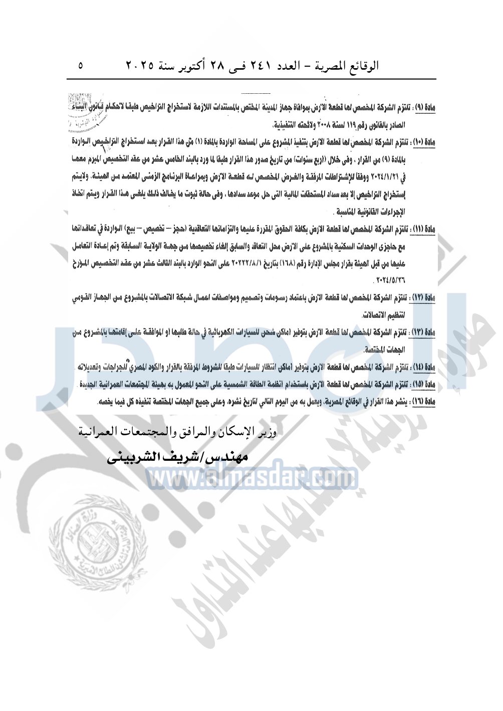 يعتمد تخطيط وتقسيم قطعة الأرض بمساحة 748173م2 الكائنة بحرى الطريق الساحلي - قرية جلال - مركز الضبعة - مطروح - الساحل الشمالي الغربي المخصصة لـ شركة مراسينا للاستثمار السياحي "ش.م.م" لإقامة مشروع عمراني متكامل "50% منشأت عقارية – 50% منشآت سياحية فندقية"، وذلك طبقا للإشتراطات وللمخطط والحدود الموضحة على الخريطة المرفقة بهذا القرار والعقد المبرم بتاريخ 26-5-2024، والتي تعتبر جميعها مكملة لهذا القرار.