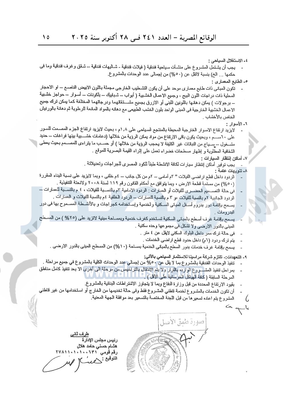 تلتزم الشركة المخصص لها قطعة الأرض بالاشتراطات البنائية المعمول بها كحد اقصى وبشرط عدم تجاوز قيود الارتفاع المسموح بها من قبل وزارة الدفاع.